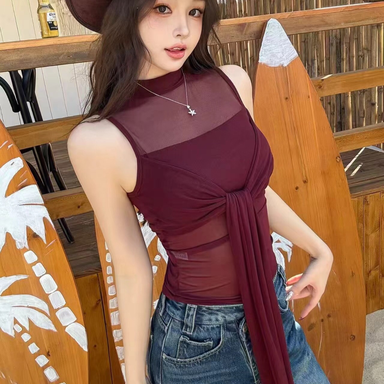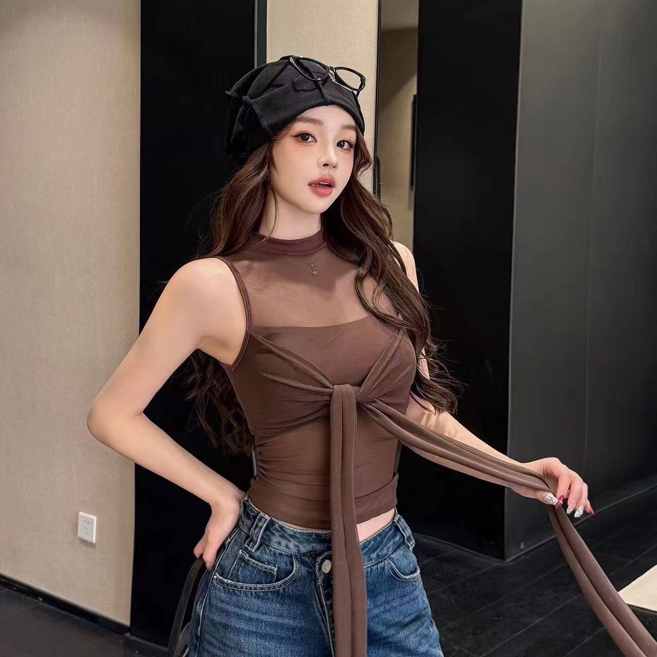 BY11713# 带胸垫纯欲纱网微透吊带背心女春季镂空性感辣妹扭结 服裝批發女裝批發服飾貨源