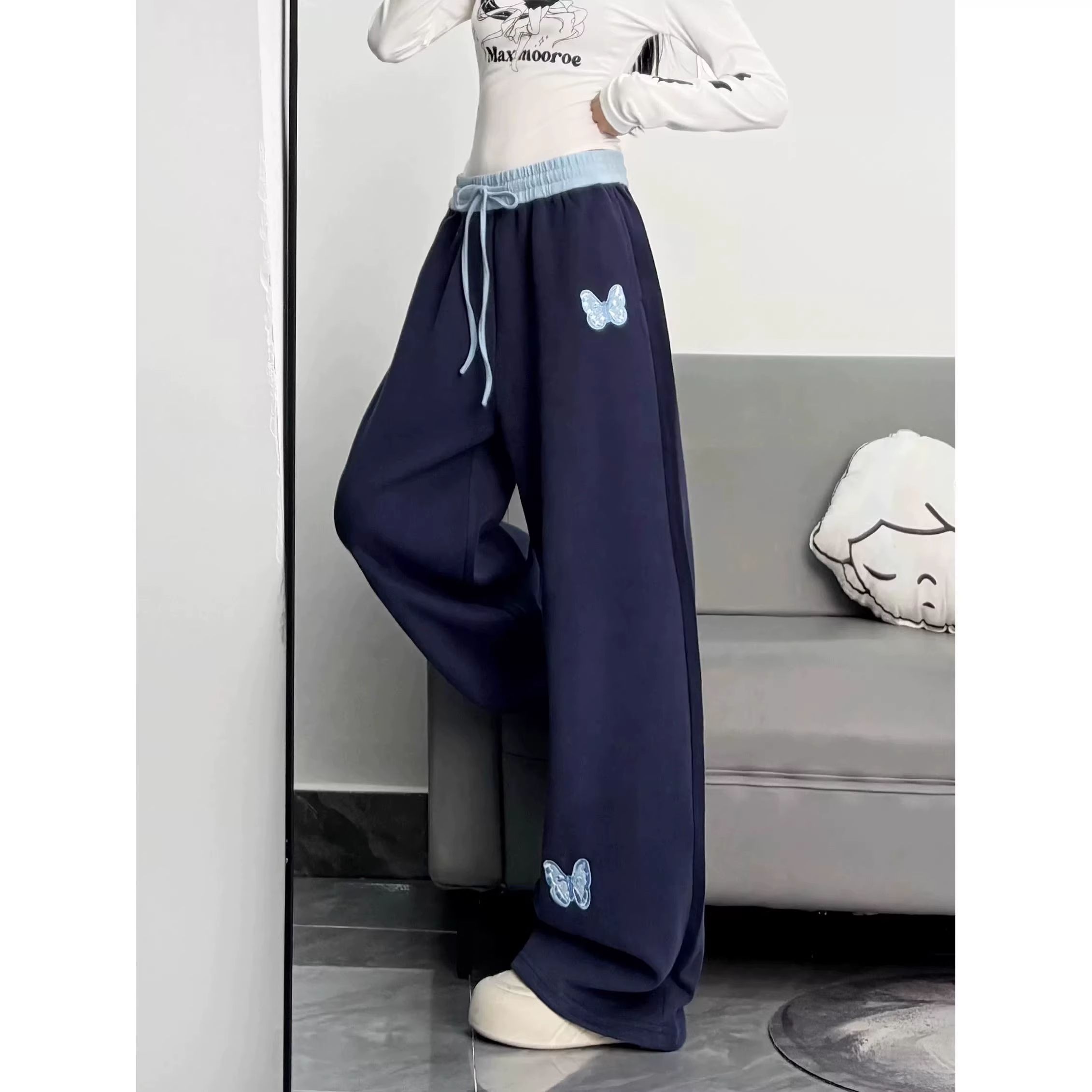 BY11805# 韩女慵懒宝蓝色蝴蝶贴布刺绣休闲裤女加绒宽松阔腿垂感卫裤 服裝批發女裝批發服飾貨源