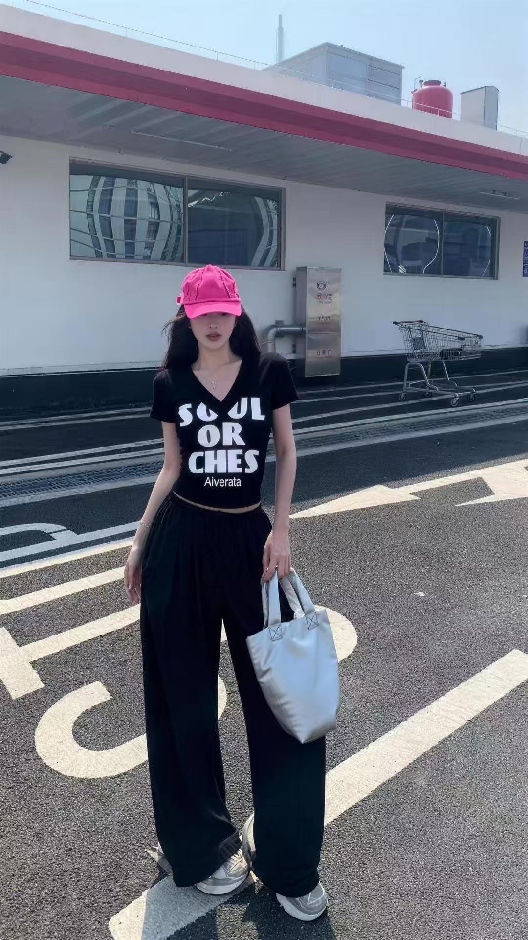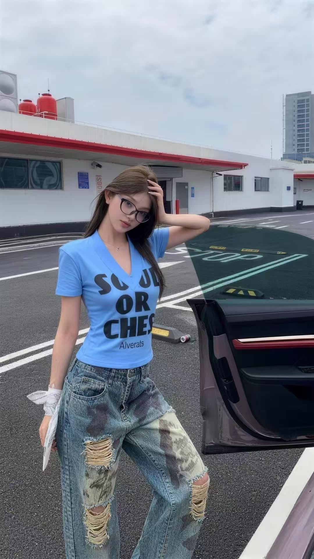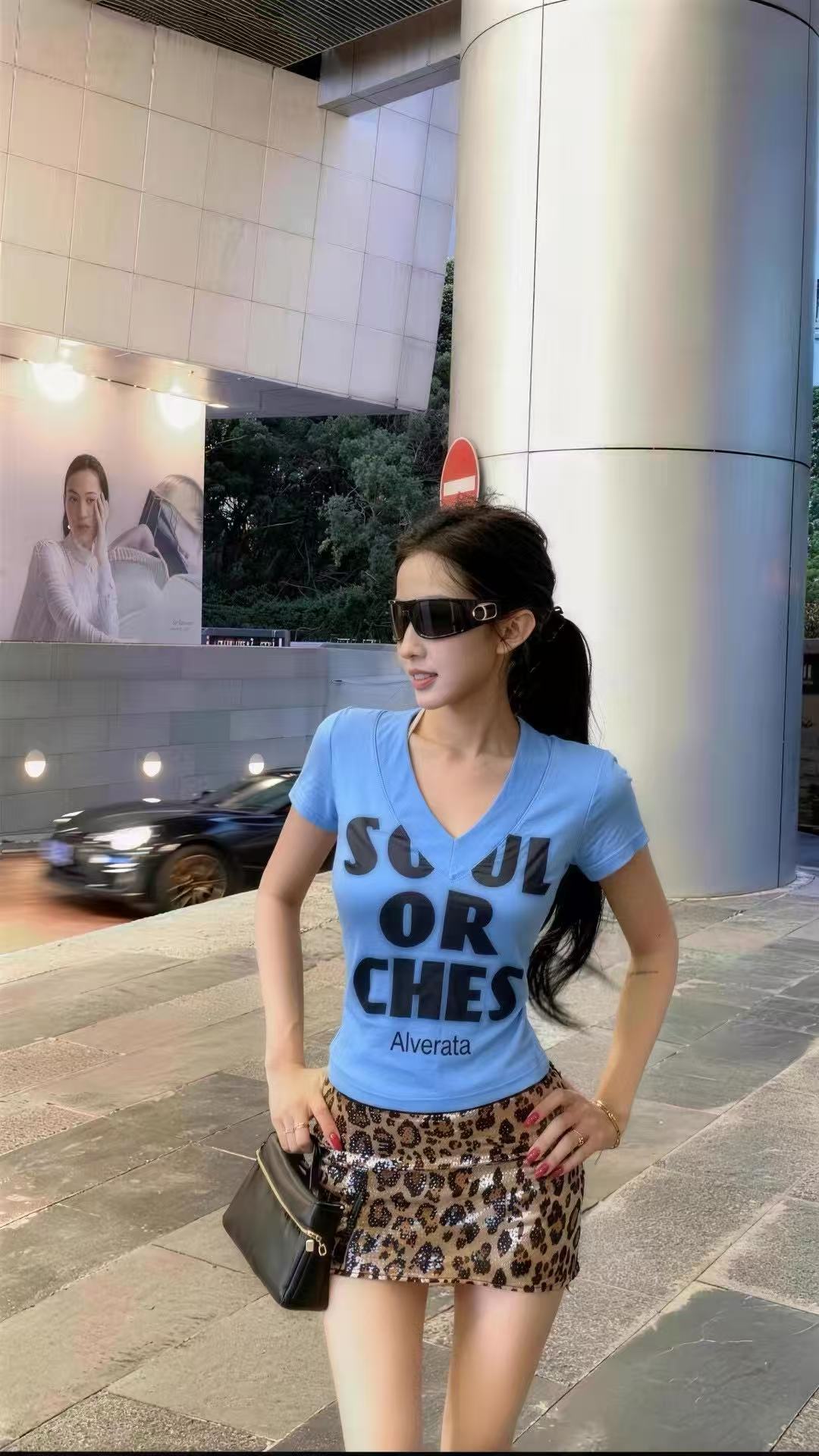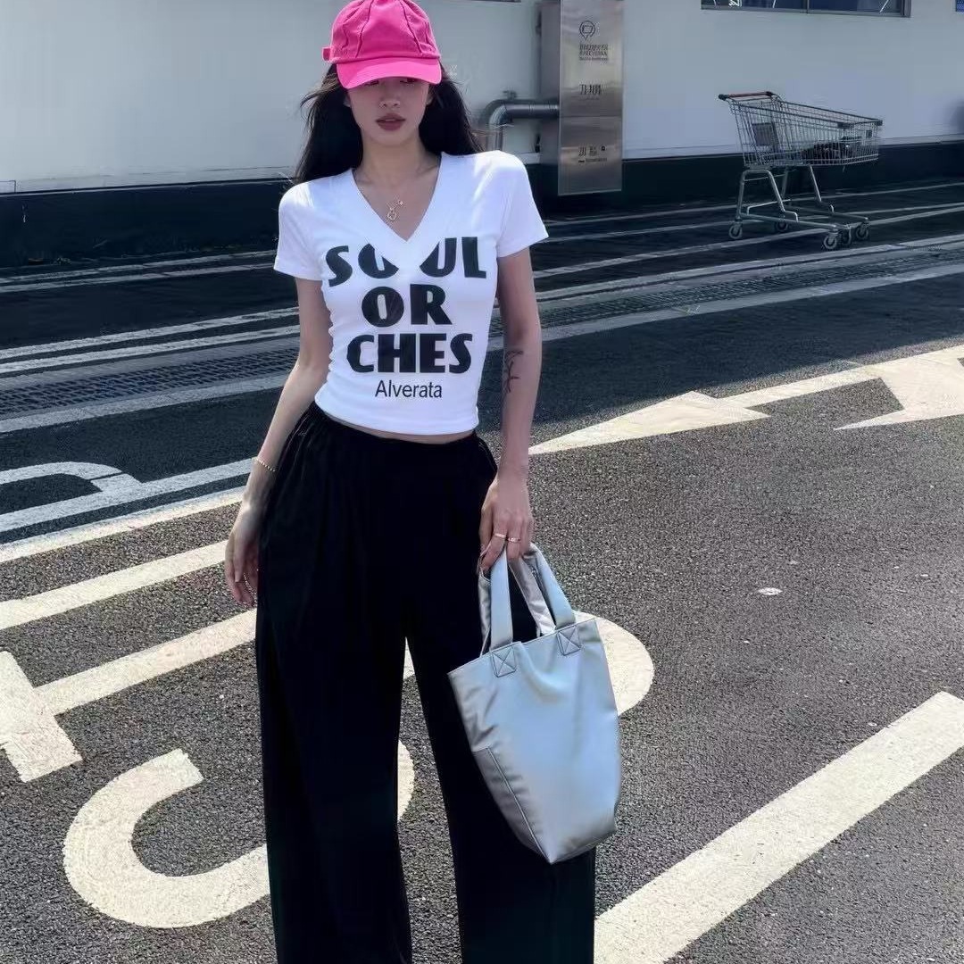 BY11887# 酷辣妹V领字母短款T恤韩日系ootd时尚垫肩春夏新ins潮原版蓝S 服裝批發女裝批發服飾貨源
