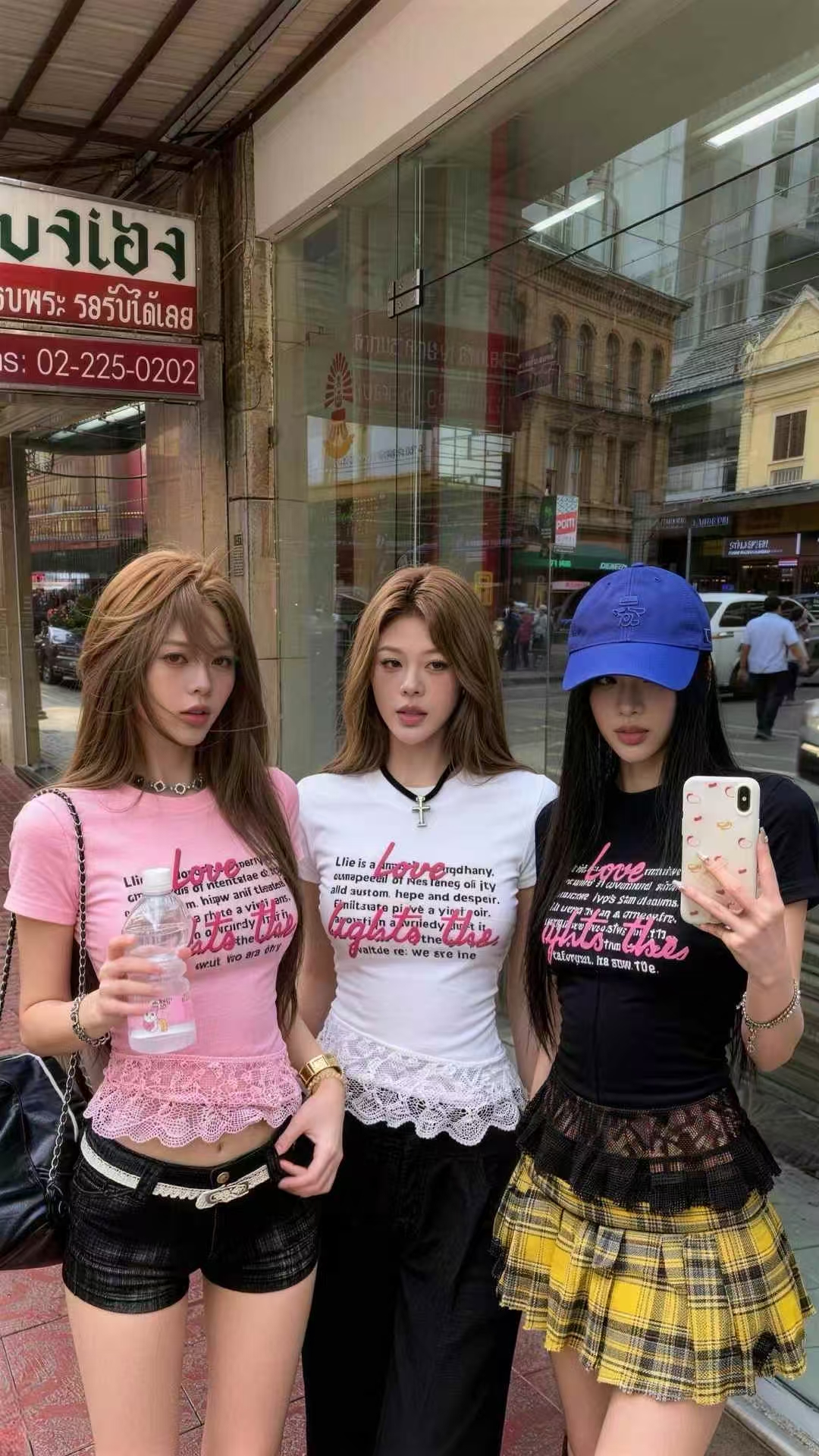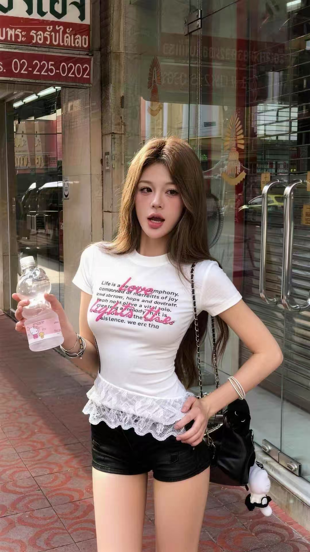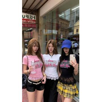 BY11890# 甜辣妹蕾丝拼接纯棉字母春夏新ins潮时尚粉色韩日系ootd嫩T恤 服裝批發女裝批發服飾貨源