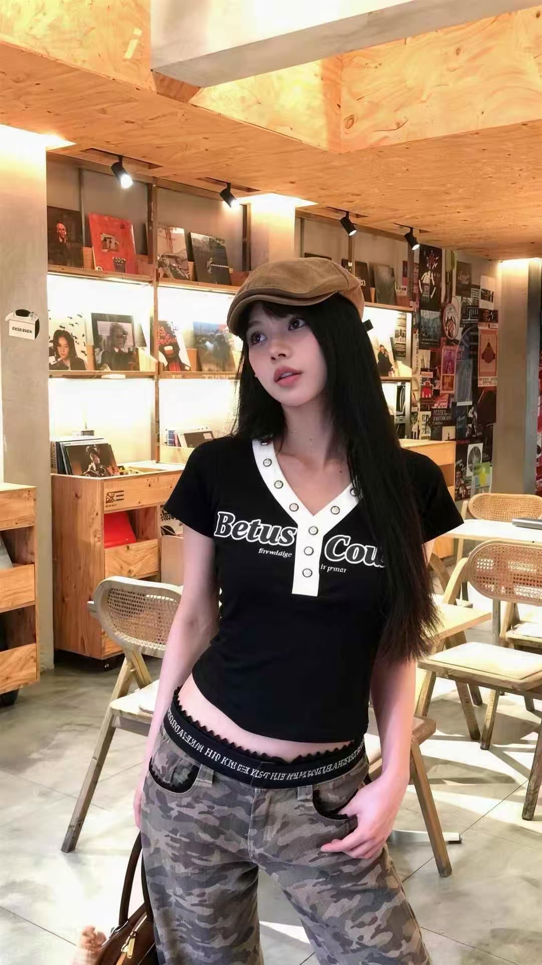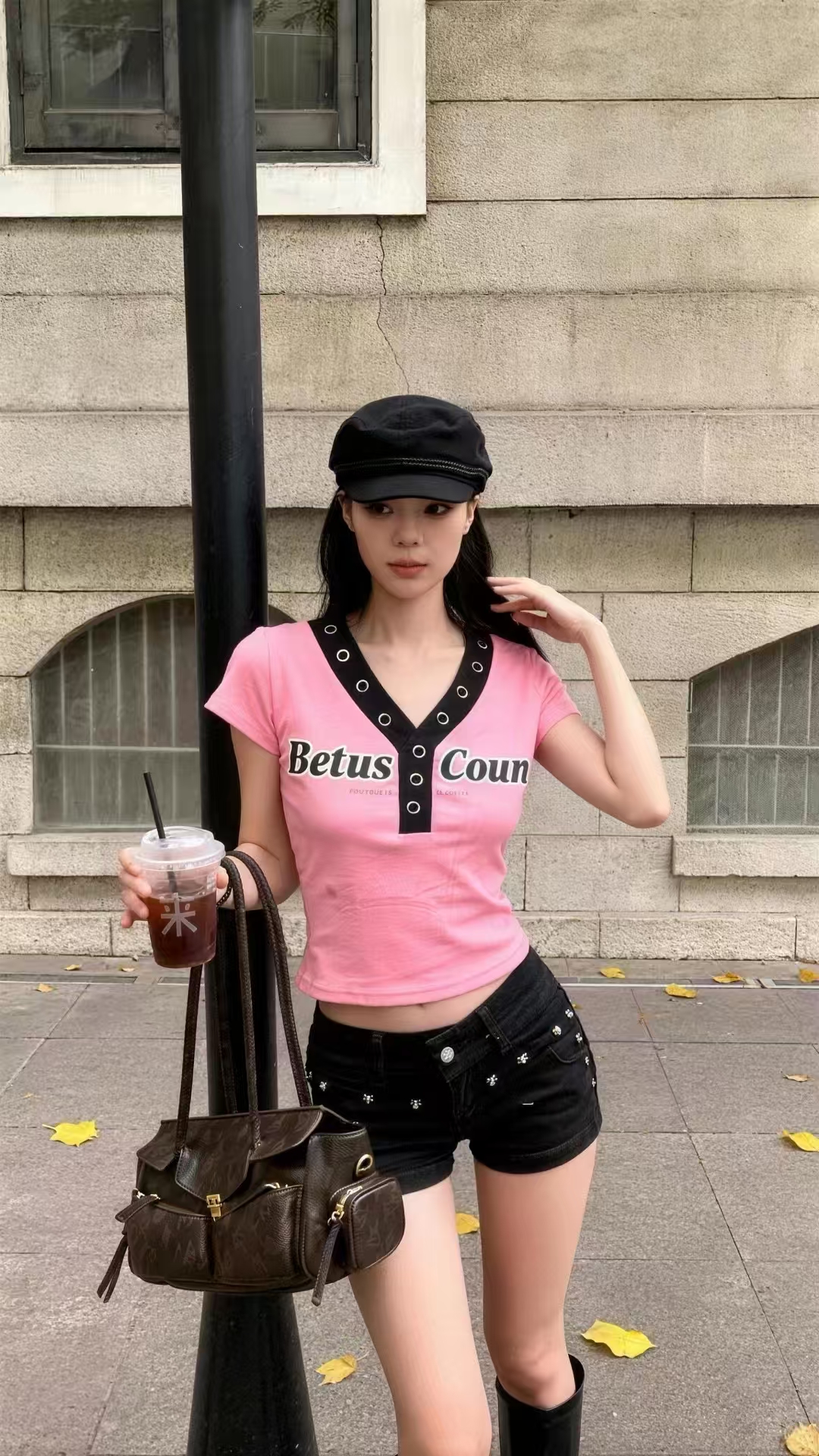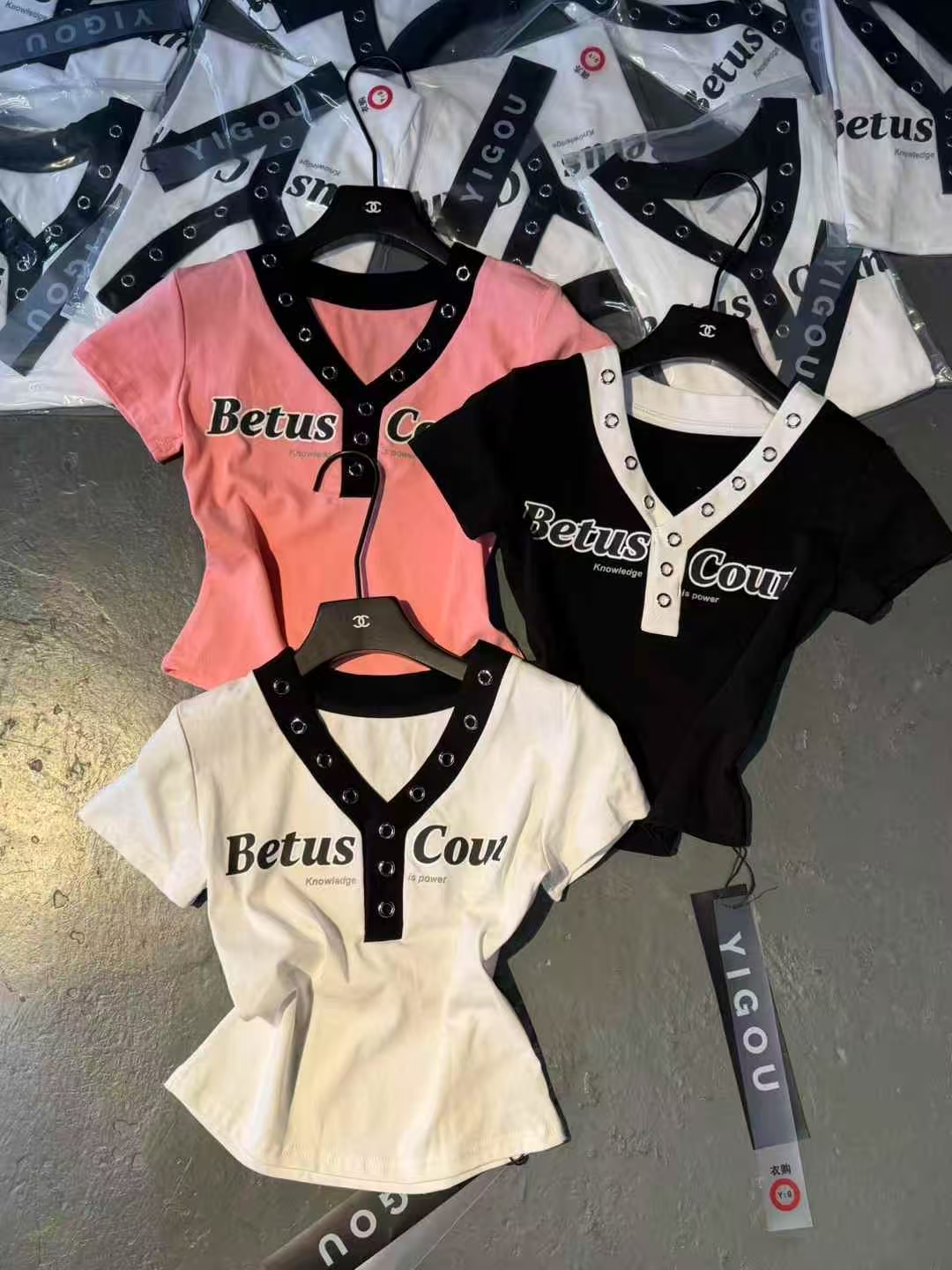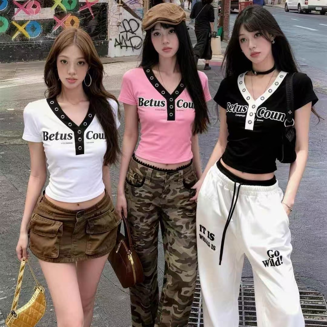 BY11891# 酷辣妹金属铁圈拼撞色春夏新ins潮韩日系ootd显瘦T恤时尚甜美 服裝批發女裝批發服飾貨源