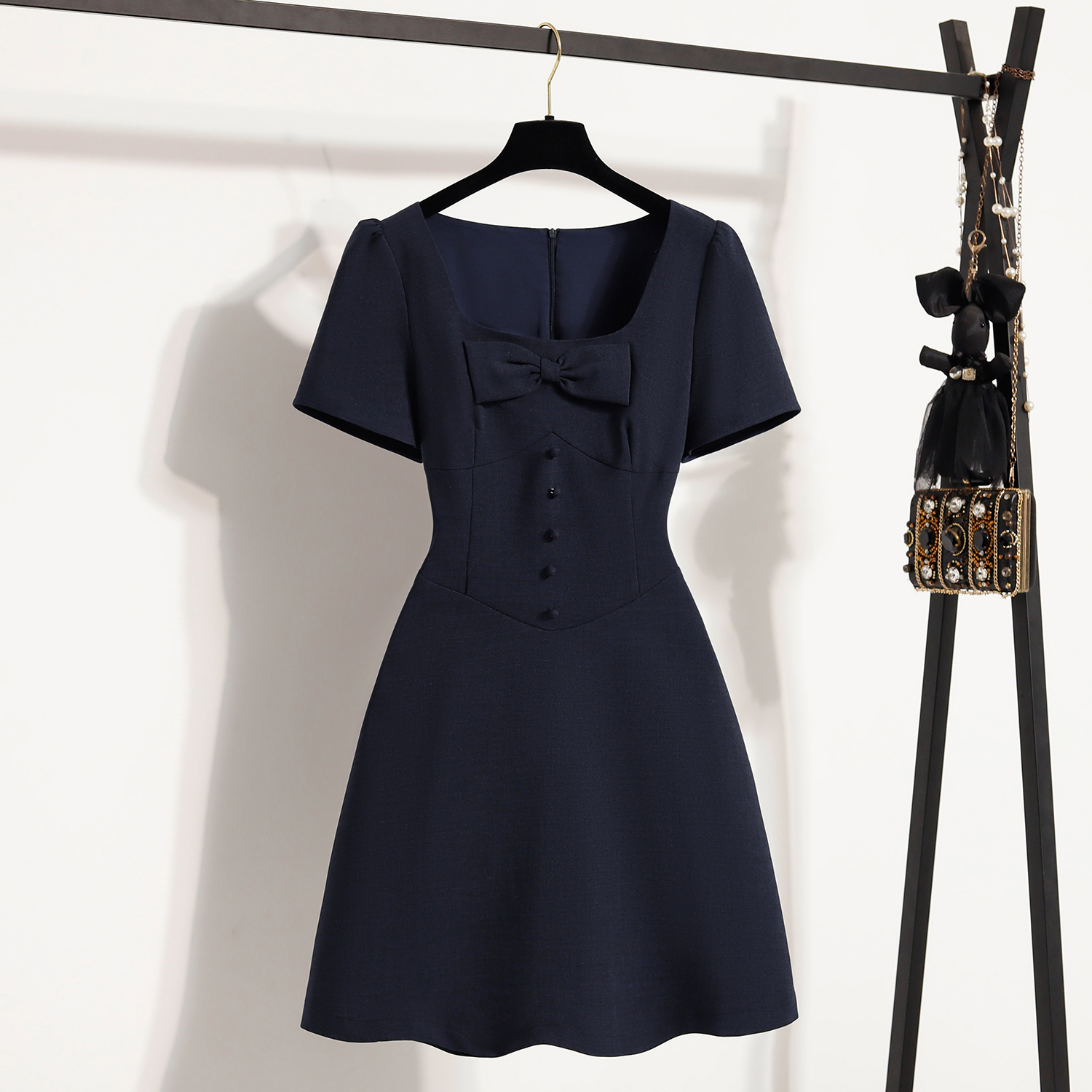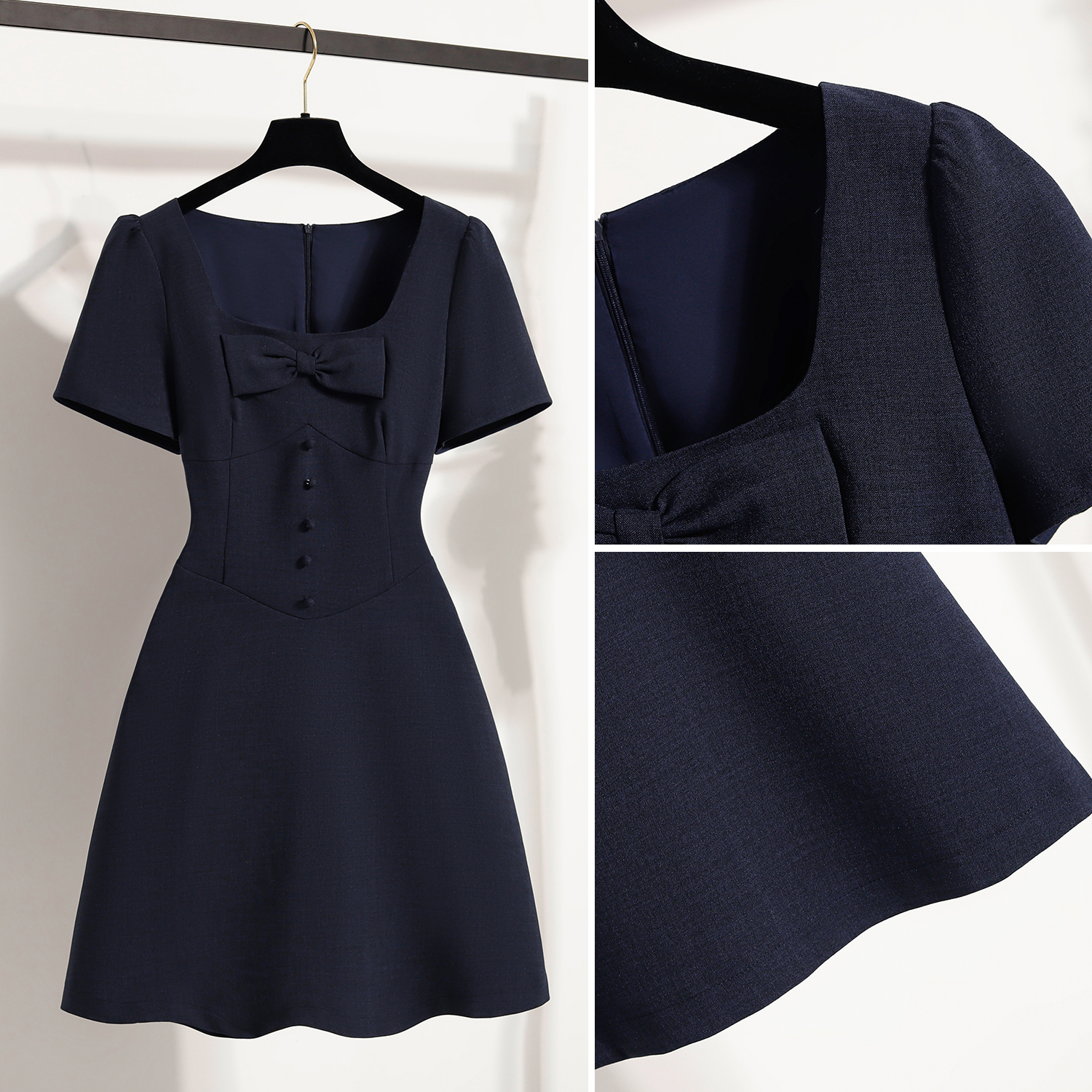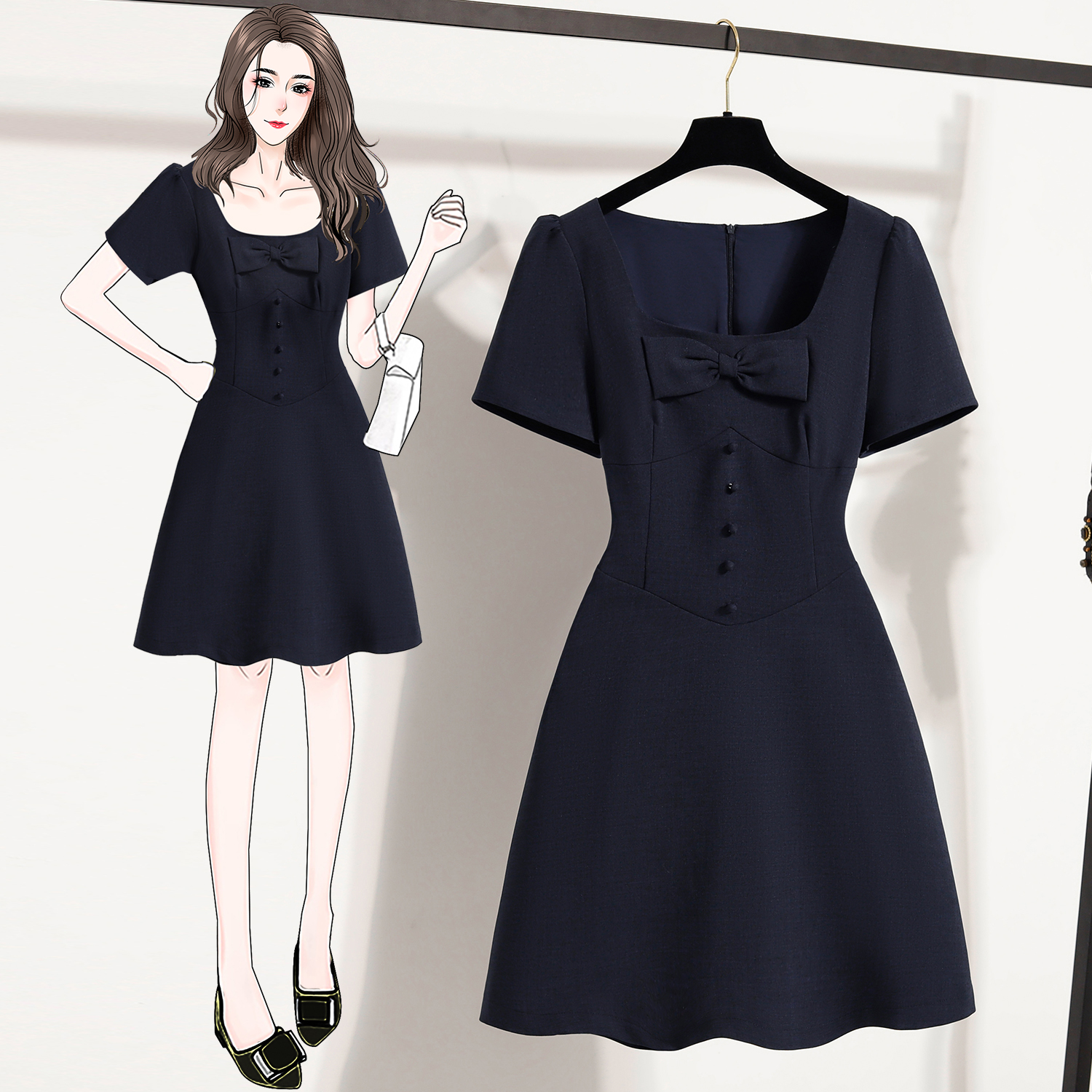 BY11925# 大码女装微胖妹夏季新款法式蝴蝶结收腰显瘦方领连衣裙 服裝批發女裝批發服飾貨源