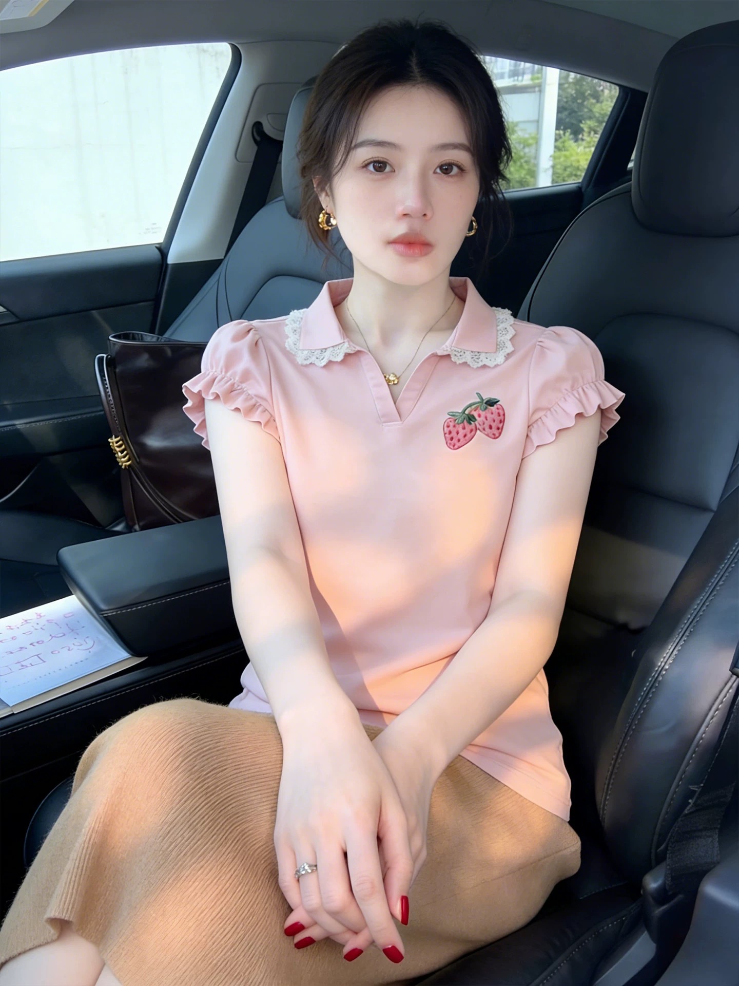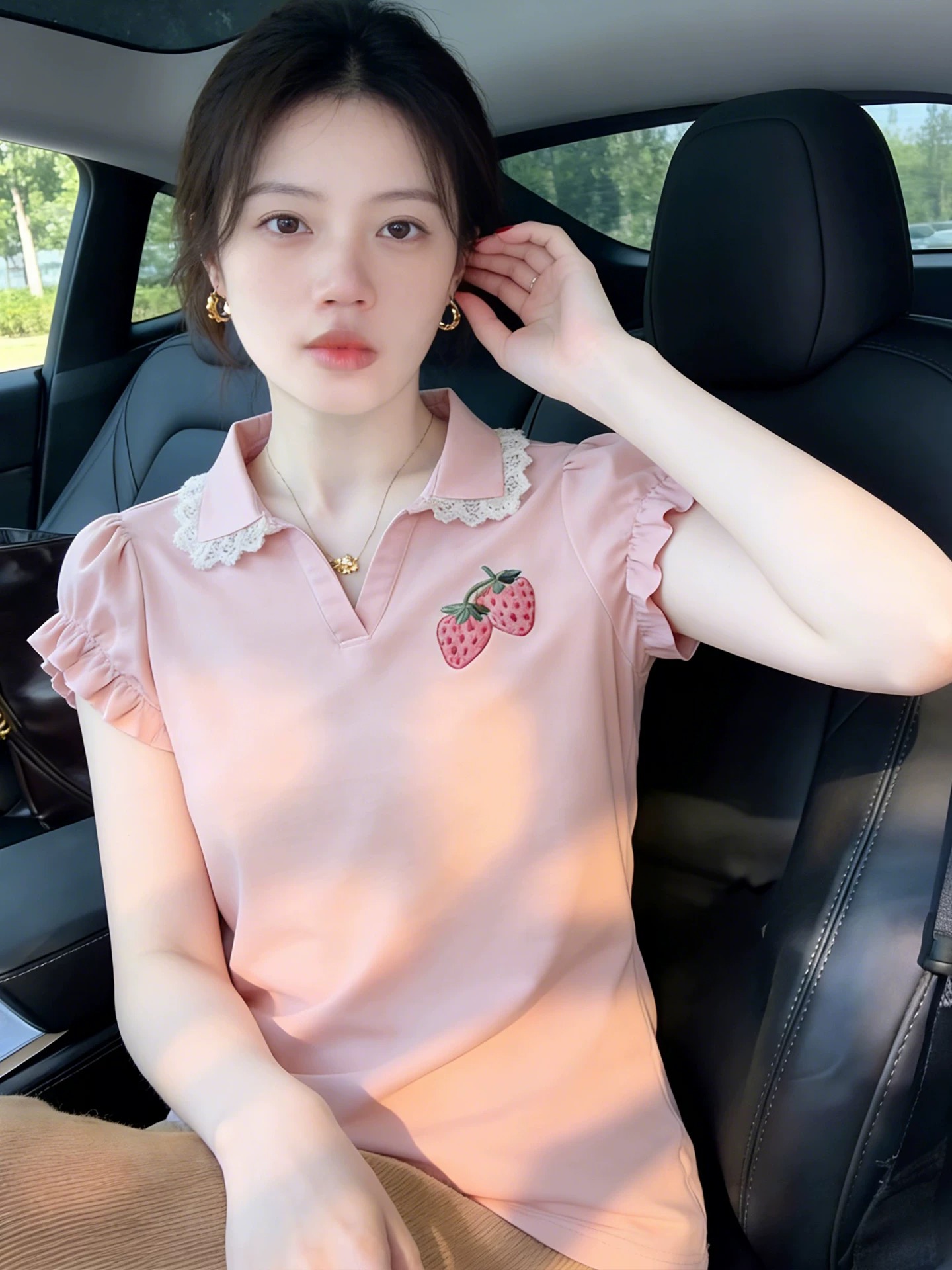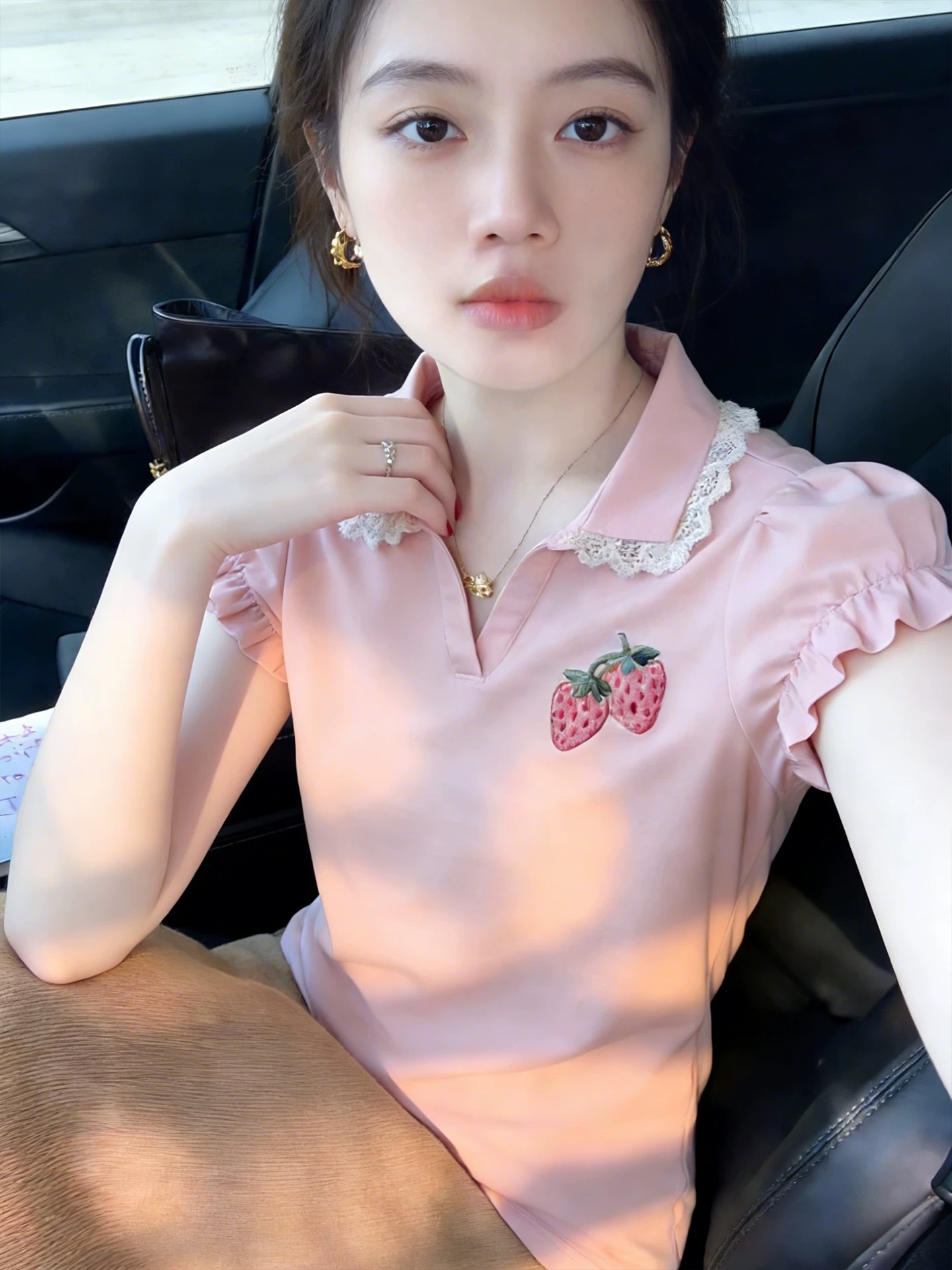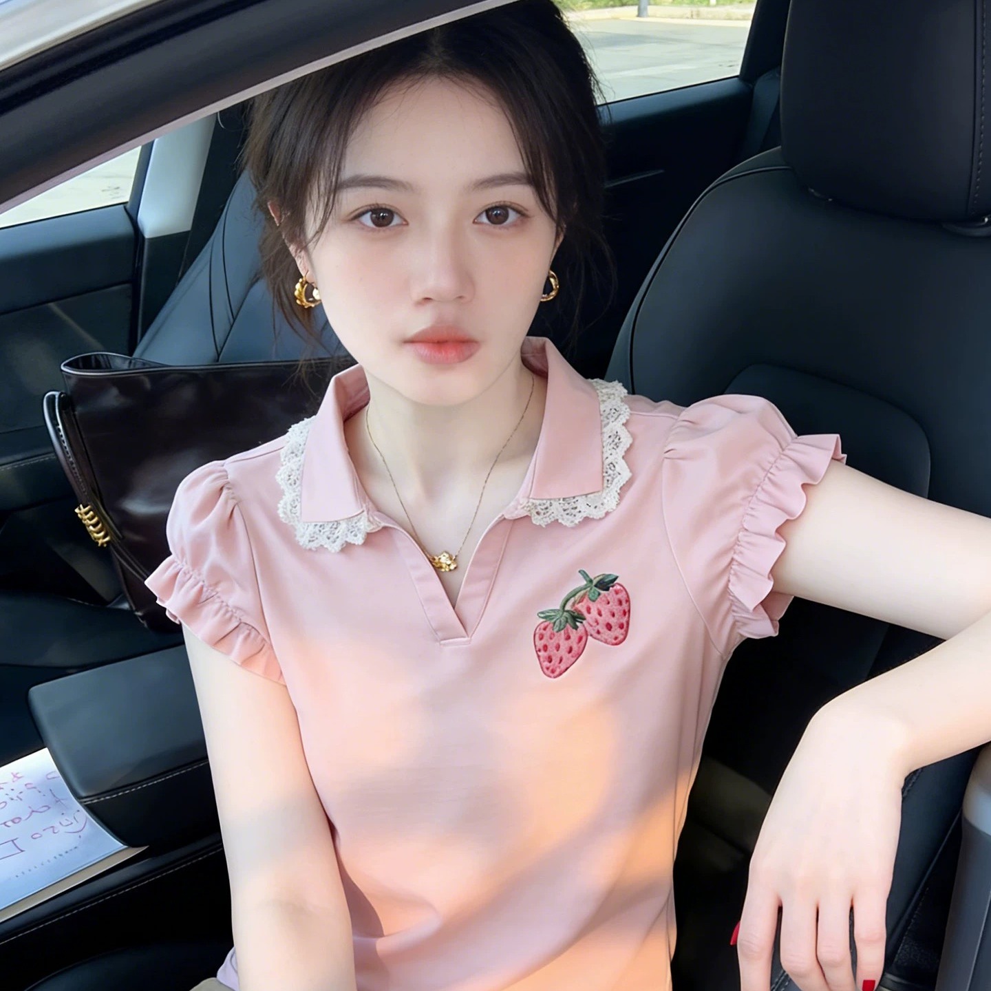 BY11948# 法式甜美草莓印花polo领短袖花边T恤女夏季巨好看氛围感上衣 服裝批發女裝批發服飾貨源