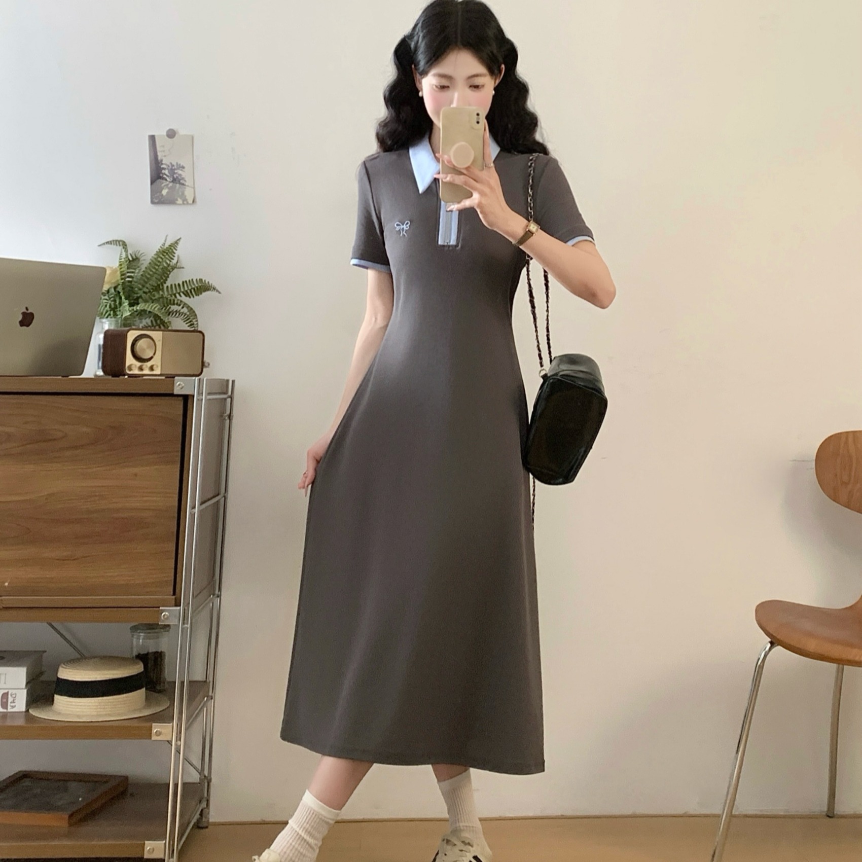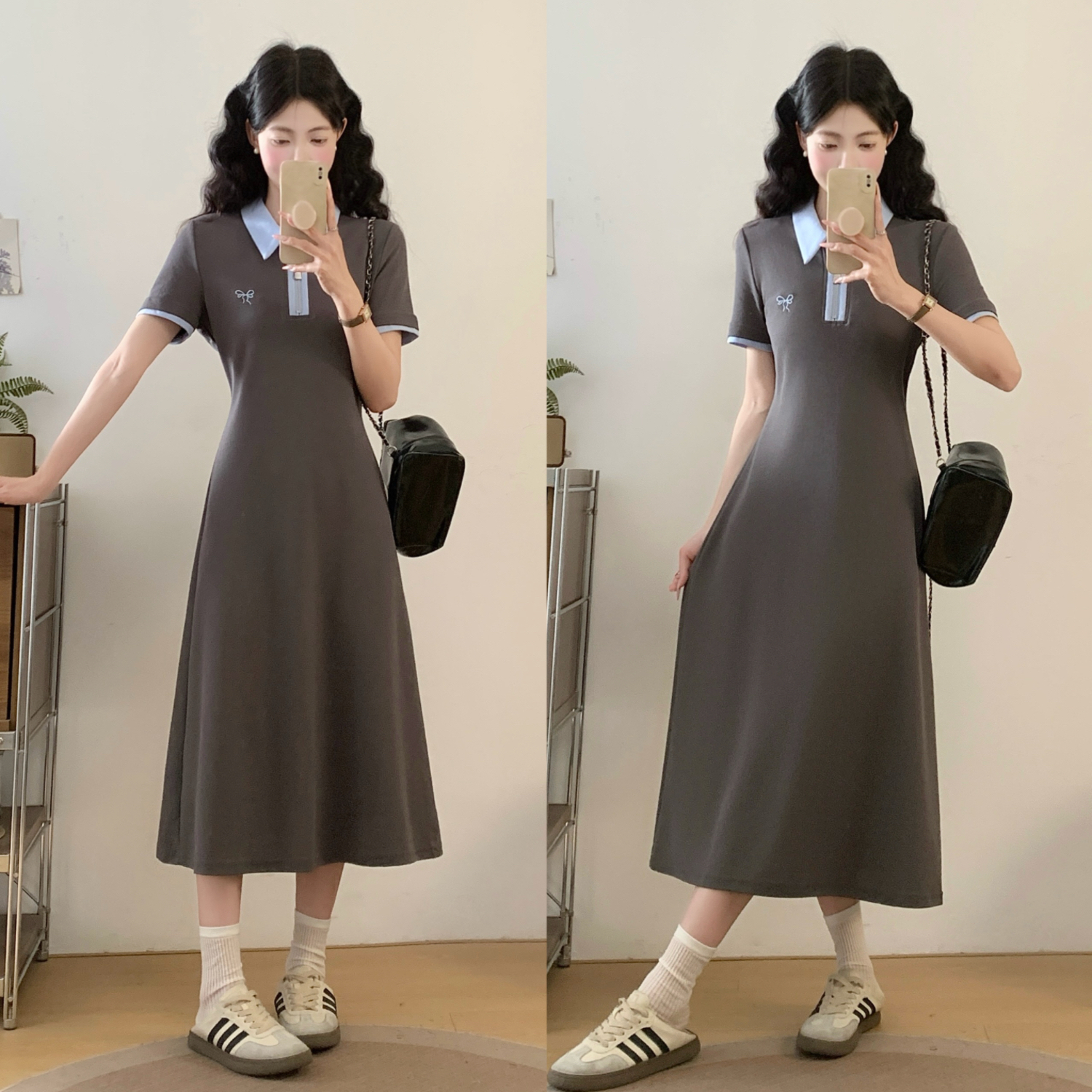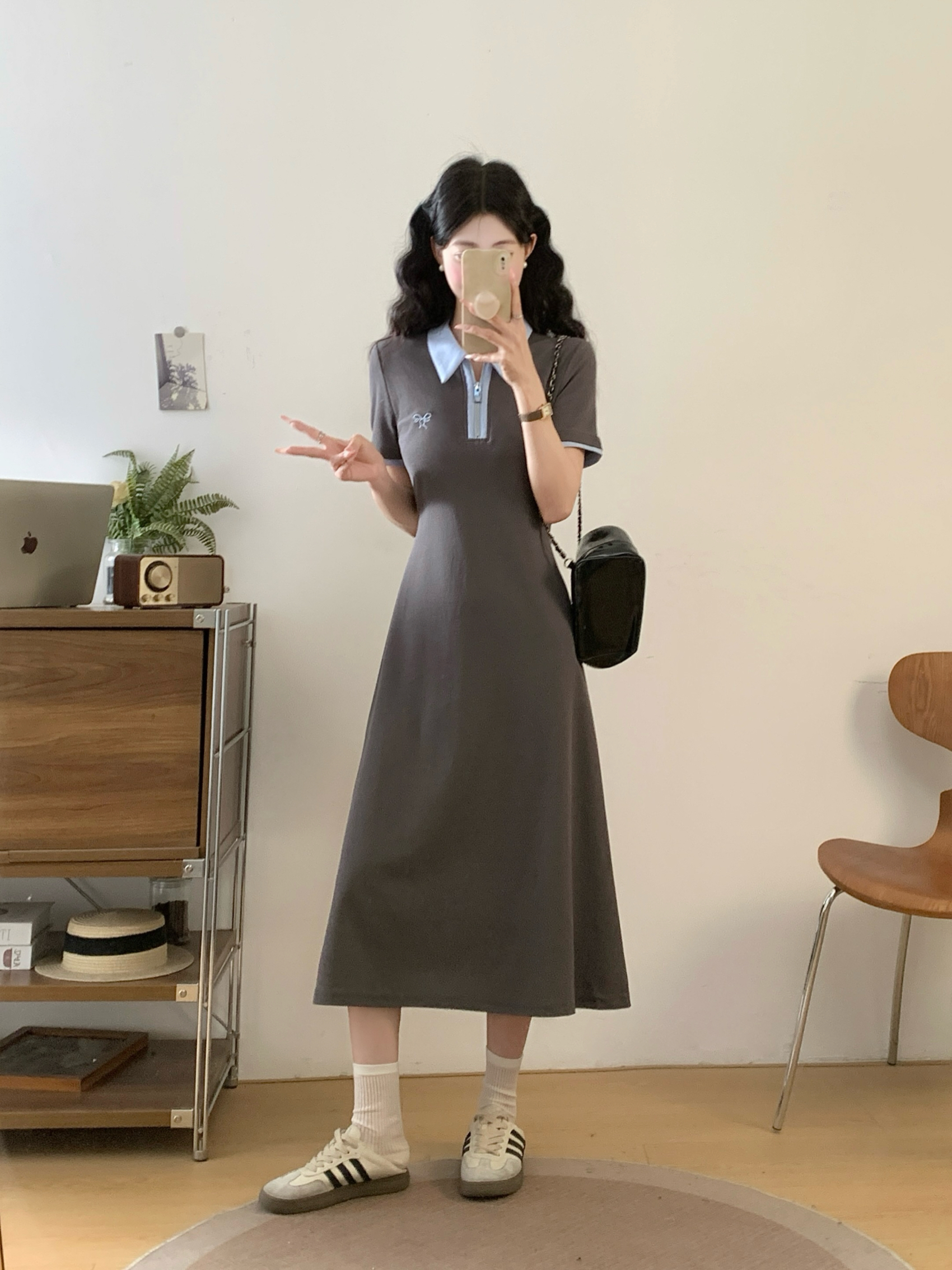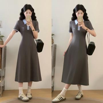 BY12035# 夏季新款撞色拉链POLO领大码连衣裙休闲轻运动中长裙 服裝批發女裝批發服飾貨源