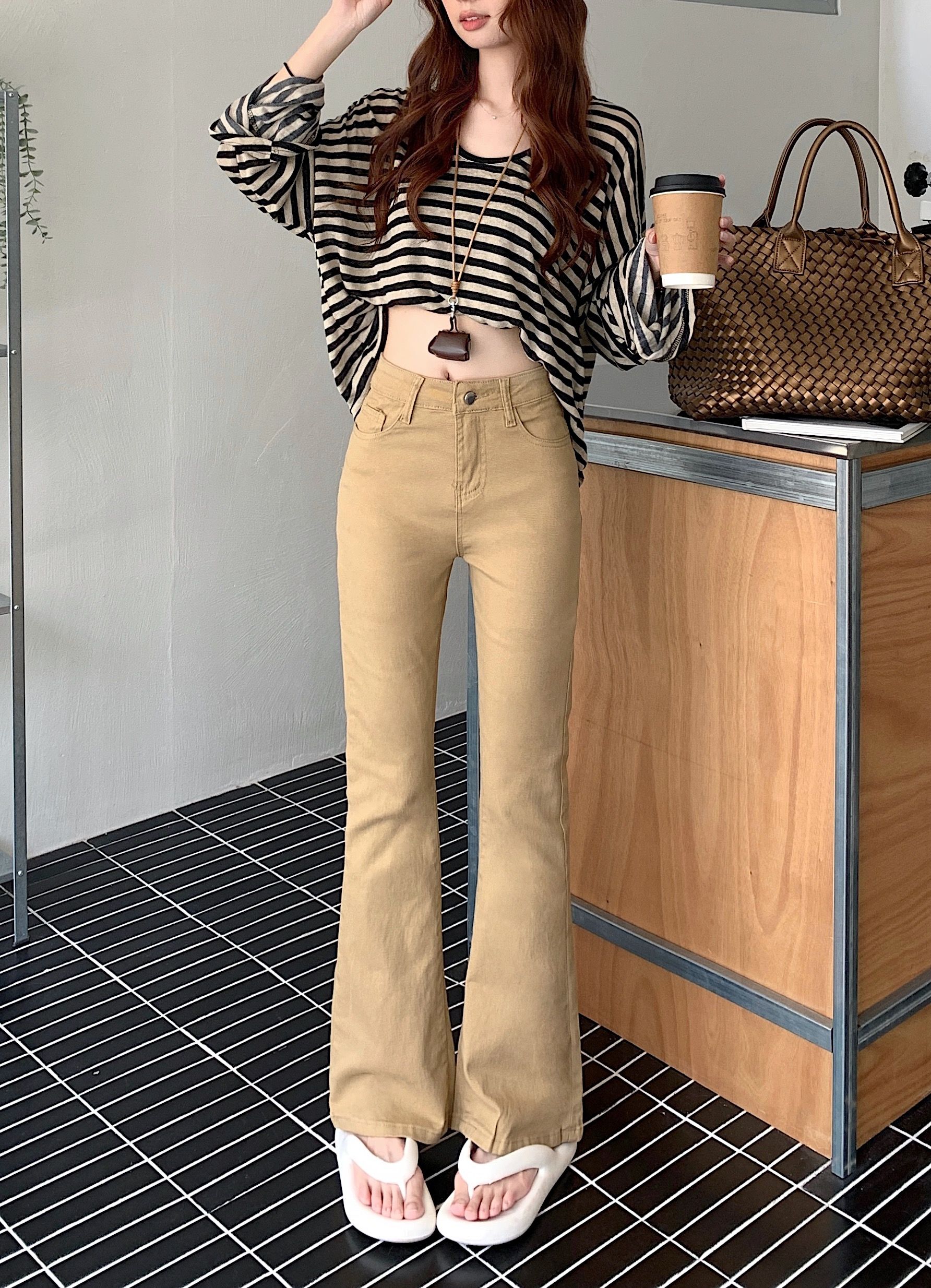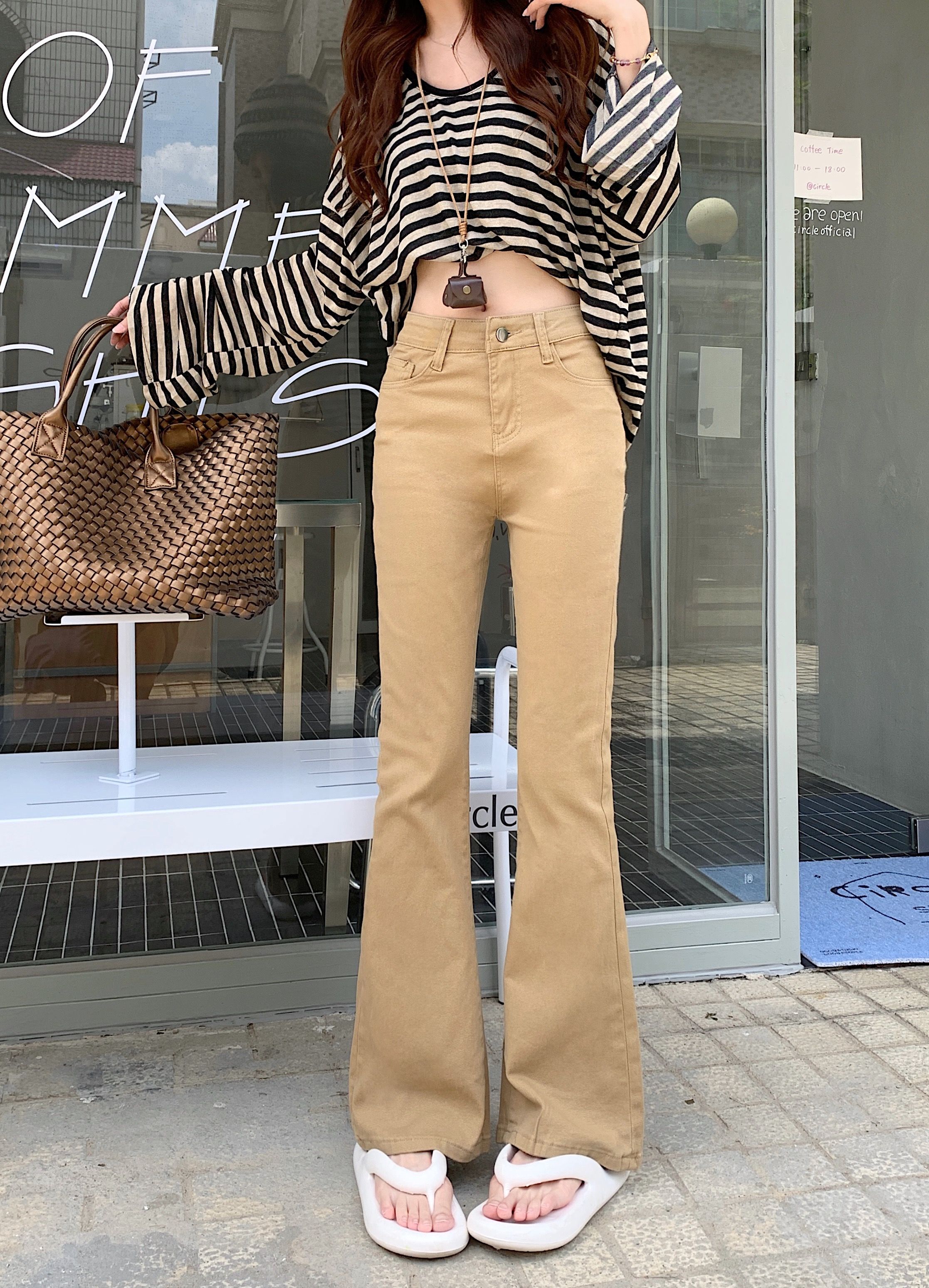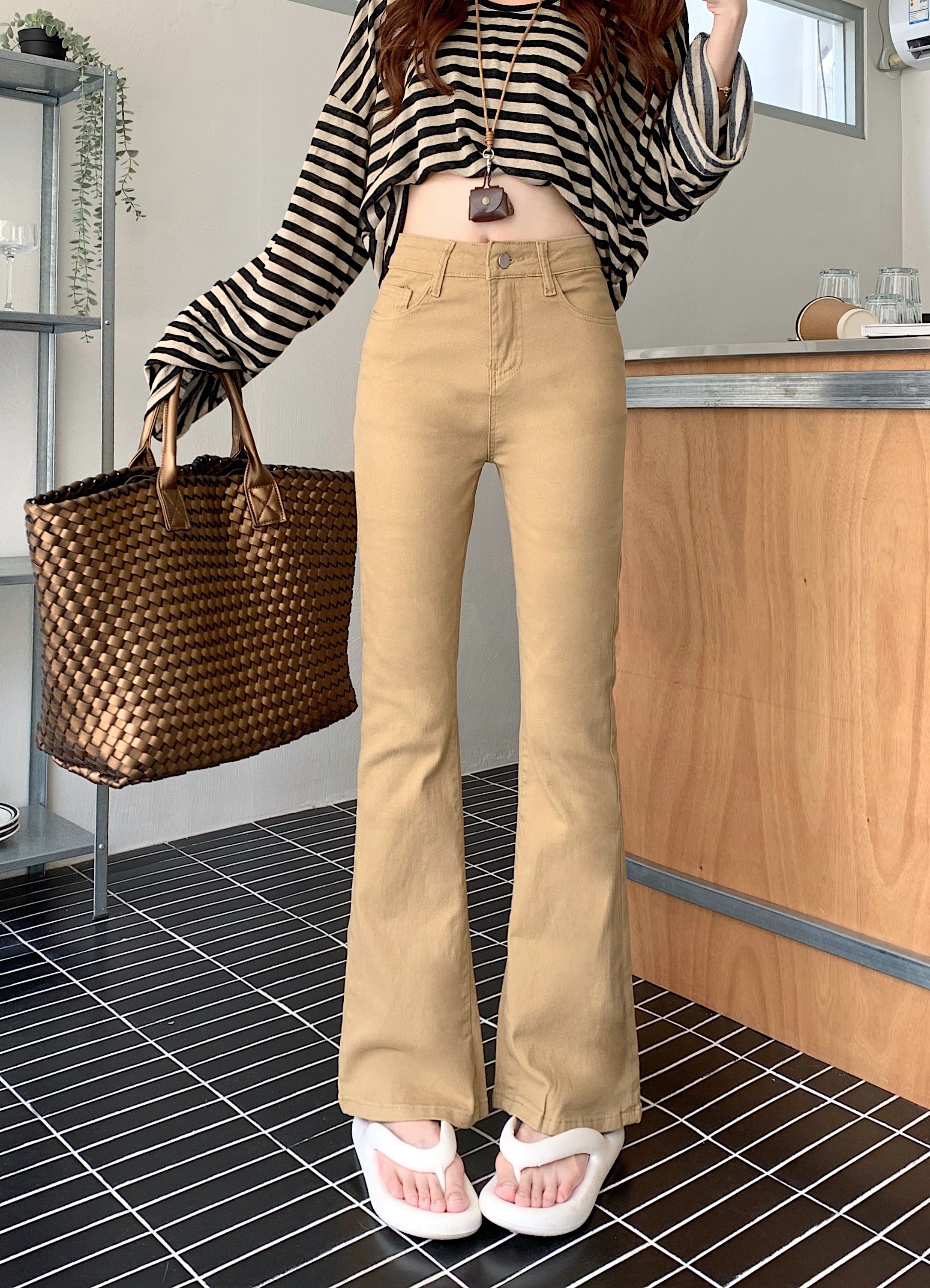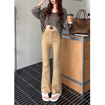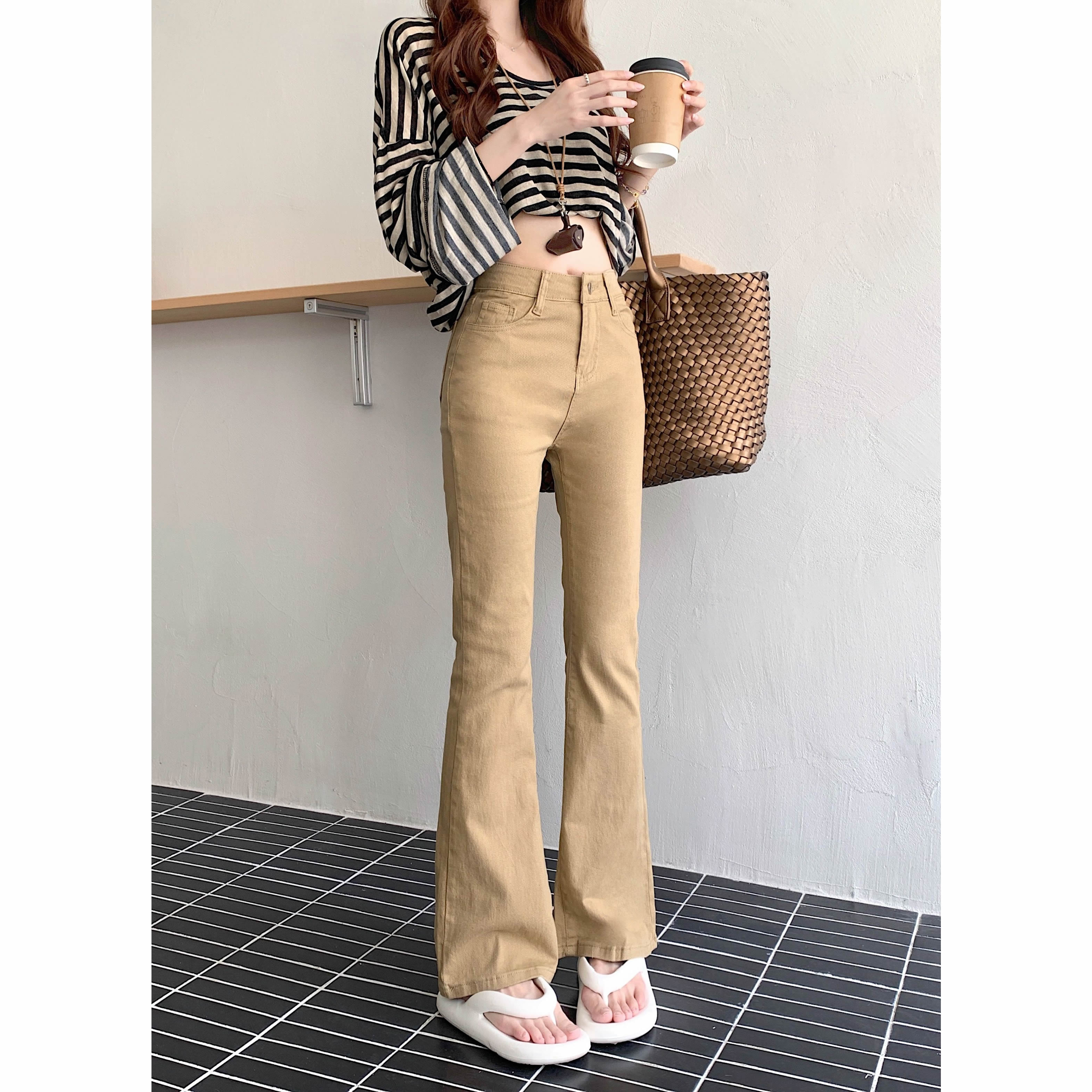BY12118# 美式卡其色高腰修身微喇牛仔裤女春秋显瘦紧身马蹄裤拖地裤 服裝批發女裝批發服飾貨源