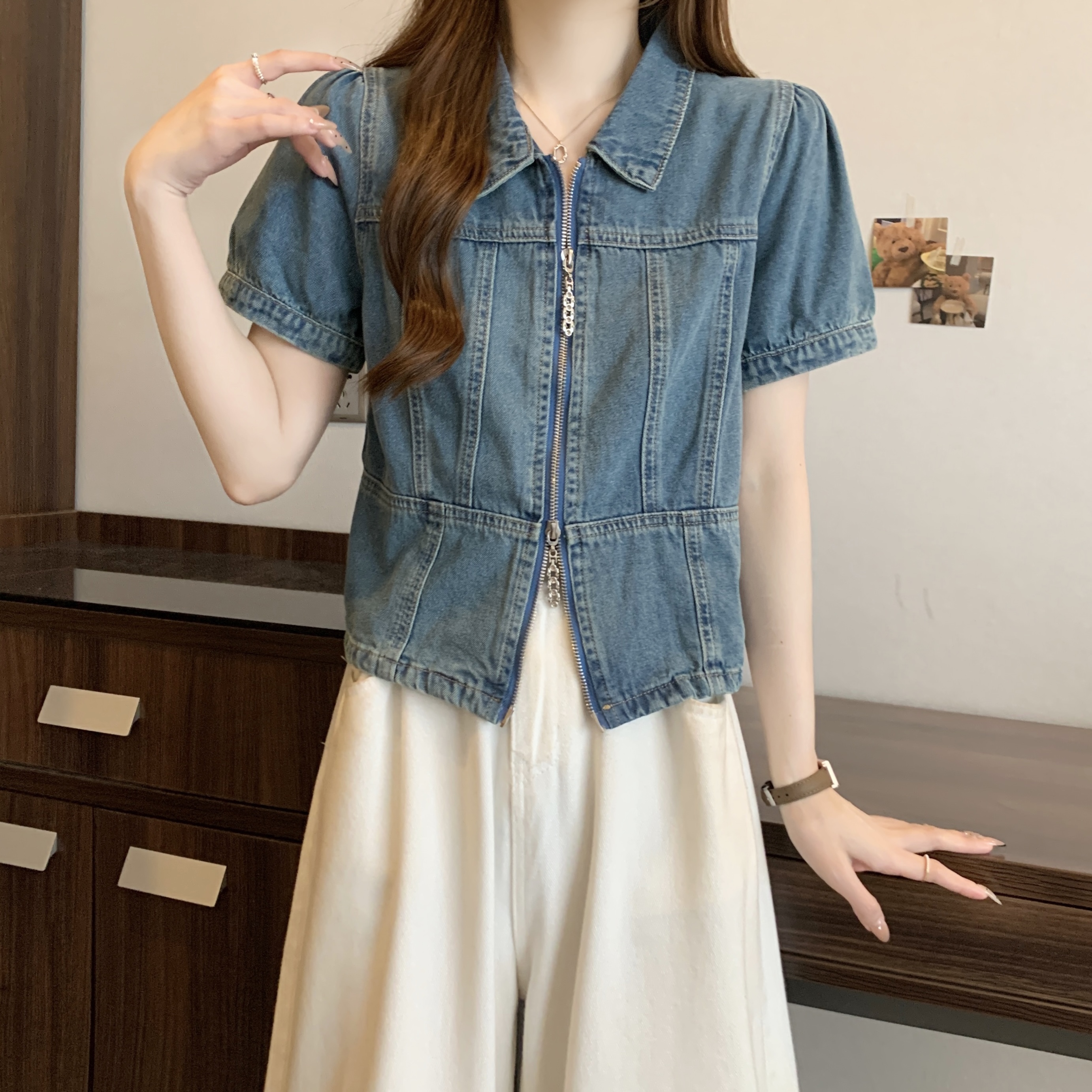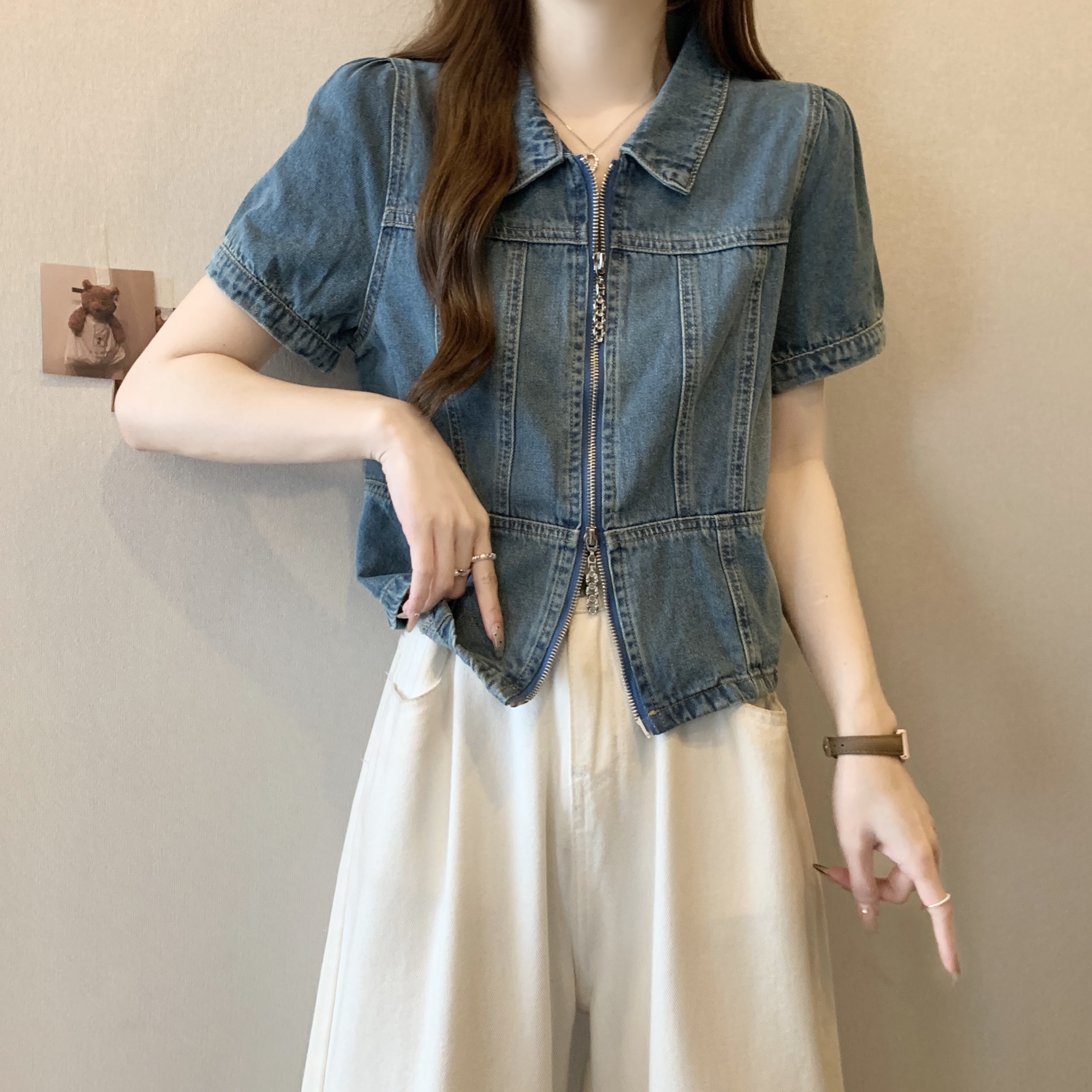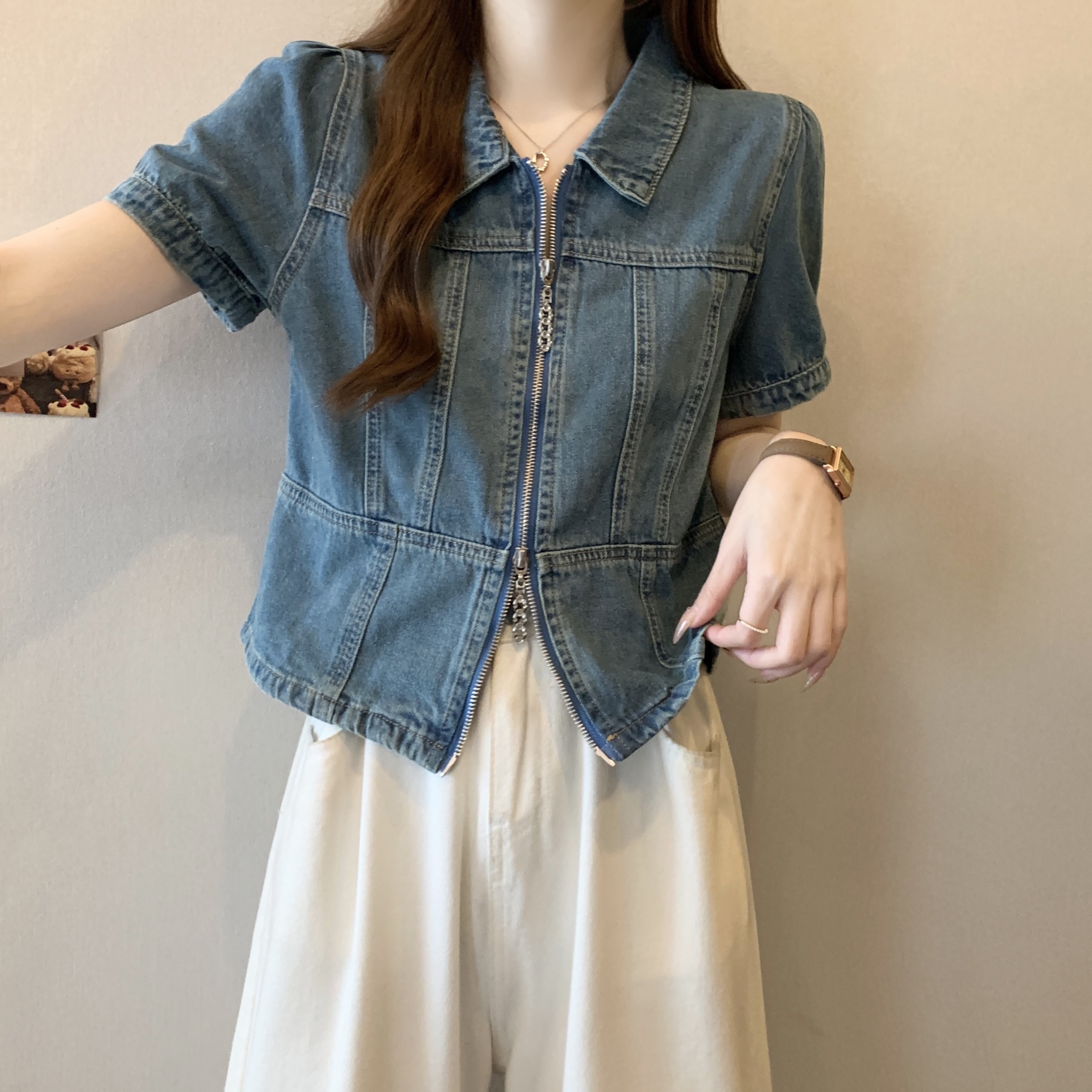 Home > 短袖雪纺衫、衬衫、上衣 > BY12421# 大码胖mm夏季新款辣妹牛仔上衣女双拉链翻领短袖 服裝批發女裝批發服飾貨源