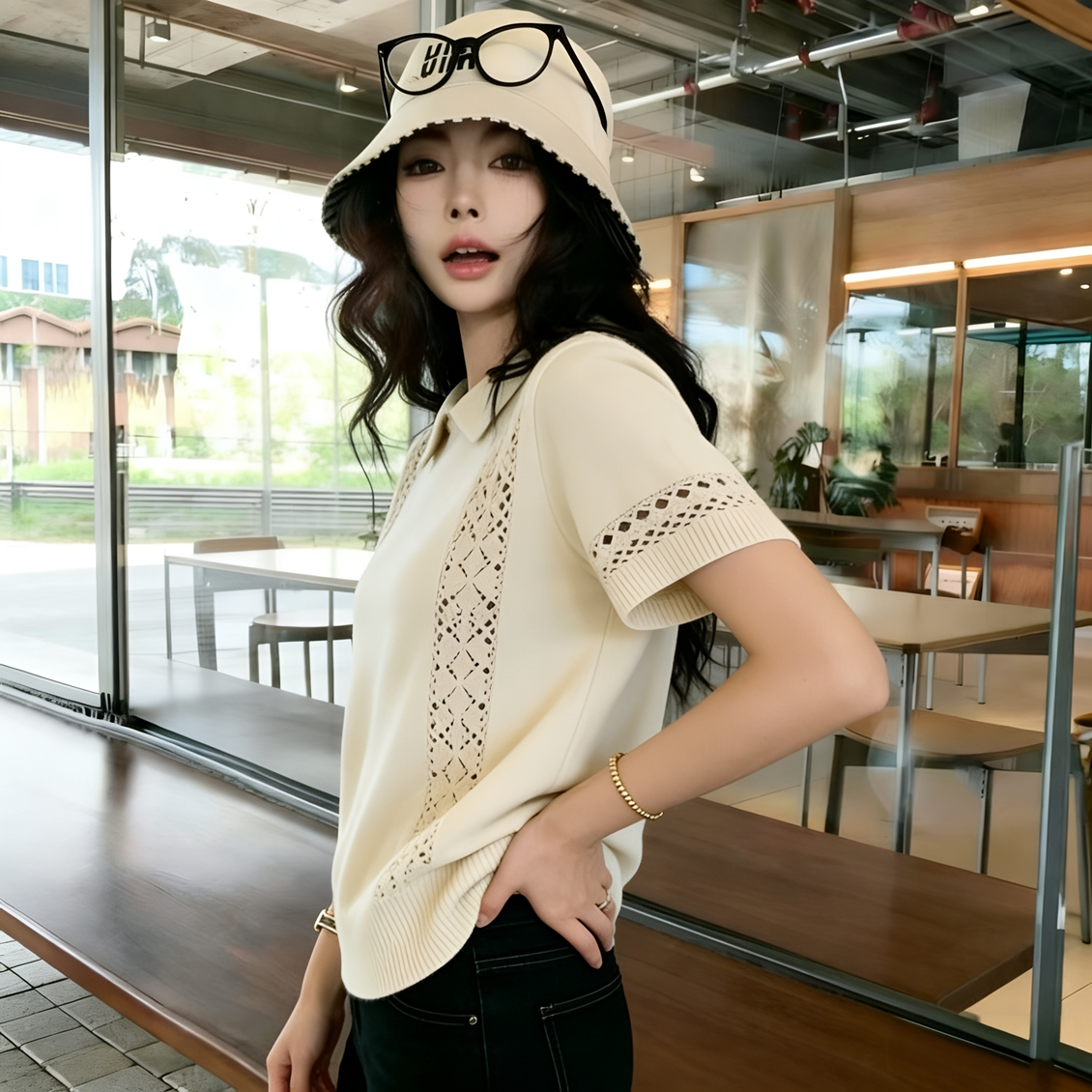 Home > 毛衣、针织衫 > BY15644# 夏季新款温柔风气质通勤polo领针织镂空拼接短袖上衣女 服裝批發女裝批發服飾貨源