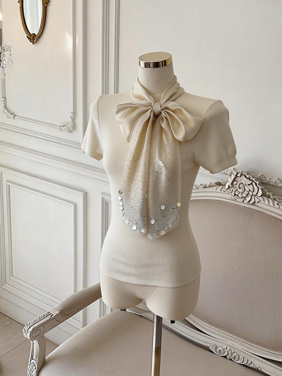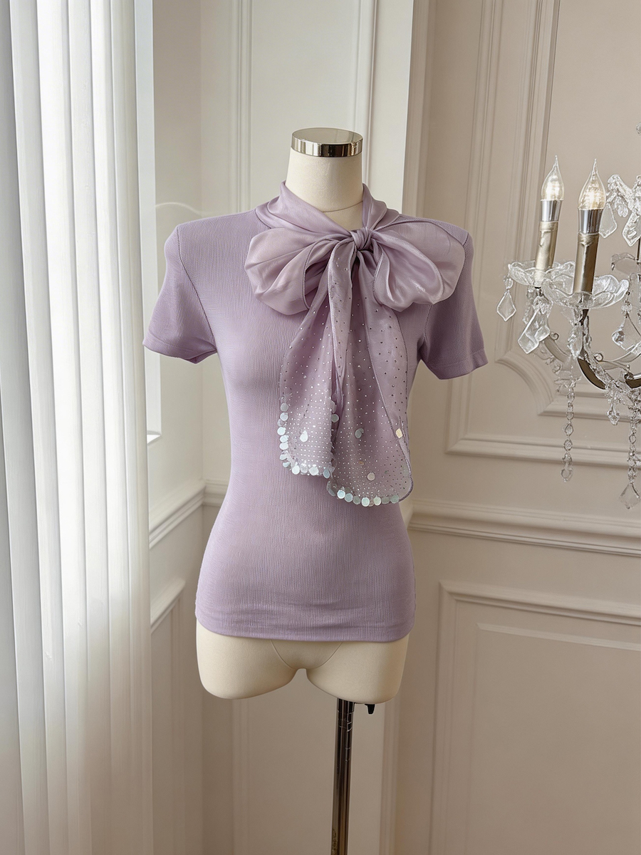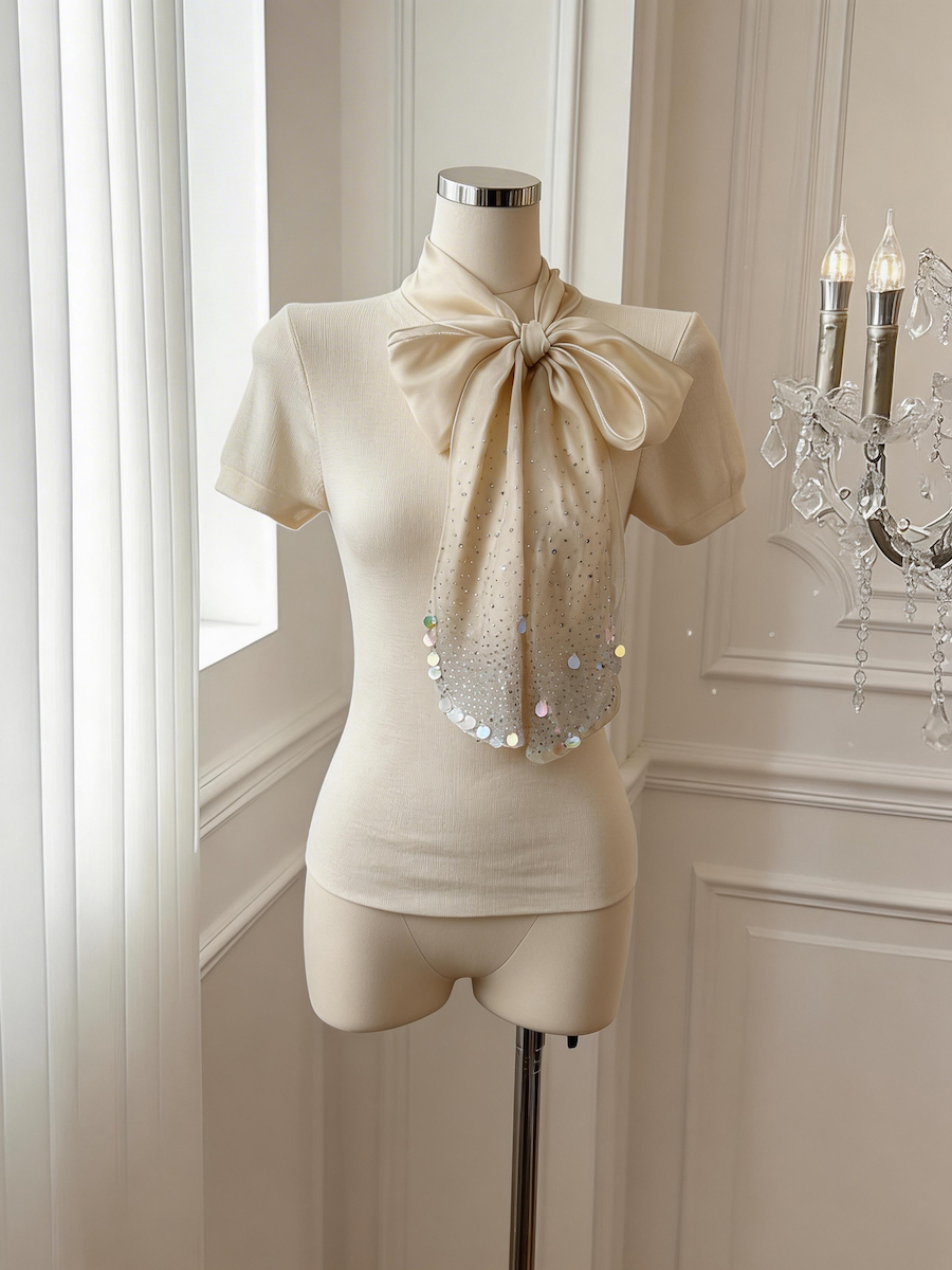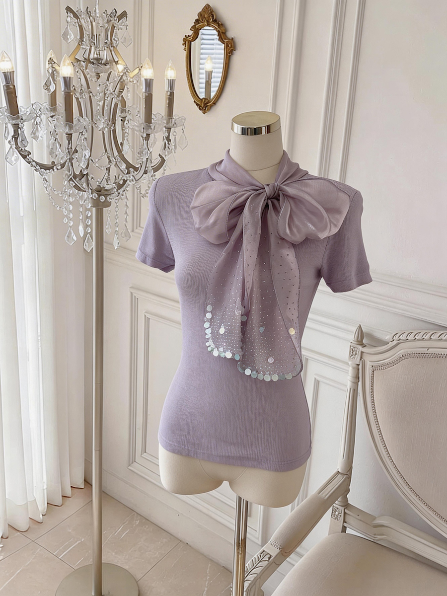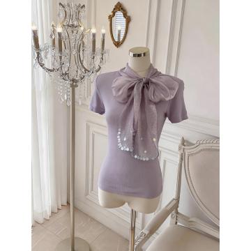 BY17552# 法式设计感缎面蝴蝶结系带短袖针织衫气质温柔上衣 服裝批發女裝批發服飾貨源