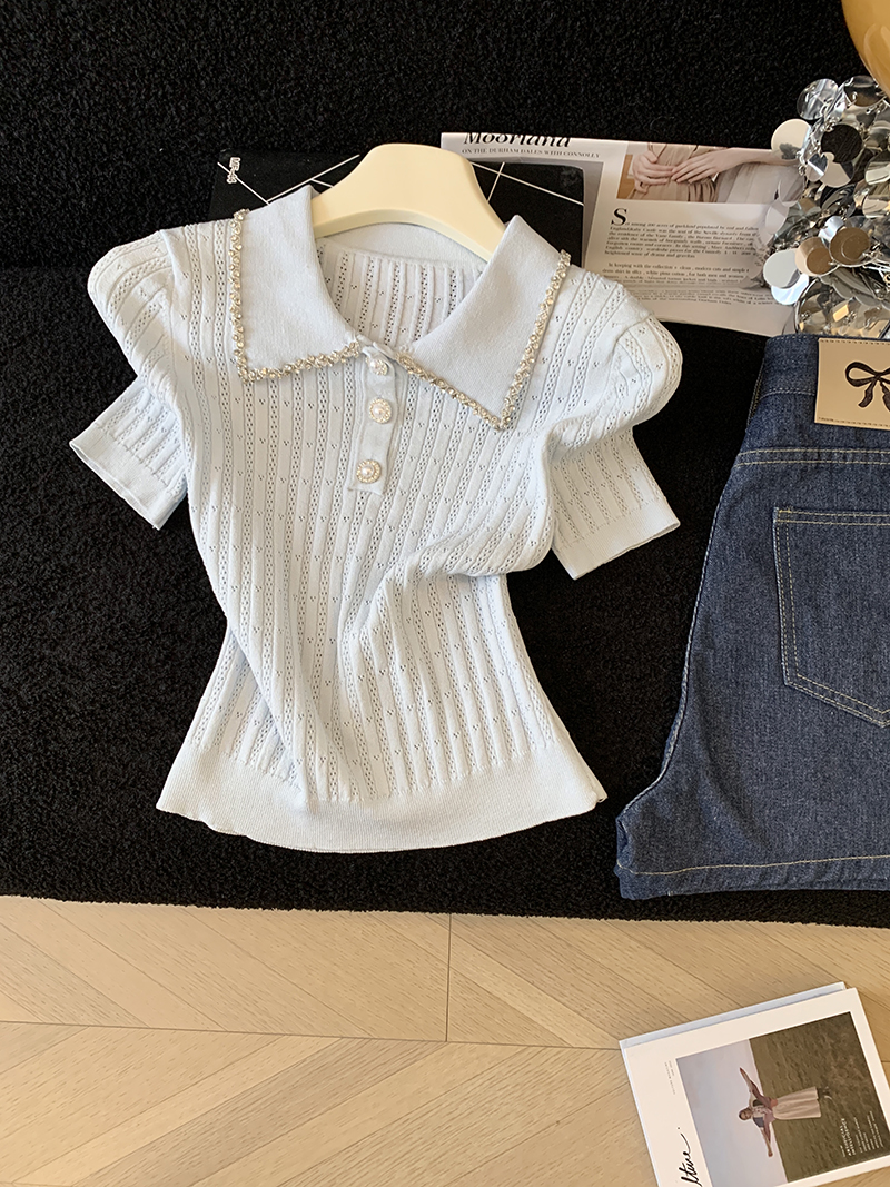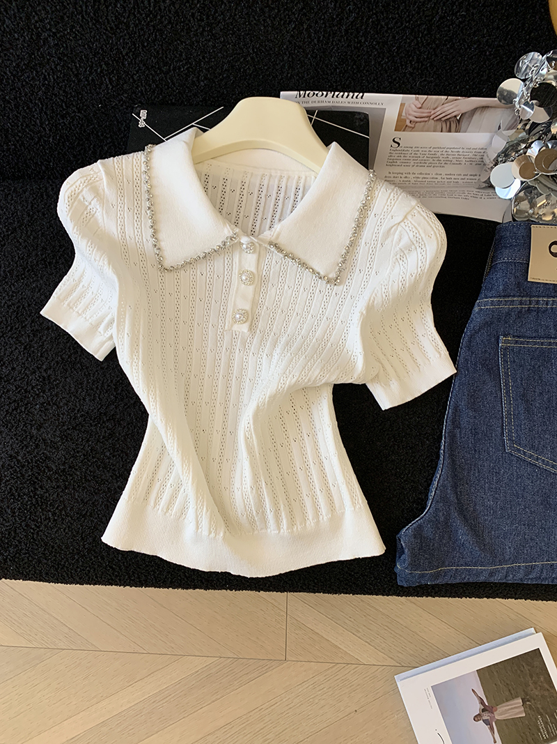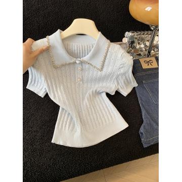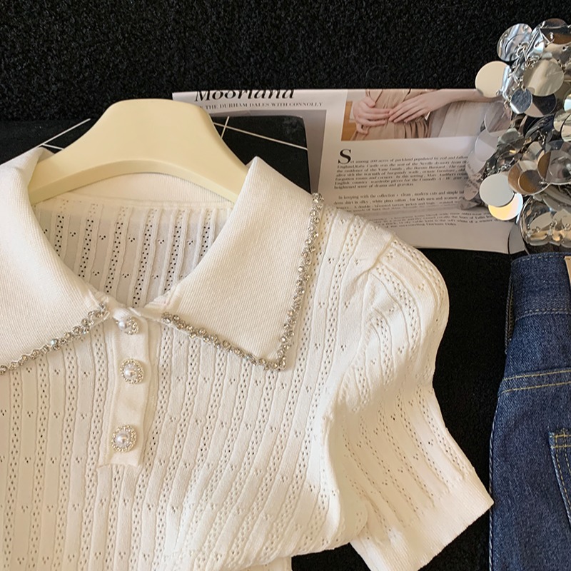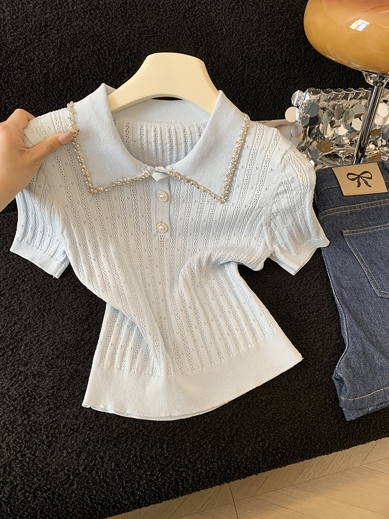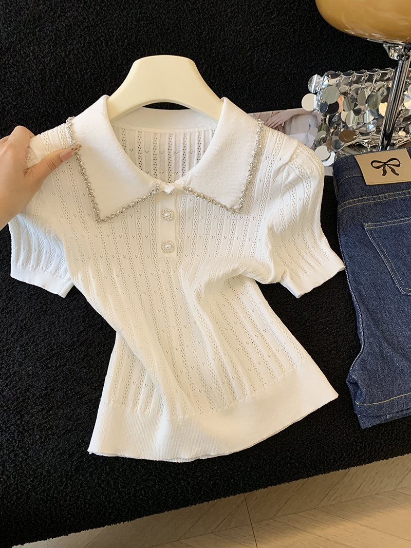 BY17932# 镶钻花边翻领针织t恤女短袖夏季新款设计感修身显瘦短款上衣 服裝批發女裝批發服飾貨源