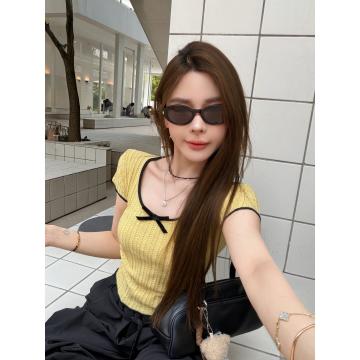 BY18704# 黄色正肩蝴蝶结冰丝针织短袖T恤女夏季超火减龄修身短款上衣 服裝批發女裝批發服飾貨源