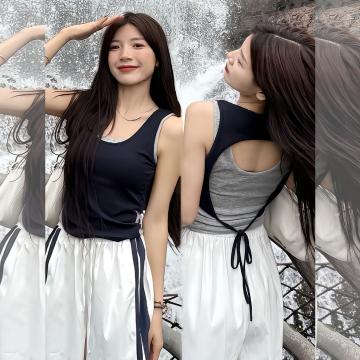 BY19062# 撞色拼接假两件吊带背心女夏季修身短款镂空露背辣妹上衣 服裝批發女裝批發服飾貨源