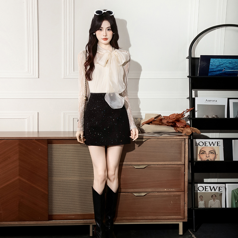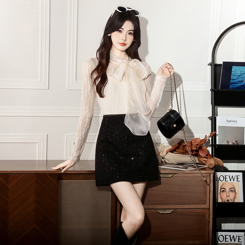 FA45223# 新款法式优雅蝴蝶结蕾丝上衣+亮闪短款A字半身裙两件套 服裝批發女裝批發服飾貨源