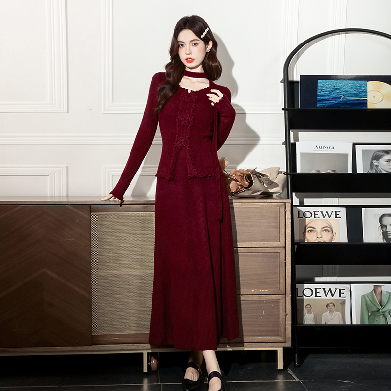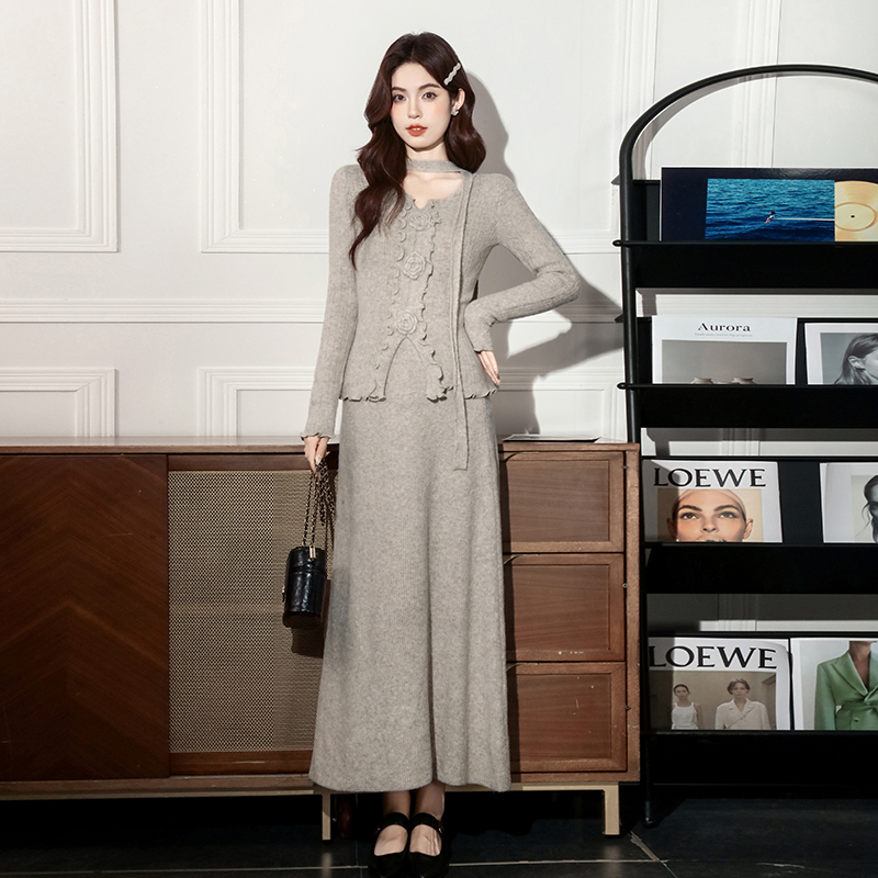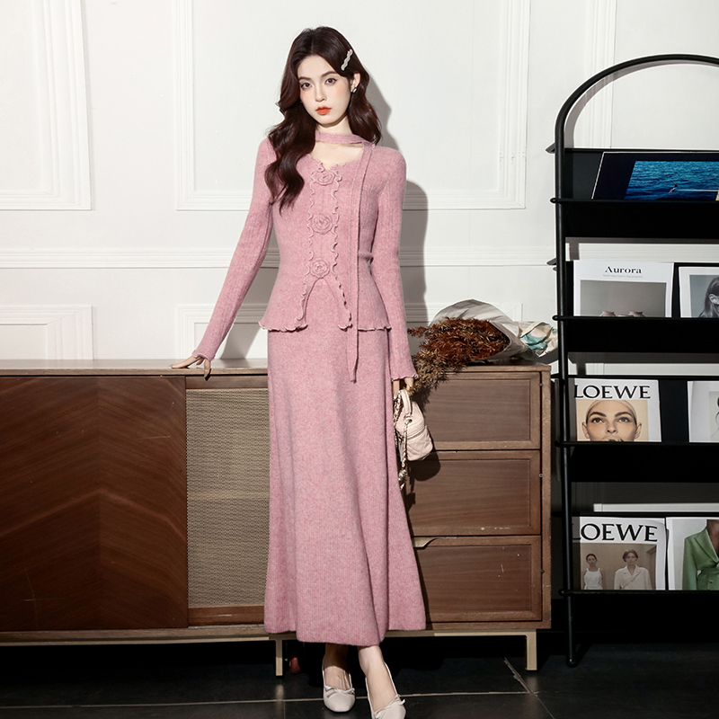 FA45224# 秋冬新款温柔优雅气质小女人长款显瘦针织两件套装裙 服裝批發女裝批發服飾貨源