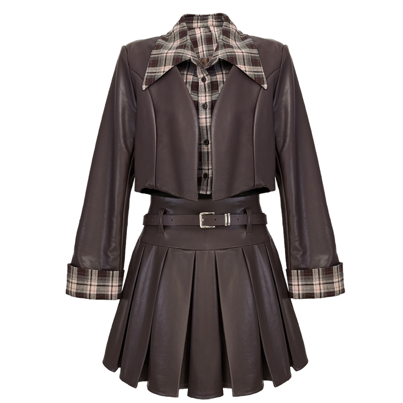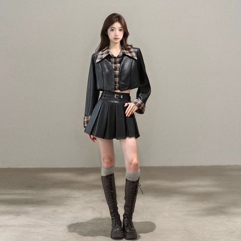 FA45250# 美式辣妹气质假两件格子皮衣夹克外套短裙秋冬小个子套装 服裝批發女裝批發服飾貨源