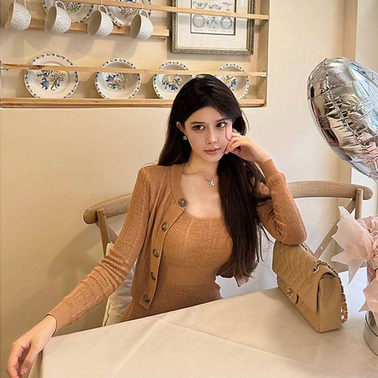 FA45581# 法式小香风肌理纹开衫针织外套女初秋新款包臀背心裙毛织两件套装 服裝批發女裝批發服飾貨源
