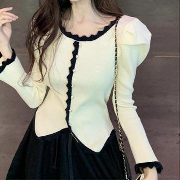 FA45590# 设计感撞色花边针织衫女秋冬新款法式气质温柔风毛衣黑色杏色 服裝批發女裝批發服飾貨源