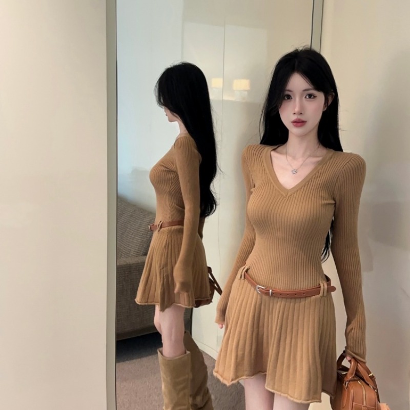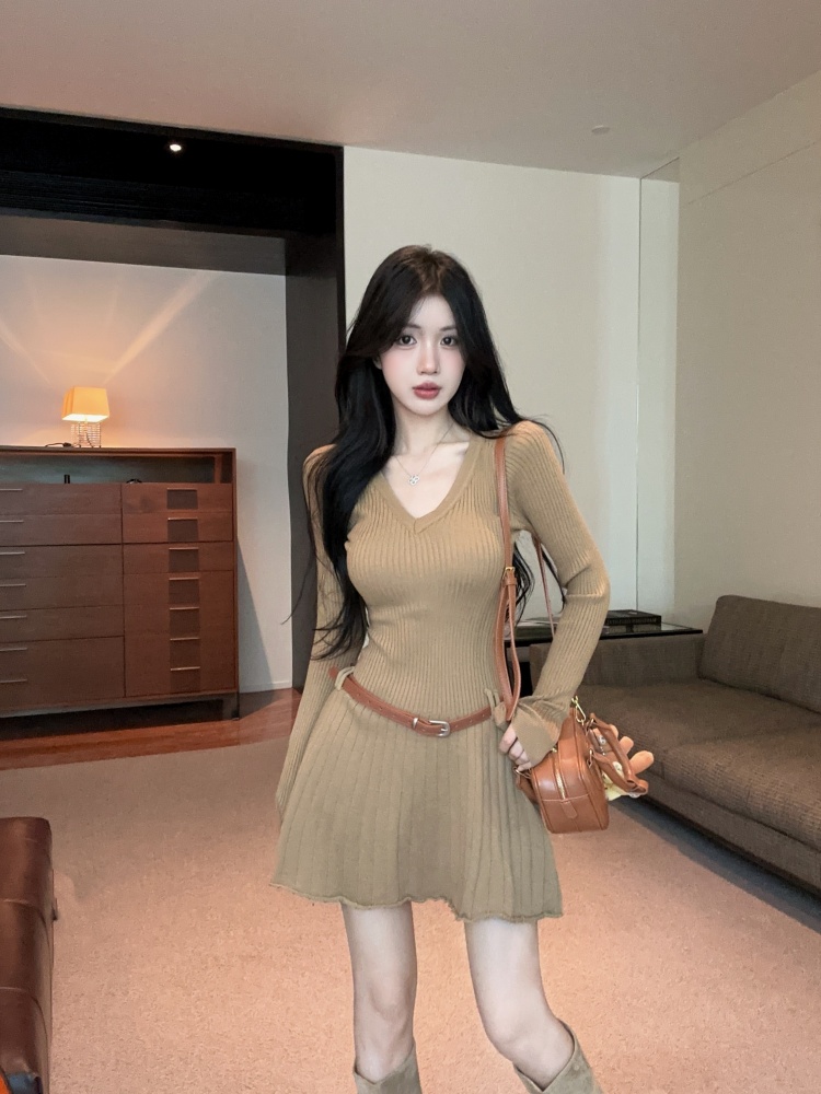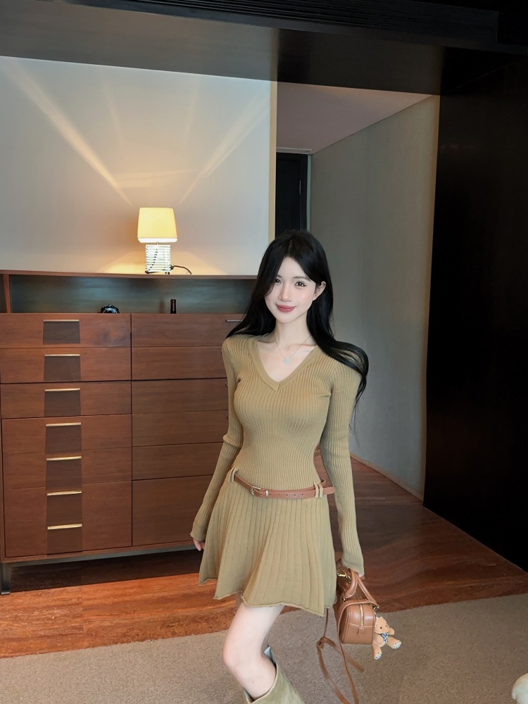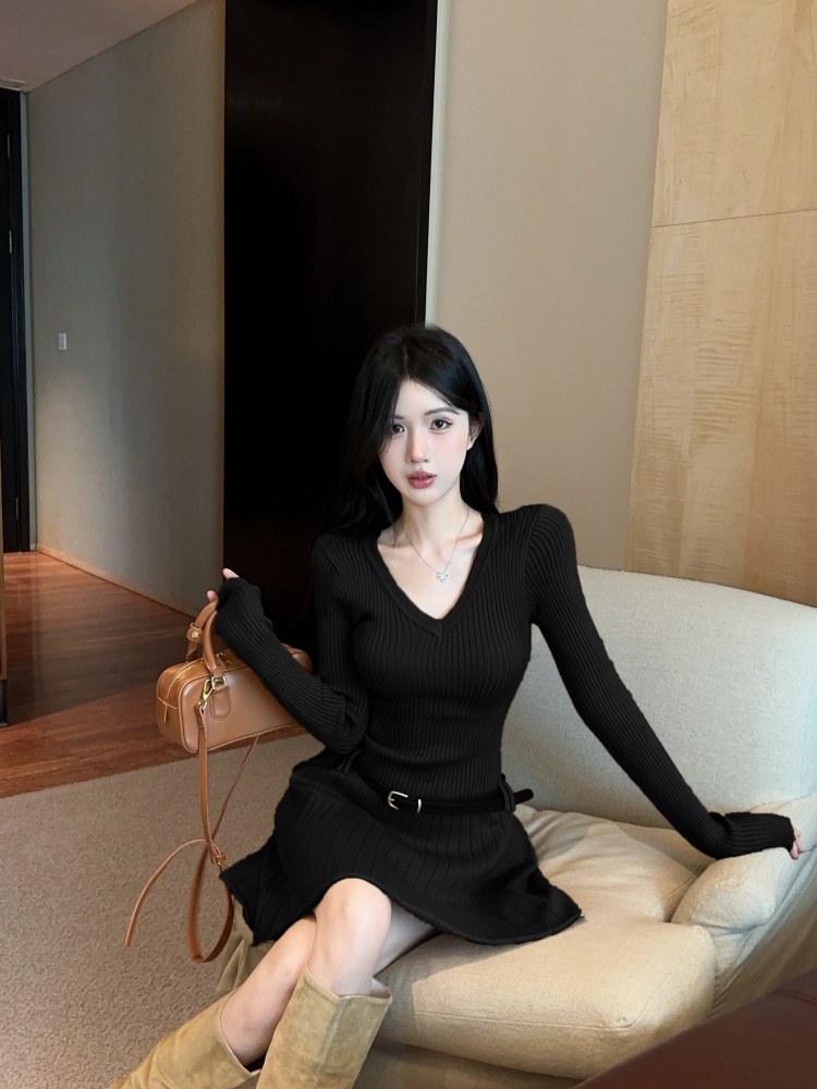 FA45804# 法式v领长袖针织连衣裙女带腰带 服裝批發女裝批發服飾貨源
