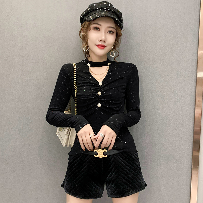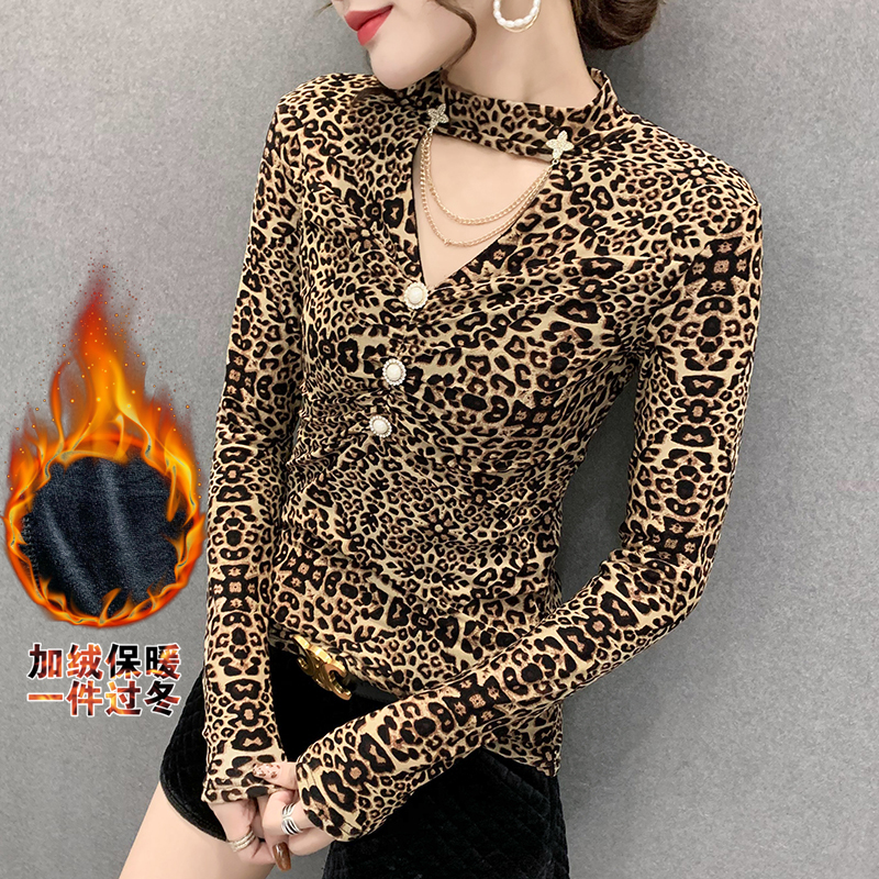 FA45813# 秋冬新款加绒加厚保暖女士打底衫豹纹网纱通勤显瘦小心机洋气上衣 服裝批發女裝批發服飾貨源