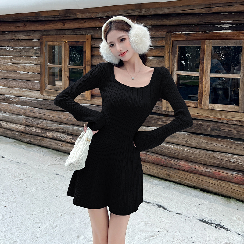 FA45847# 法式U领针织连衣裙女装秋冬小个子收腰显瘦长袖麻花a字短裙子 服裝批發女裝批發服飾貨源