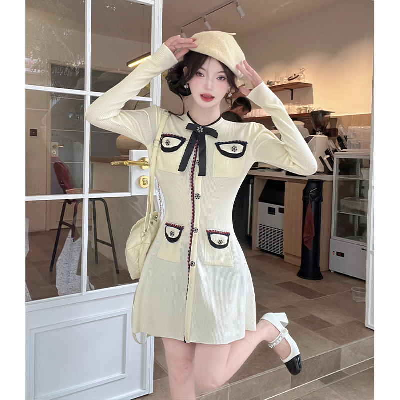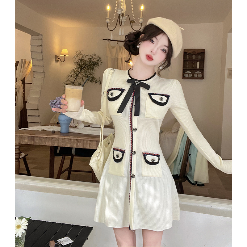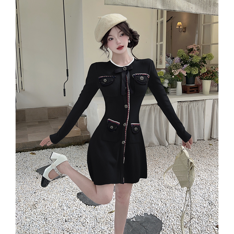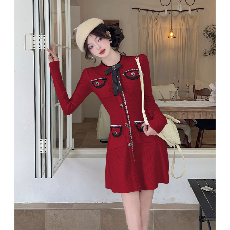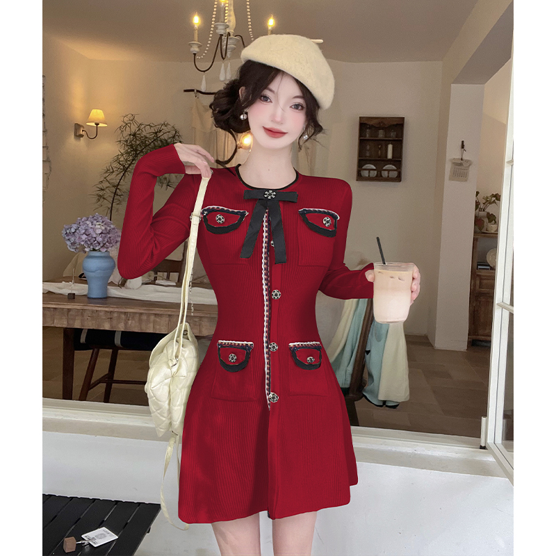 FA45848# 新年女圆领针织连衣裙甜美收腰A字裙秋冬显瘦毛衣打底裙 服裝批發女裝批發服飾貨源
