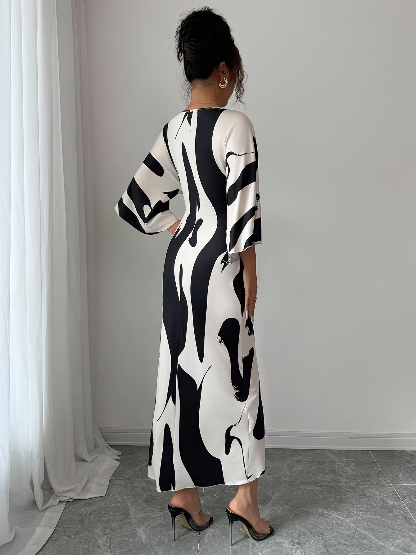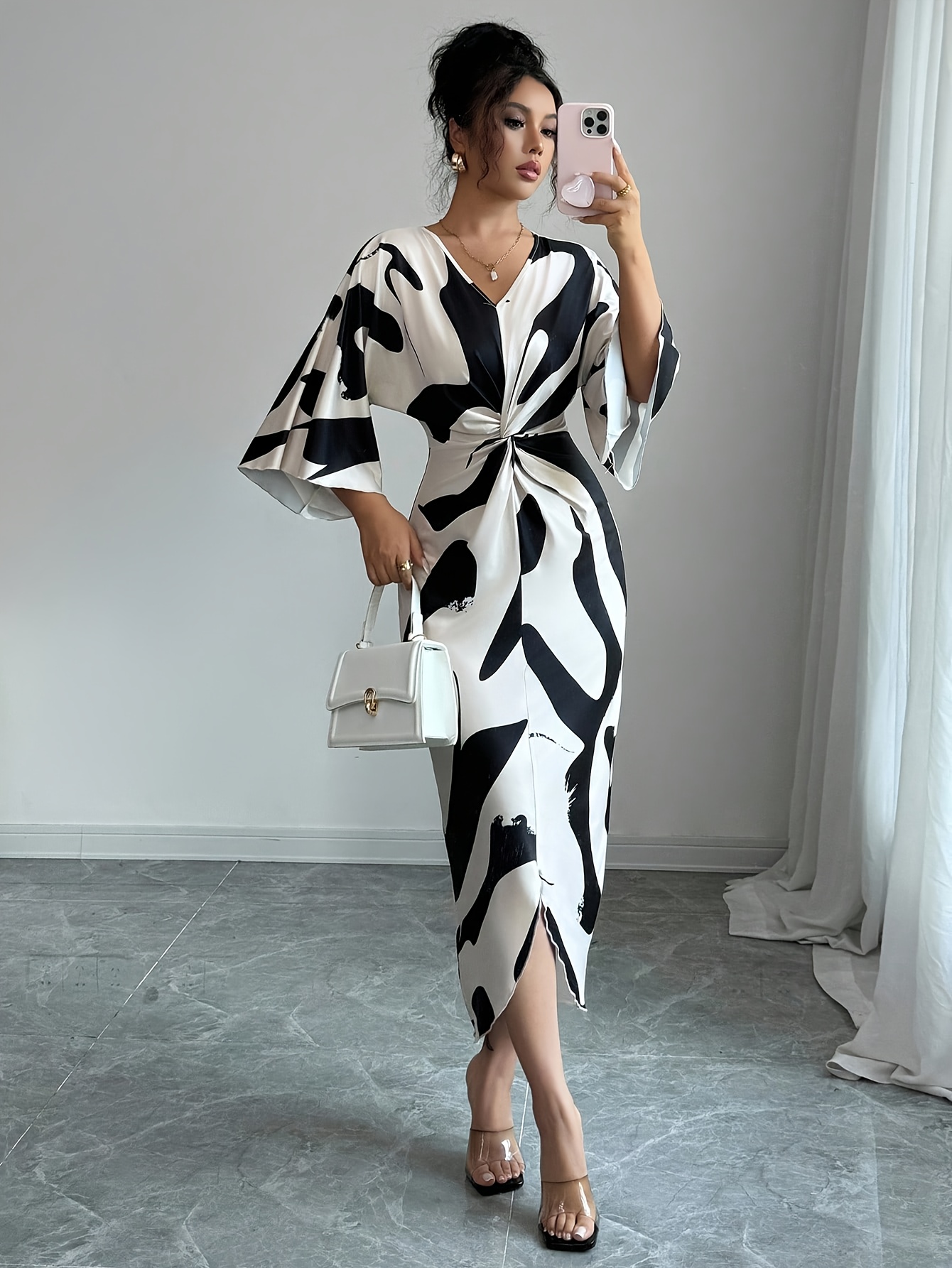 FA45977# 女士杏色底色印花针织V领收腰扭结设计收腰修身不规则下摆连衣裙 服裝批發女裝批發服飾貨源
