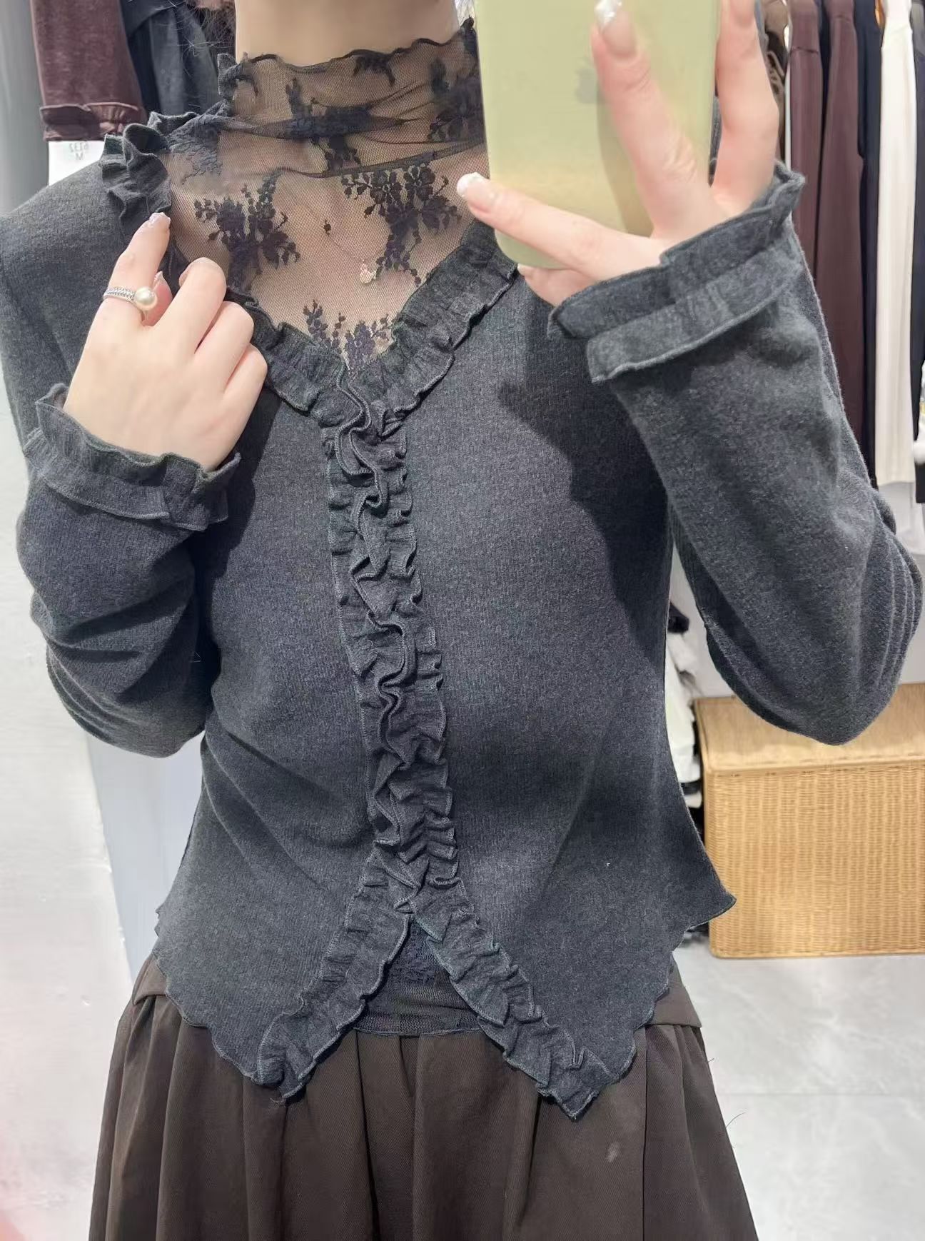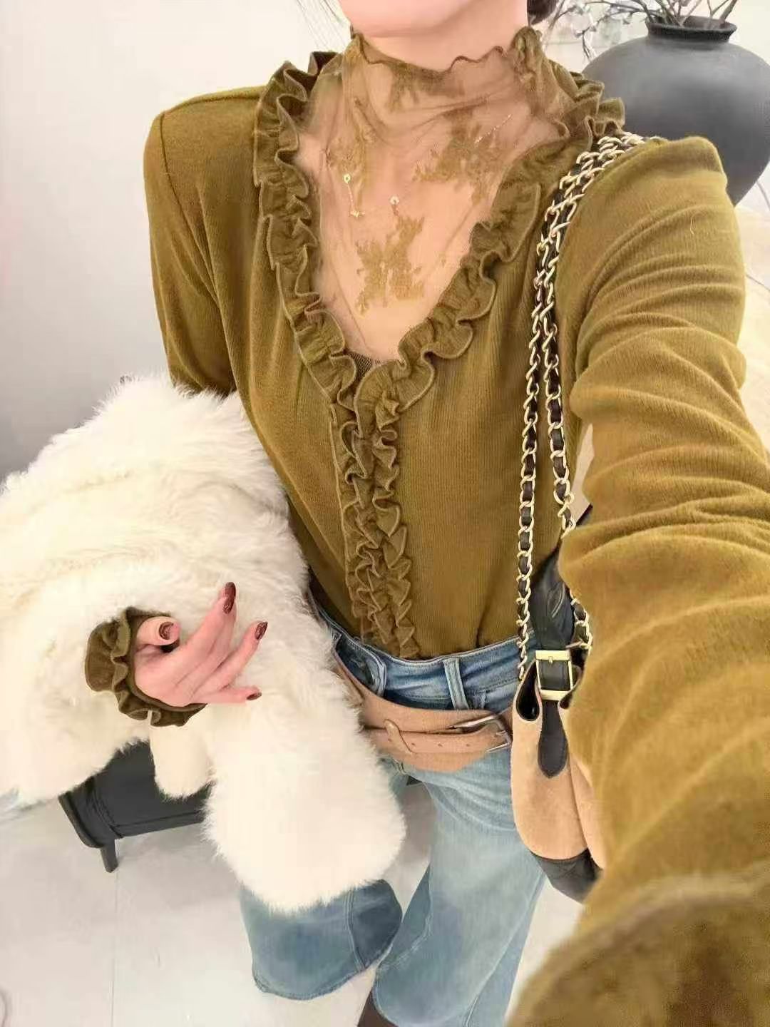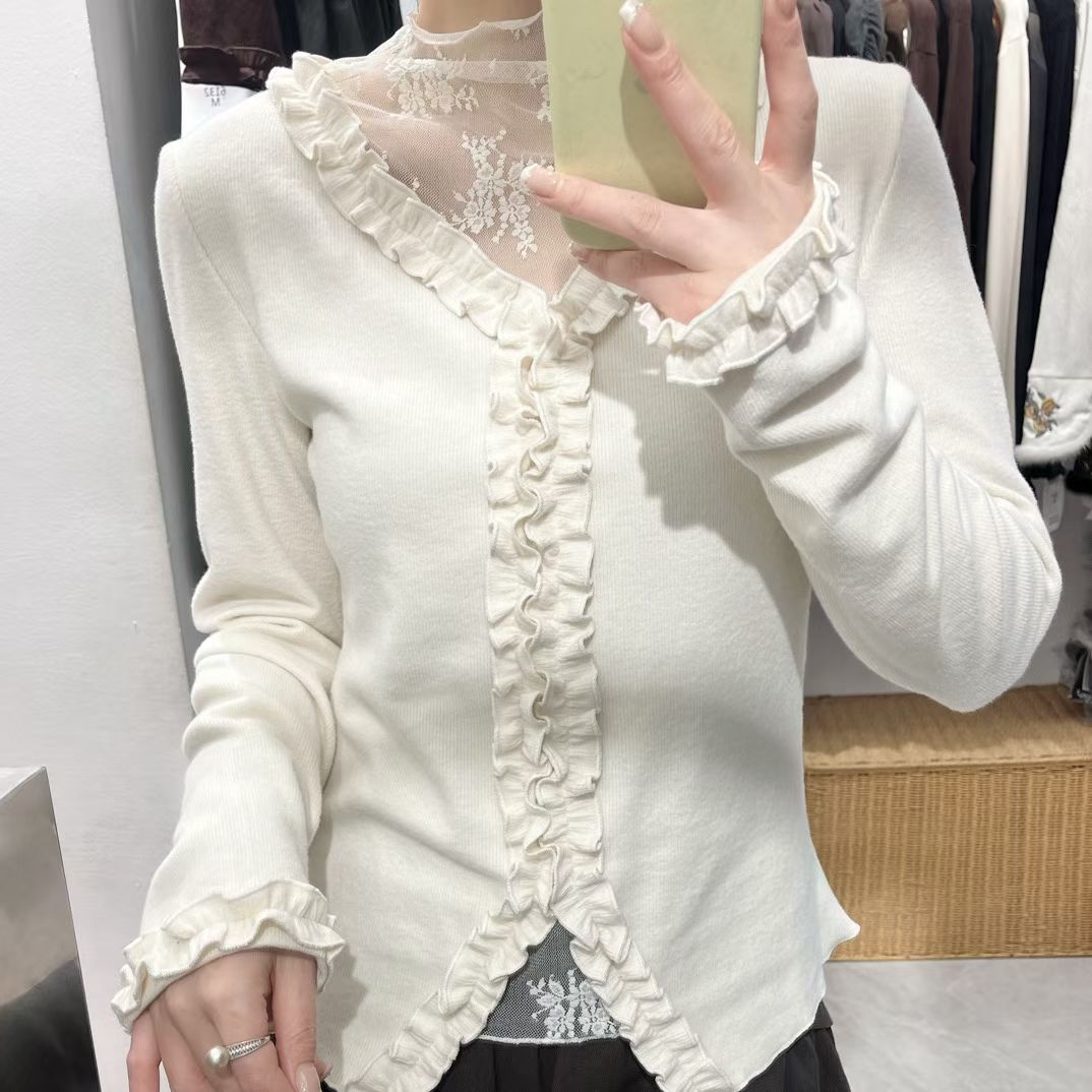 FA45990# 秋冬花瓣设计网纱拼接V领假两件长袖修身气质打底衫女 服裝批發女裝批發服飾貨源