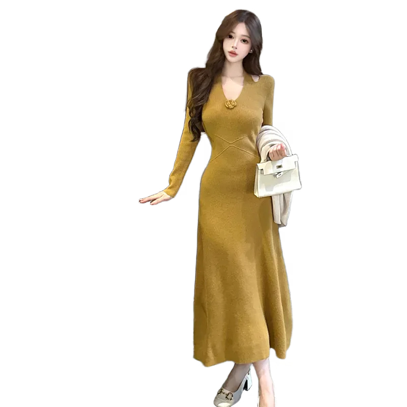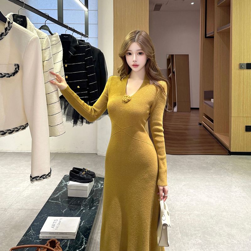 FA46017# 显腰细羊毛挂脖花朵针织连衣裙女冬季新款修身打底长袖A字裙 服裝批發女裝批發服飾貨源