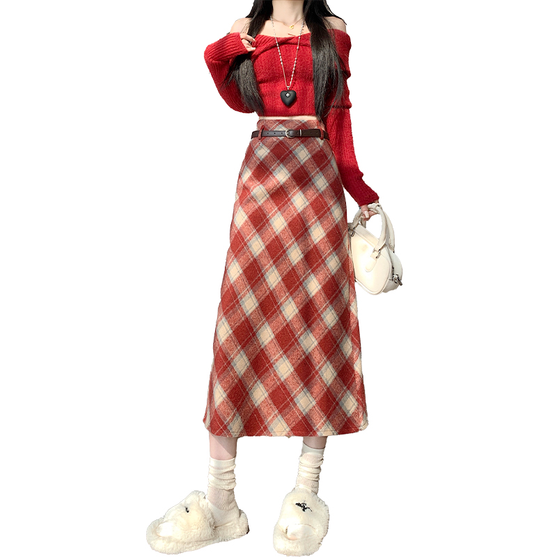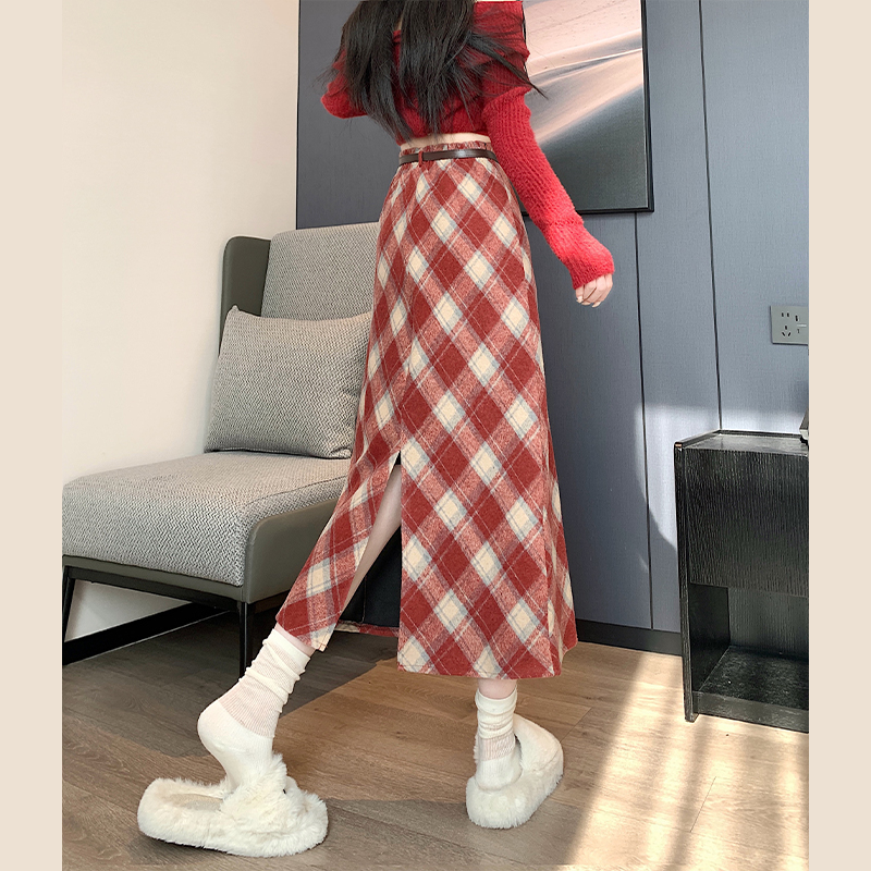 FA46035# 毛呢格子半身裙女秋冬复古高腰显瘦格纹中长款a字一步包臀裙 服裝批發女裝批發服飾貨源