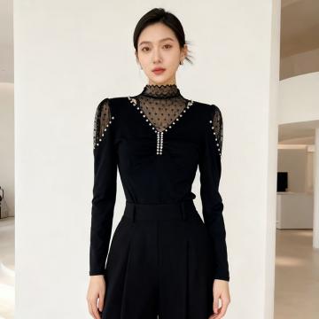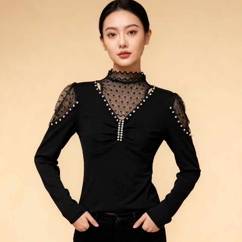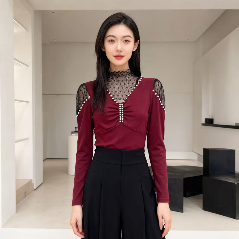 FA46059# 秋冬加厚磨毛原创设计钉钻蕾丝半高领百搭时尚打底小衫长袖 服裝批發女裝批發服飾貨源