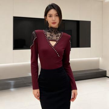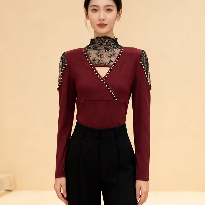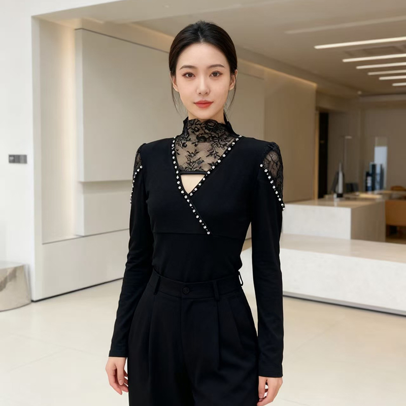 FA46060# 秋冬加厚保暖磨毛钉钻蕾丝半高领百搭时尚打底小衫长袖女上衣 服裝批發女裝批發服飾貨源