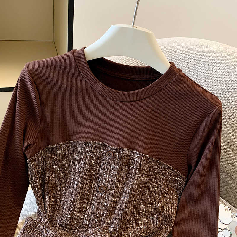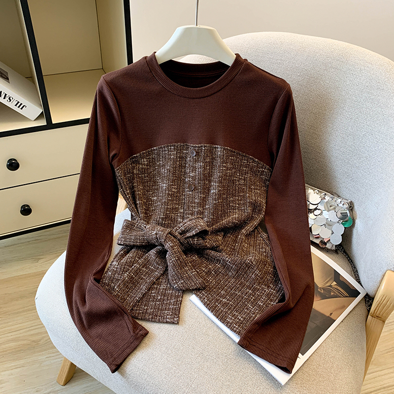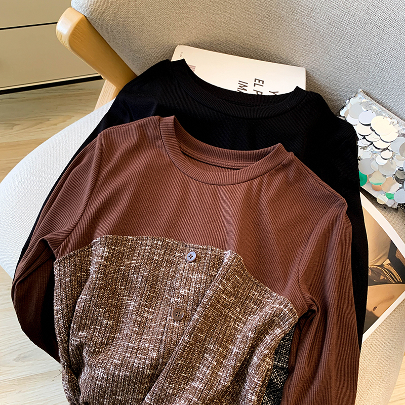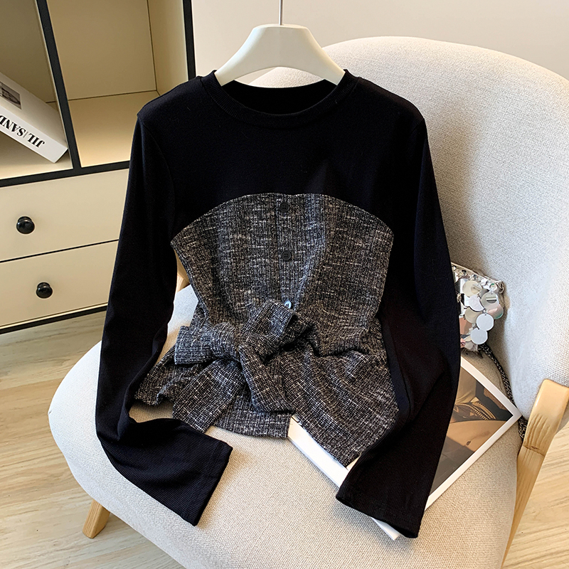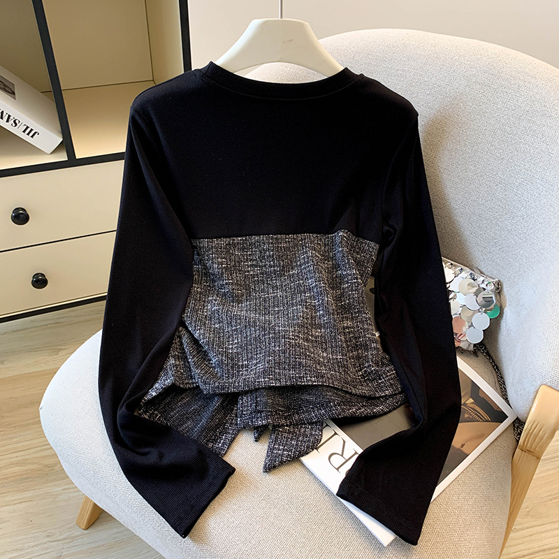 FA46071# 圆领别致设计感百搭长袖T恤女秋季新款法式减龄气质拼接上衣潮 服裝批發女裝批發服飾貨源