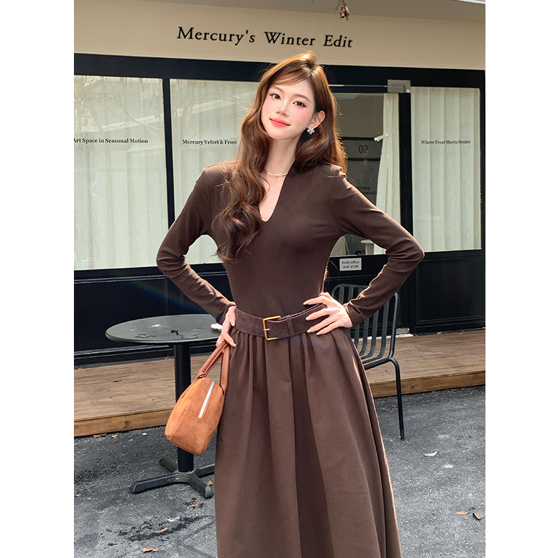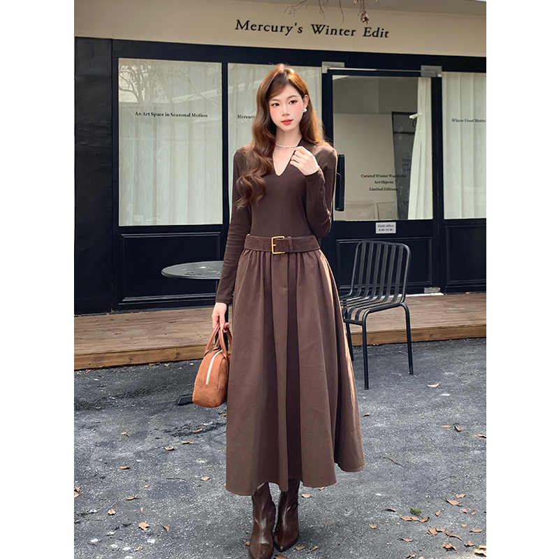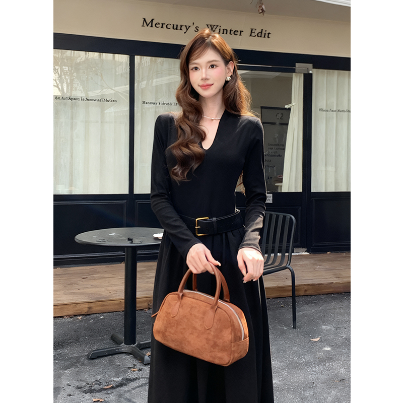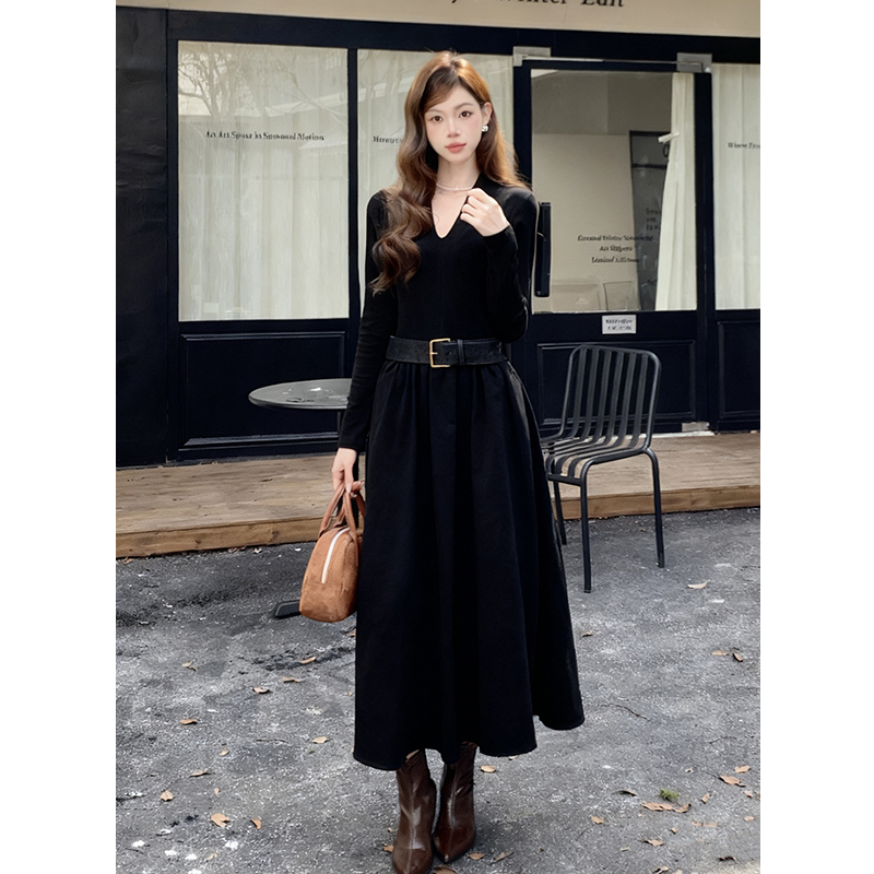 FA46079# 秋冬新款法式优雅拼接打底裙子长袖中长款连衣裙女 服裝批發女裝批發服飾貨源