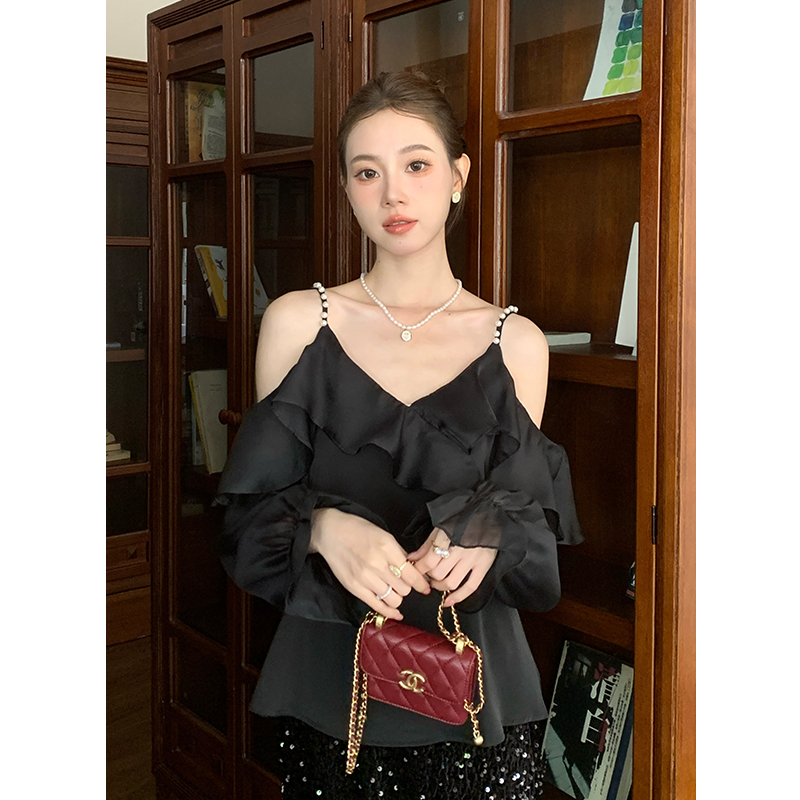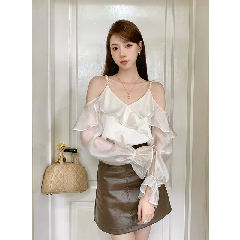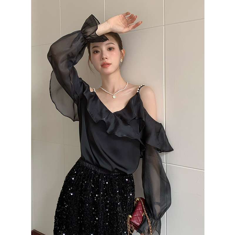 FA46083# 秋季新款纯色钉珠荷叶边喇叭袖上衣长袖雪纺衫女 服裝批發女裝批發服飾貨源