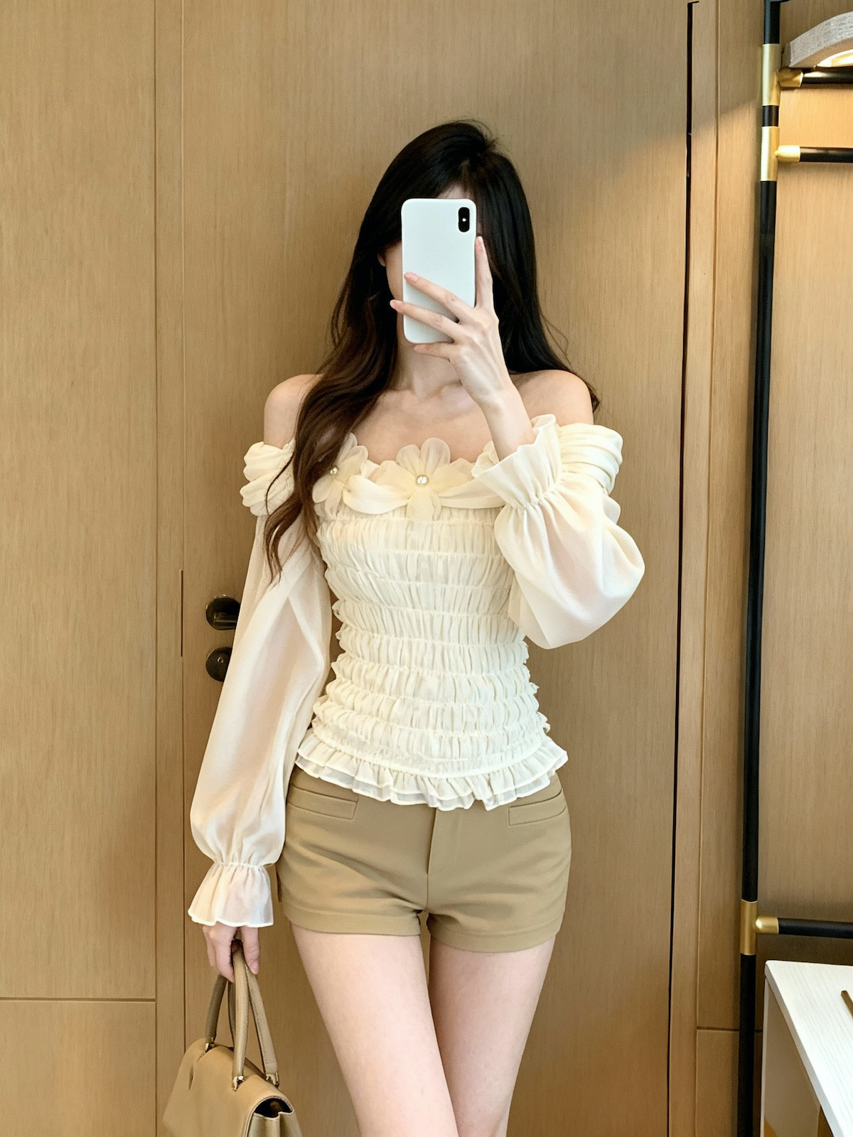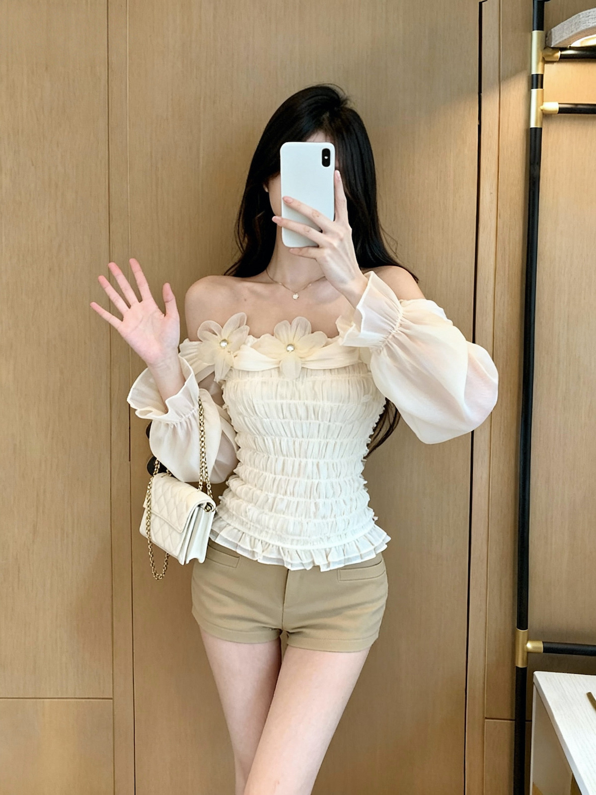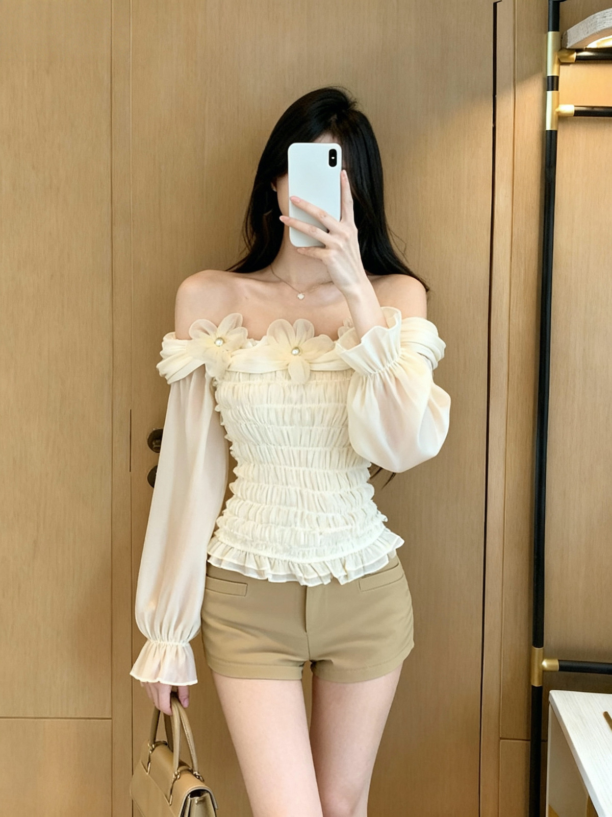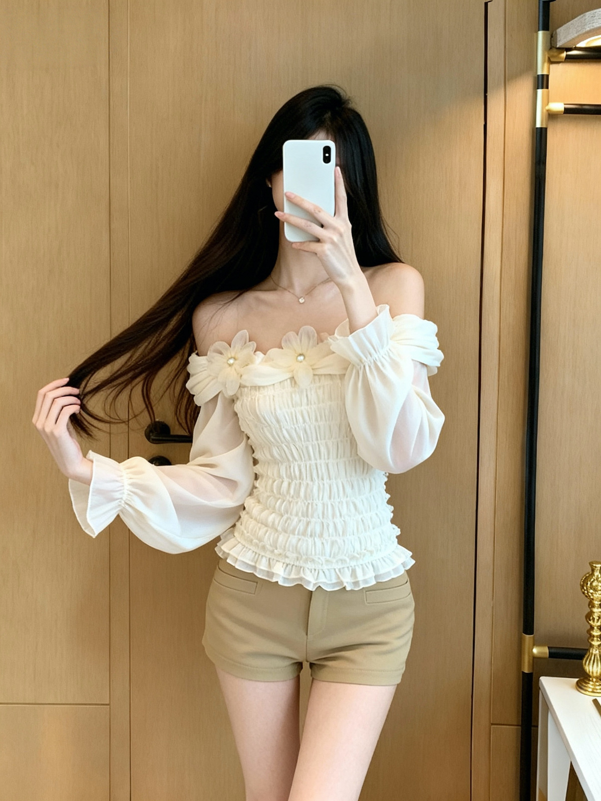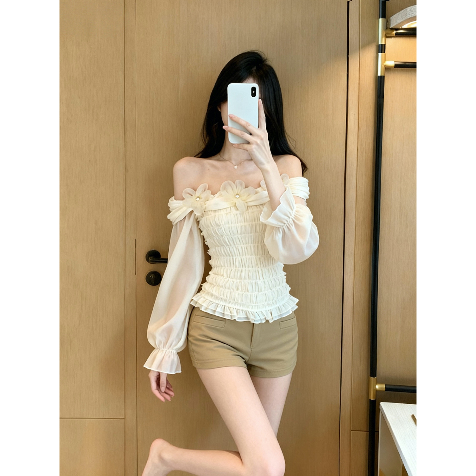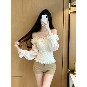 FA46270# 高级感露肩网纱长袖拼接蕾丝上衣女秋修身显瘦法式衬衫 服裝批發女裝批發服飾貨源