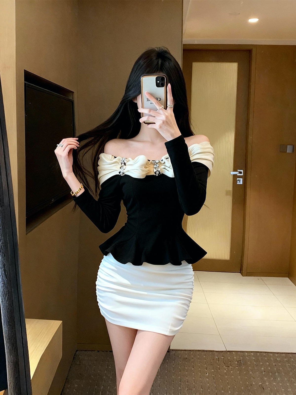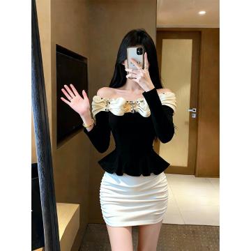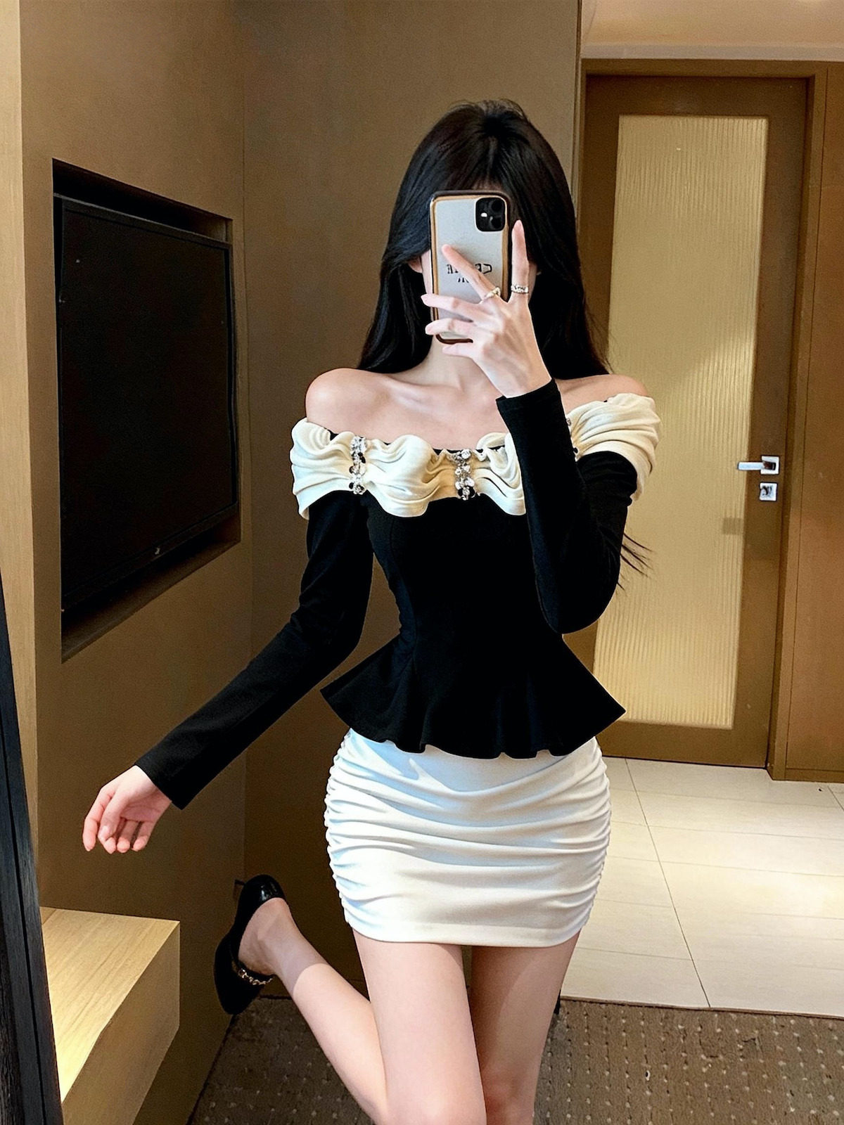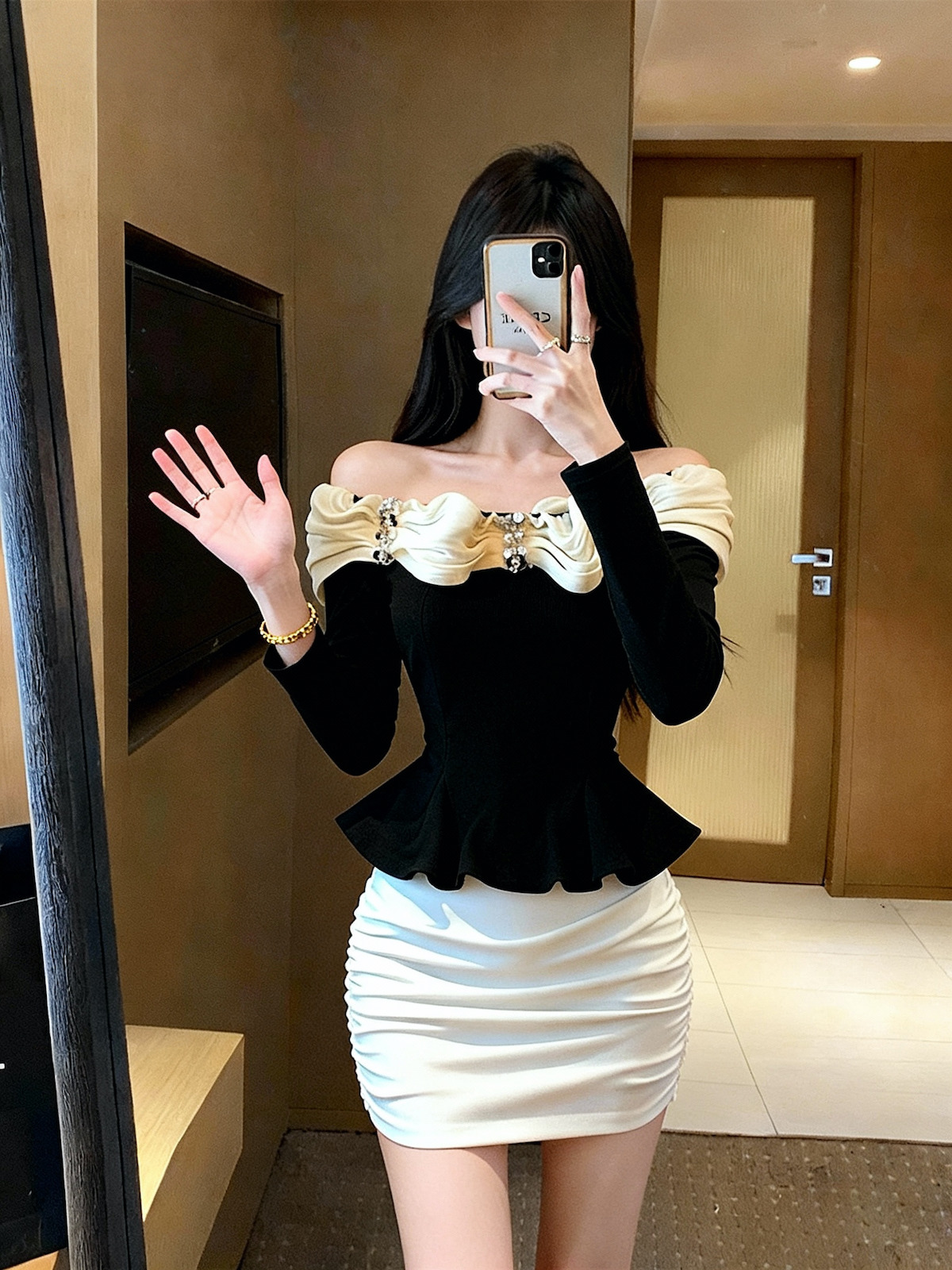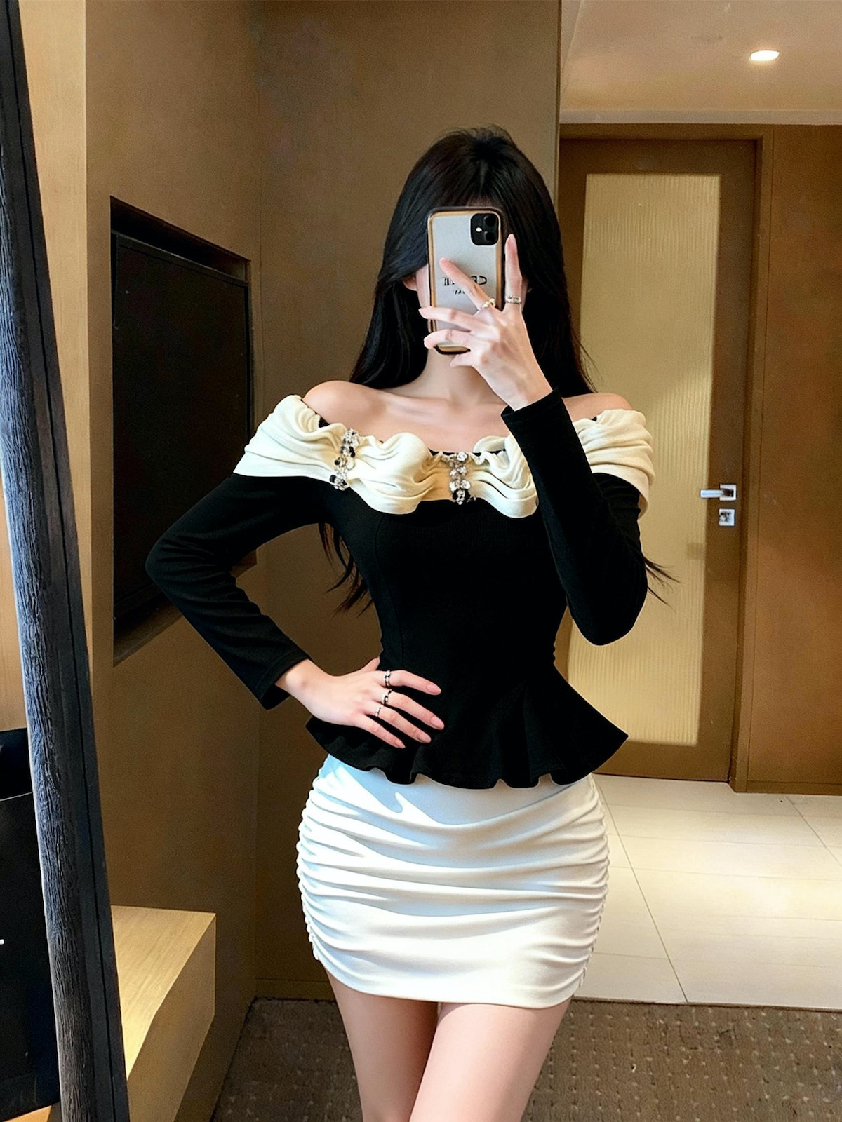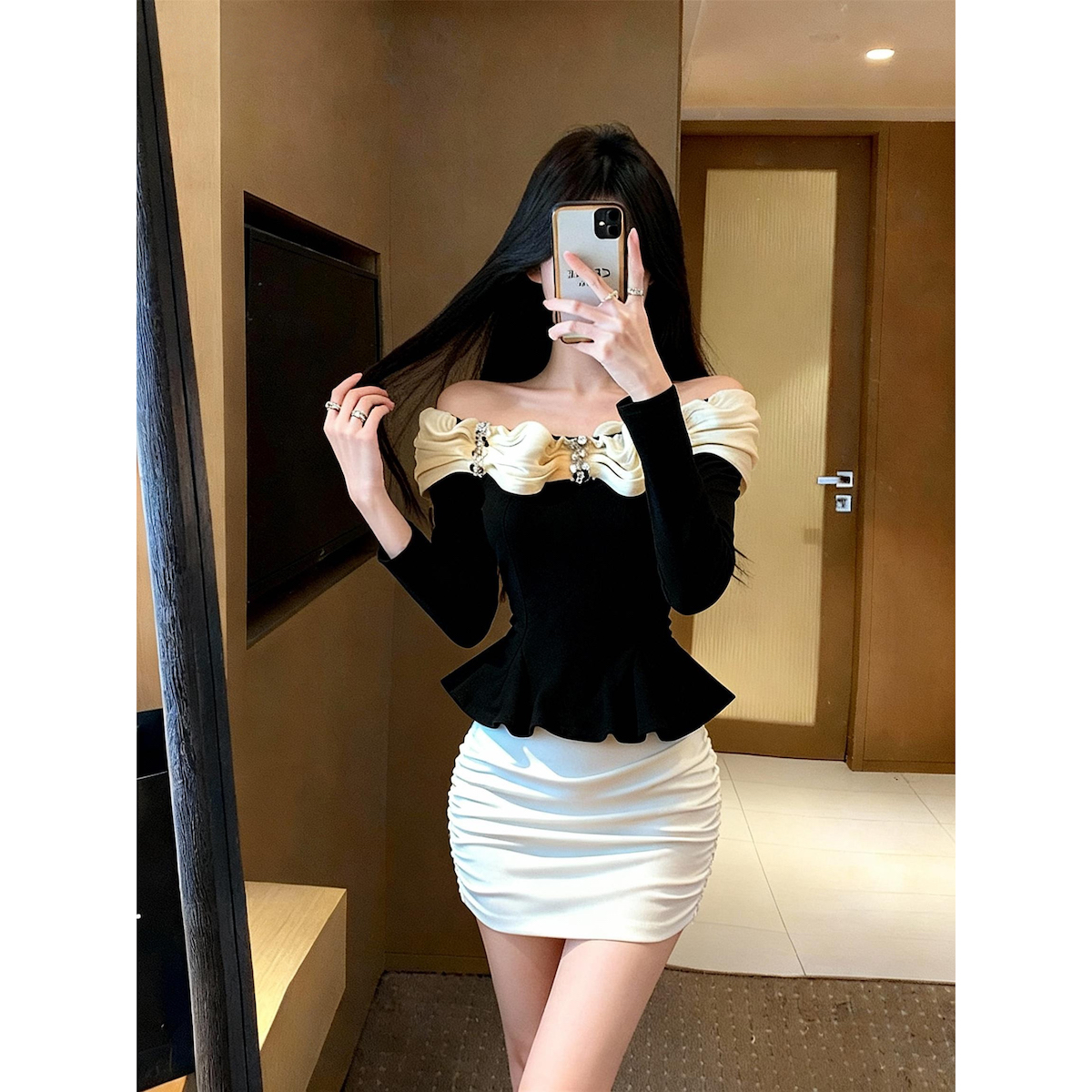 FA46271# 小香风荷叶边长袖t恤女秋冬纯欲一字肩上衣绝美打底衫内搭 服裝批發女裝批發服飾貨源
