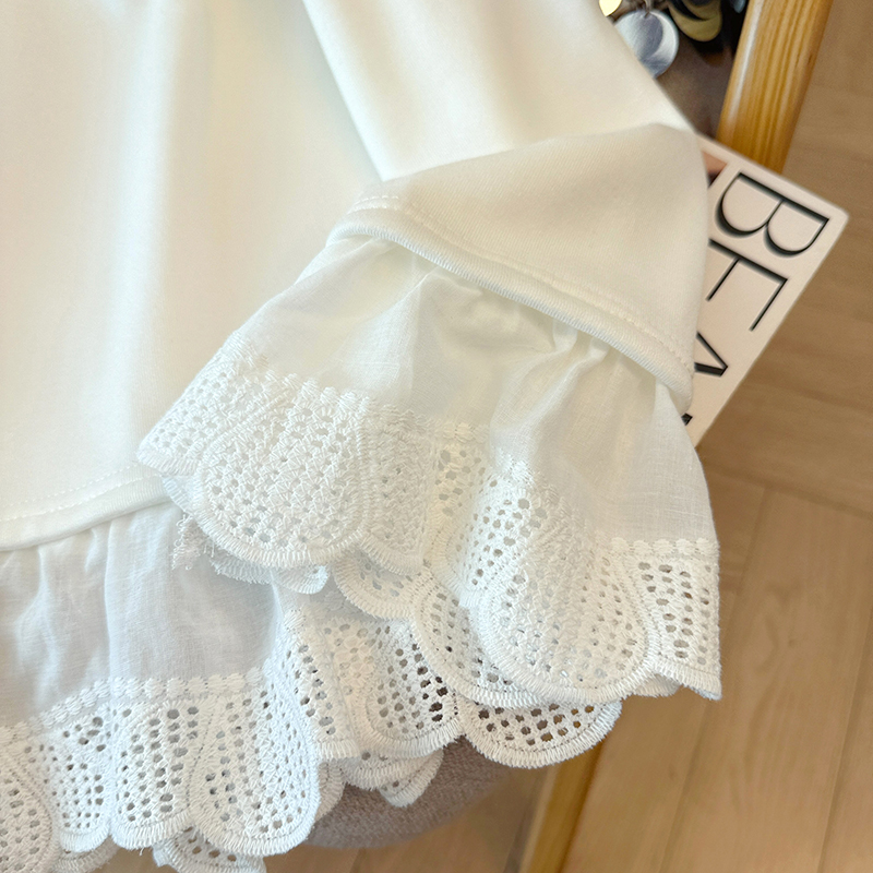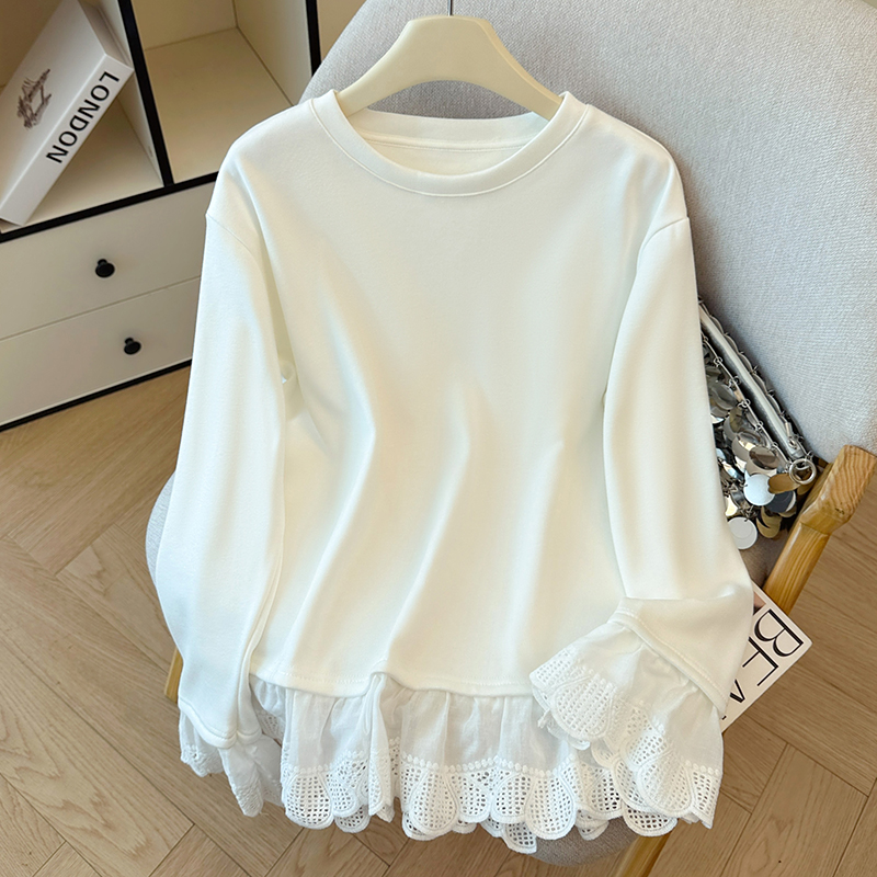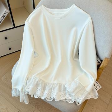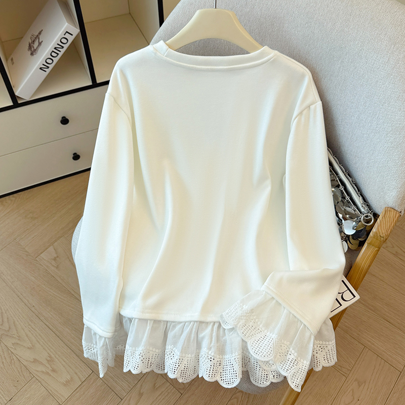 FA46336# 大码白色加厚宝宝绒蕾丝拼接T恤宽松打底外穿长袖上衣 服裝批發女裝批發服飾貨源