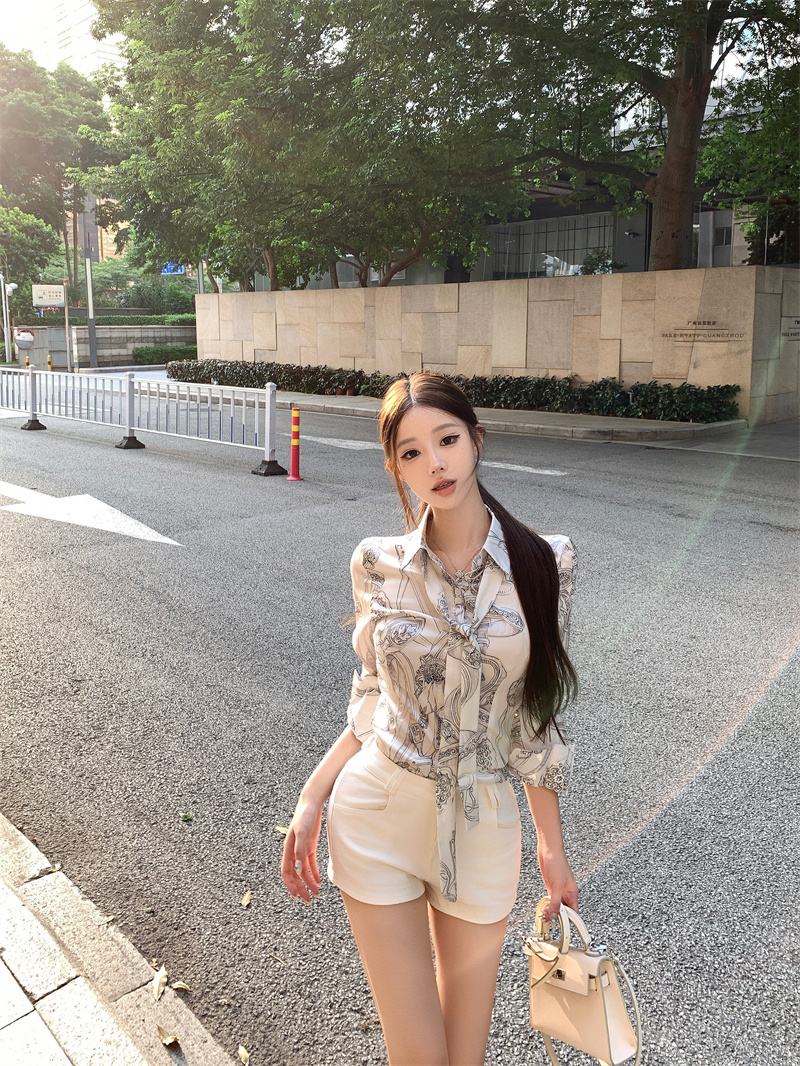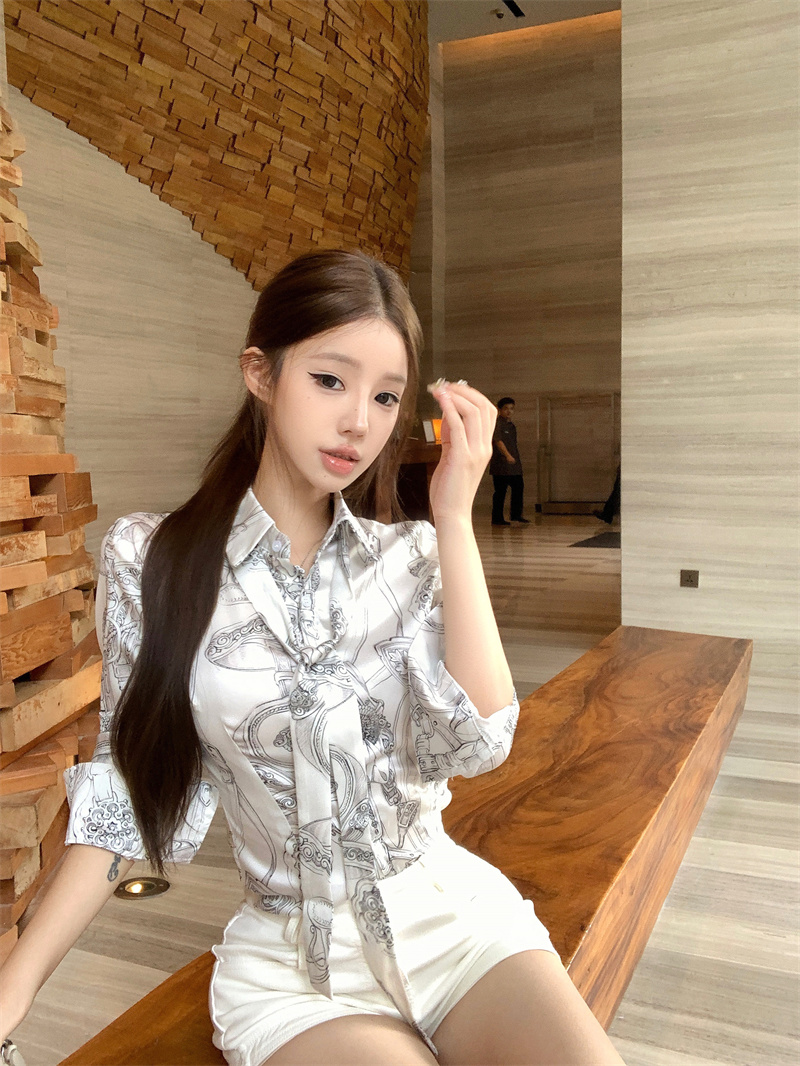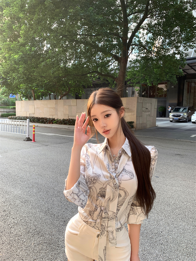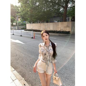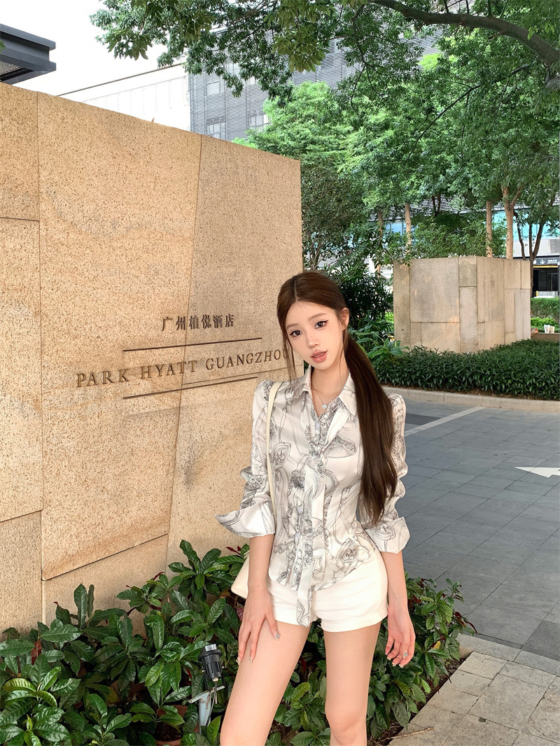 FA46354# 松弛慵懒随性时髦宽松老钱复古印花衬衫缎面上衣 服裝批發女裝批發服飾貨源