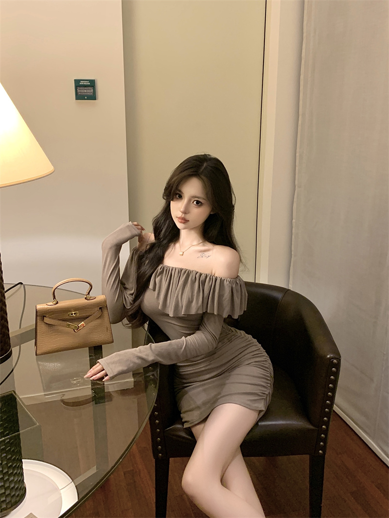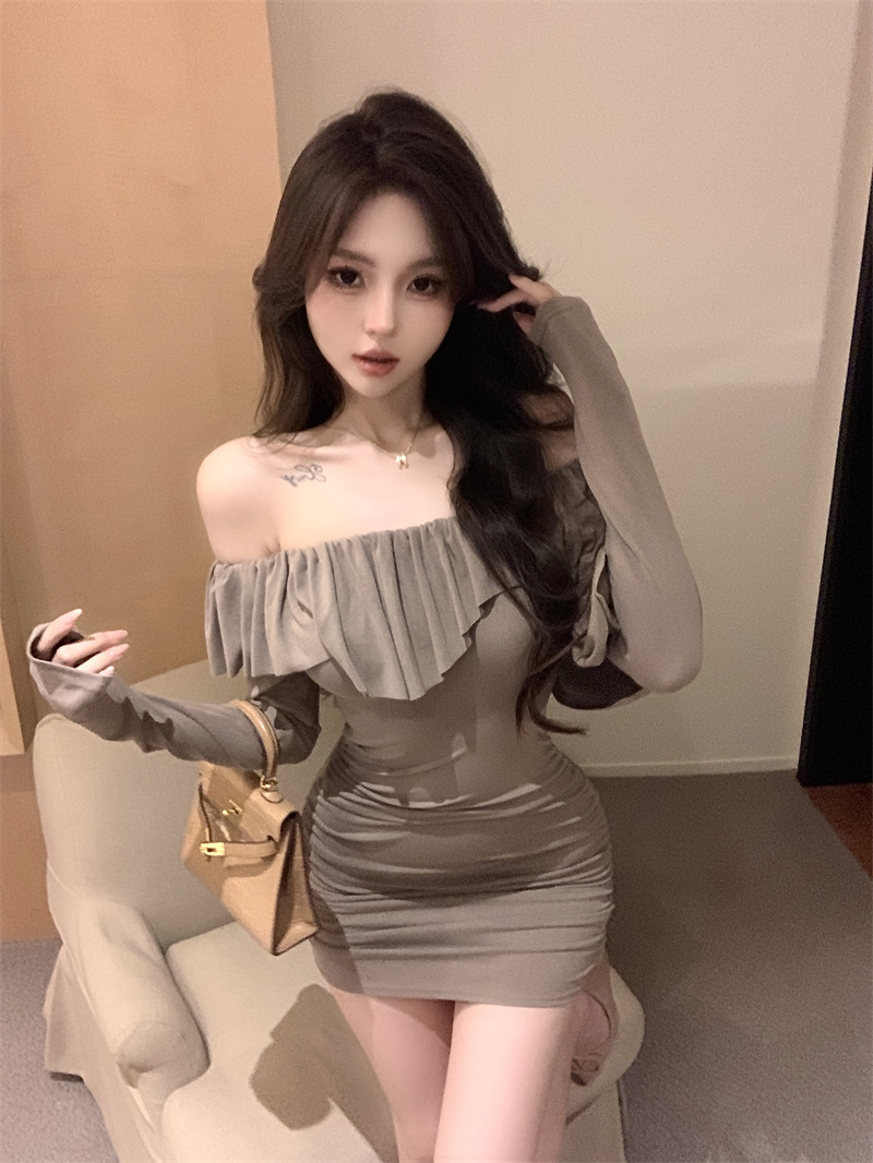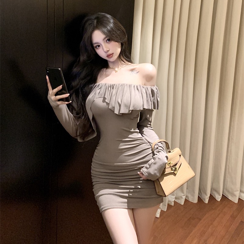 FA46359# 纯欲风小心机一字肩荷叶边长袖高腰褶皱包臀修身连衣裙 服裝批發女裝批發服飾貨源