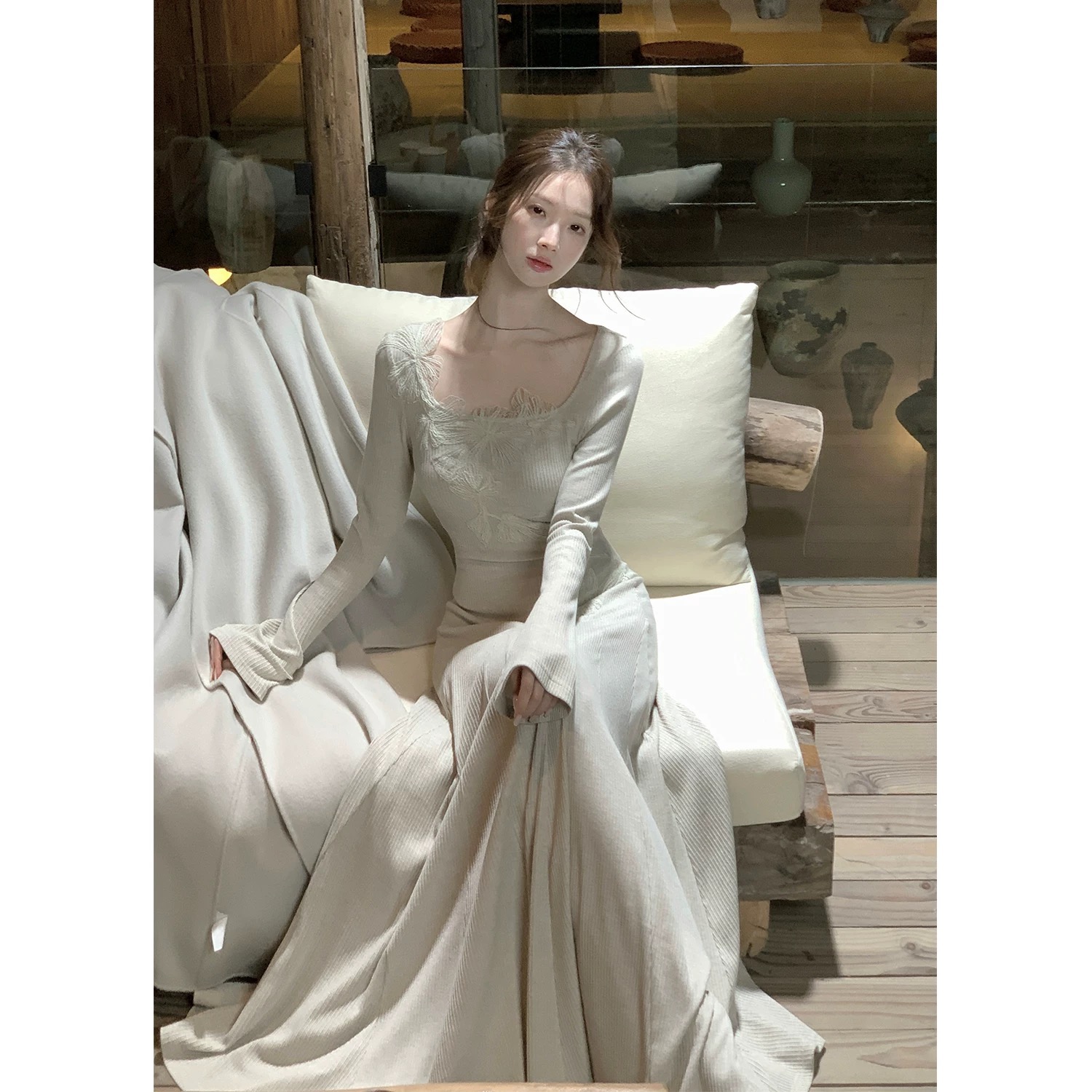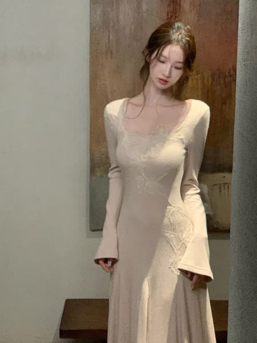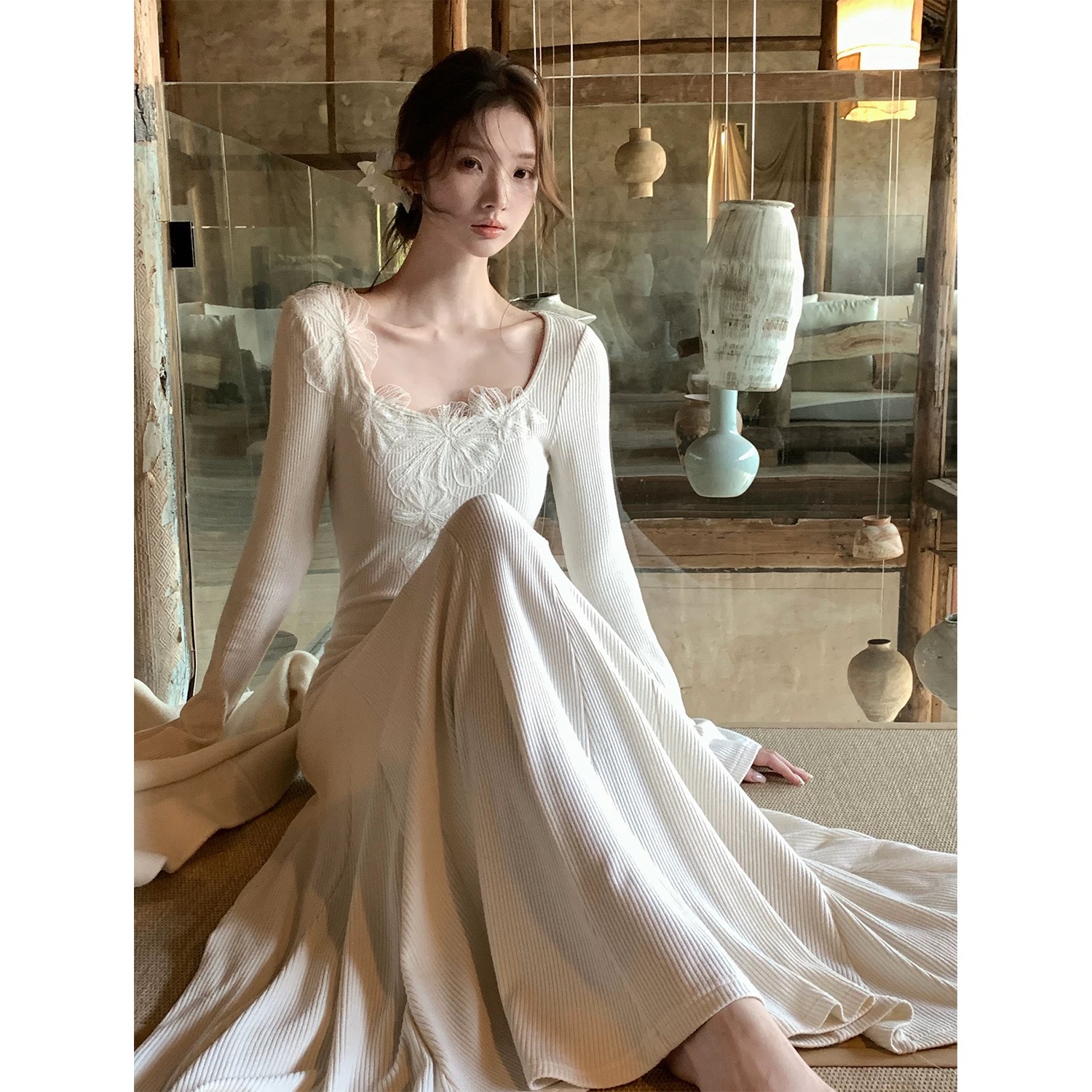 FA46362# 从一时刻与花叙优雅方领喇叭袖连衣裙立体绣花插片大摆针织裙 服裝批發女裝批發服飾貨源