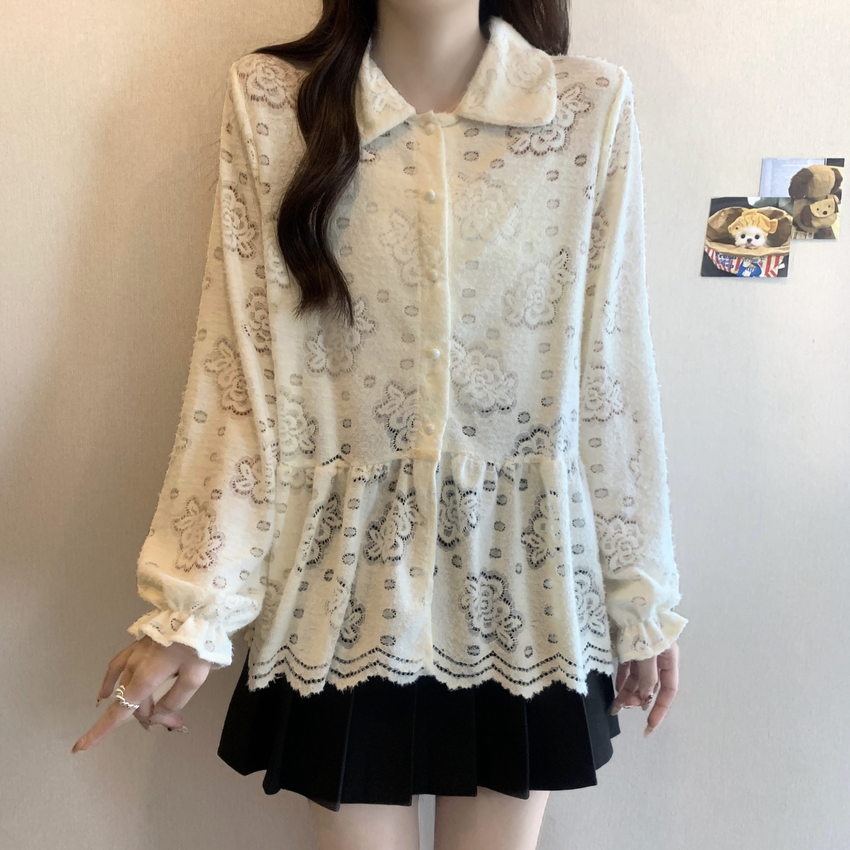 FA46385# 大码秋季新款蕾丝长袖针织衬衫女娃娃领百搭宽松上衣 服裝批發女裝批發服飾貨源
