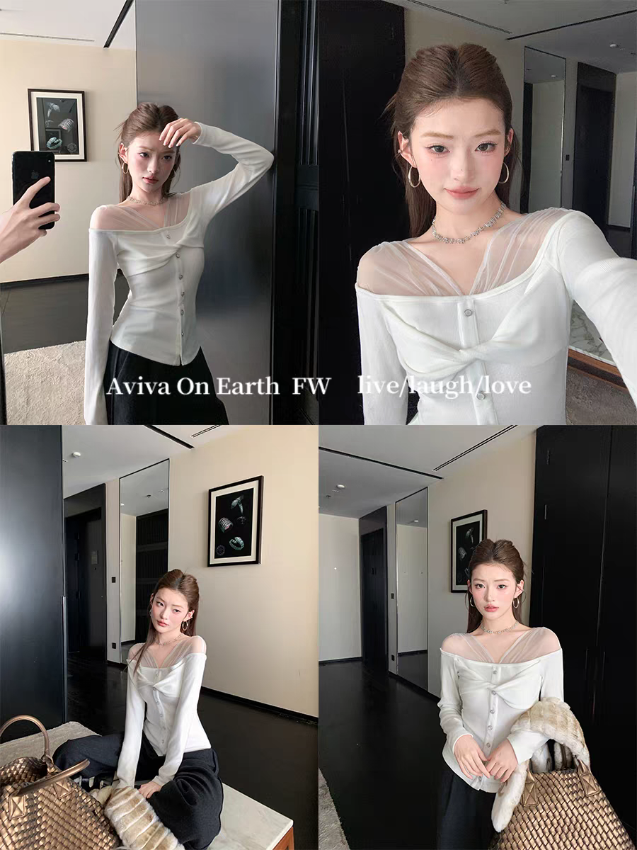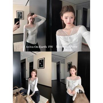 FA46409# 地球店纯欲风修身显瘦收腰长袖上衣女秋季网纱拼接设计感百搭T恤 服裝批發女裝批發服飾貨源