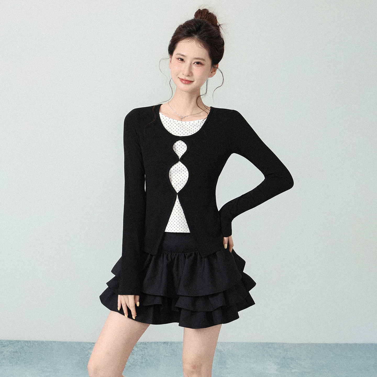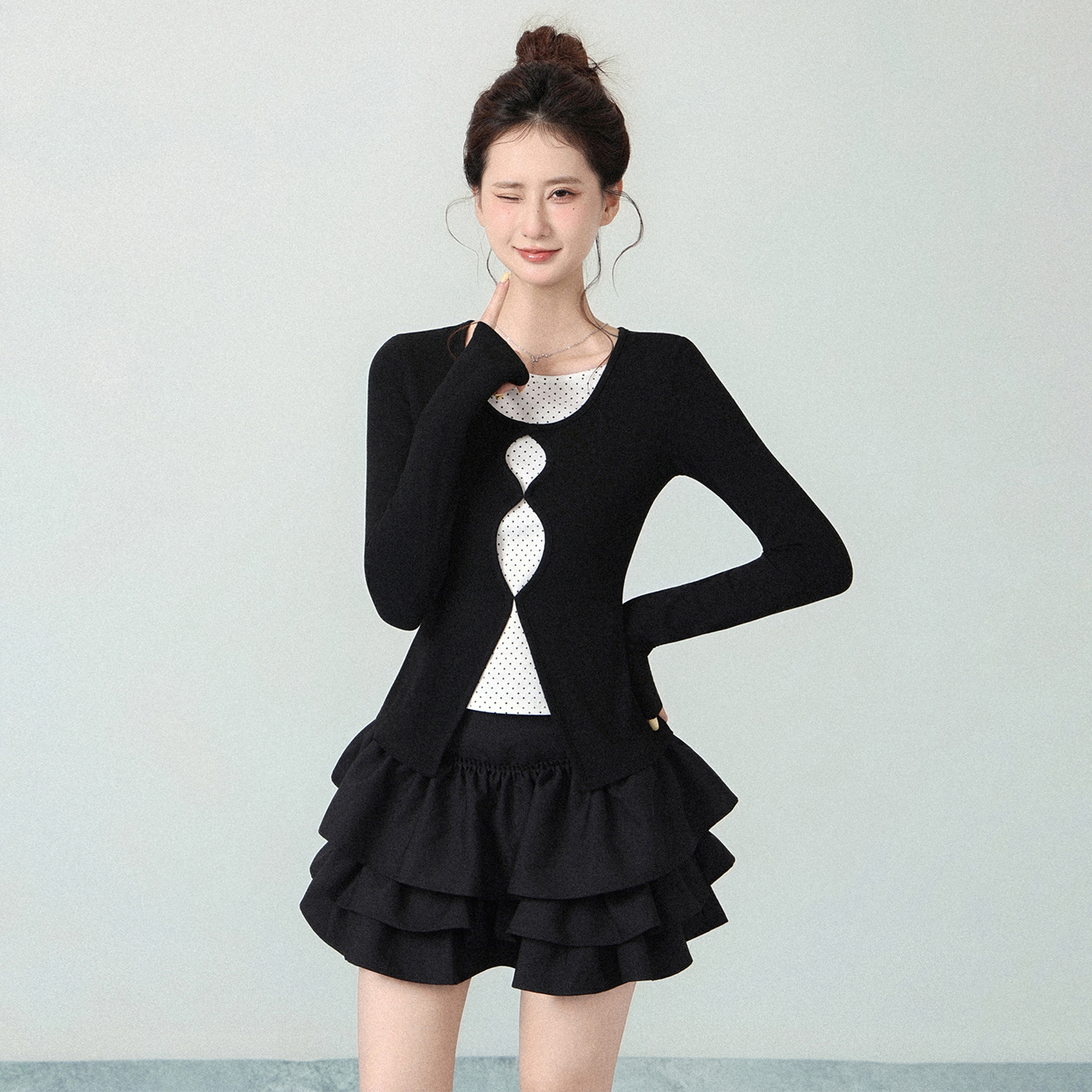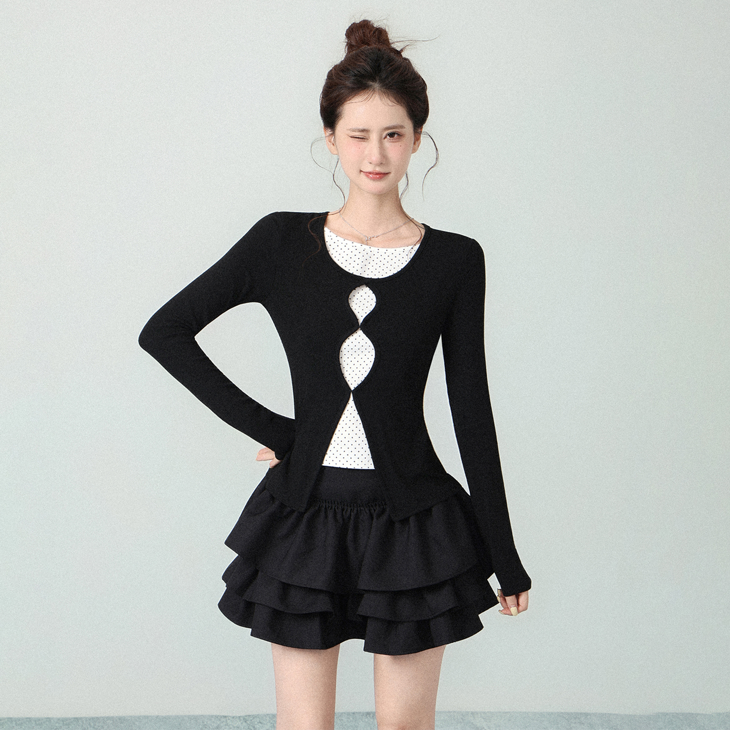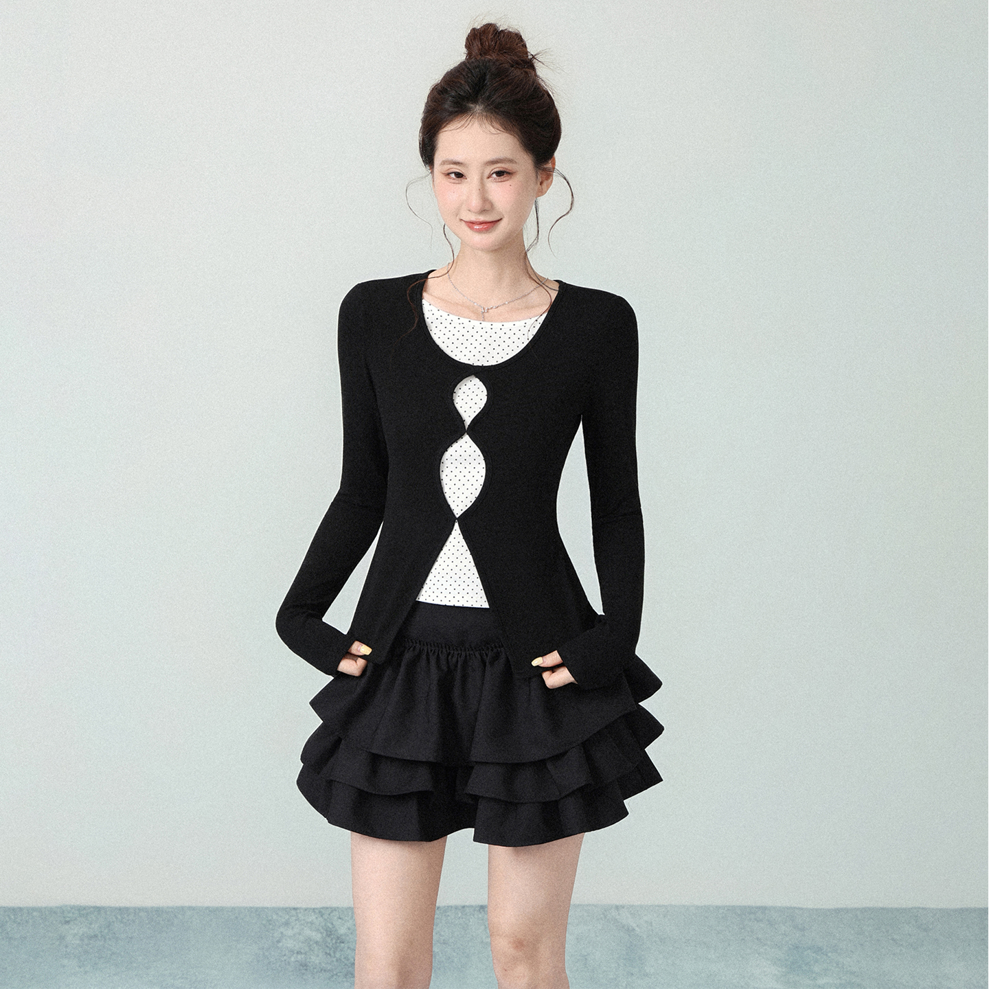 FA46426# 拼接假两件长袖针织衫女秋季新款修身内搭波点打底衫上衣 服裝批發女裝批發服飾貨源
