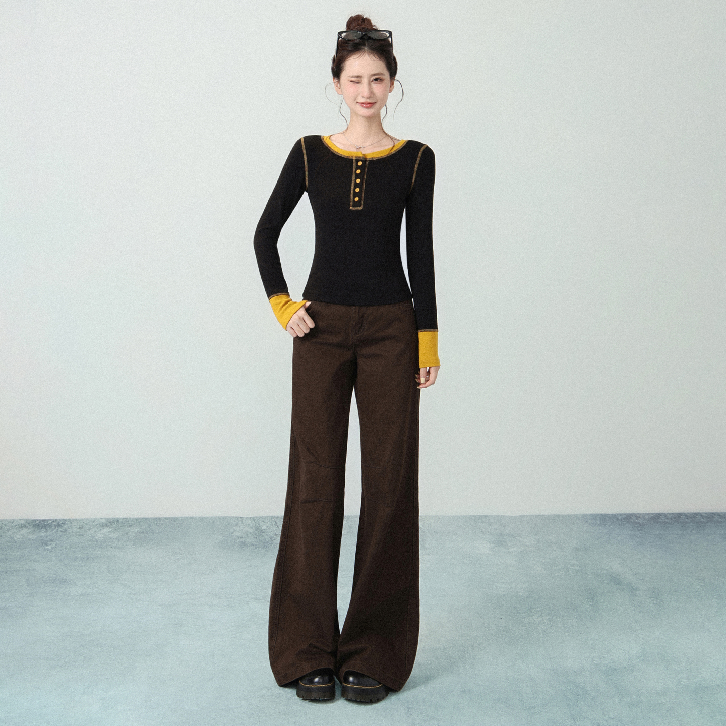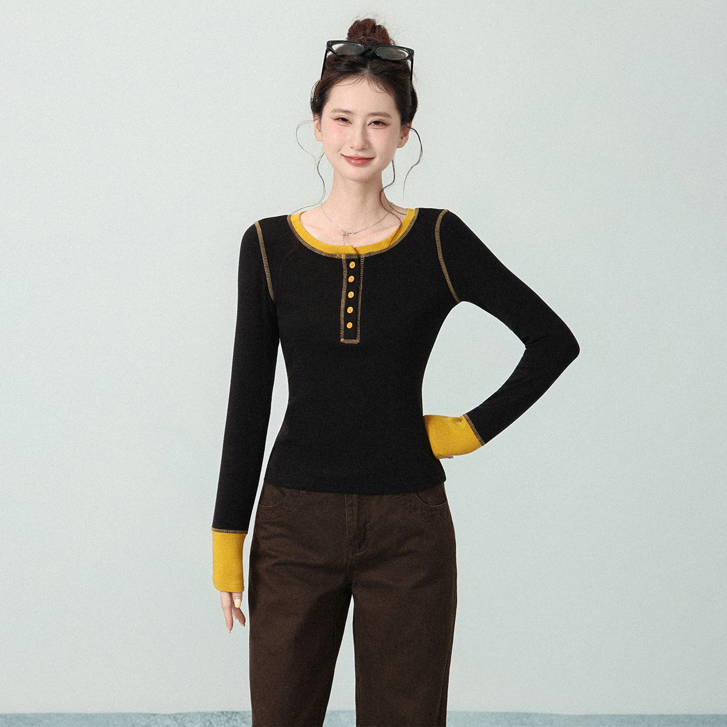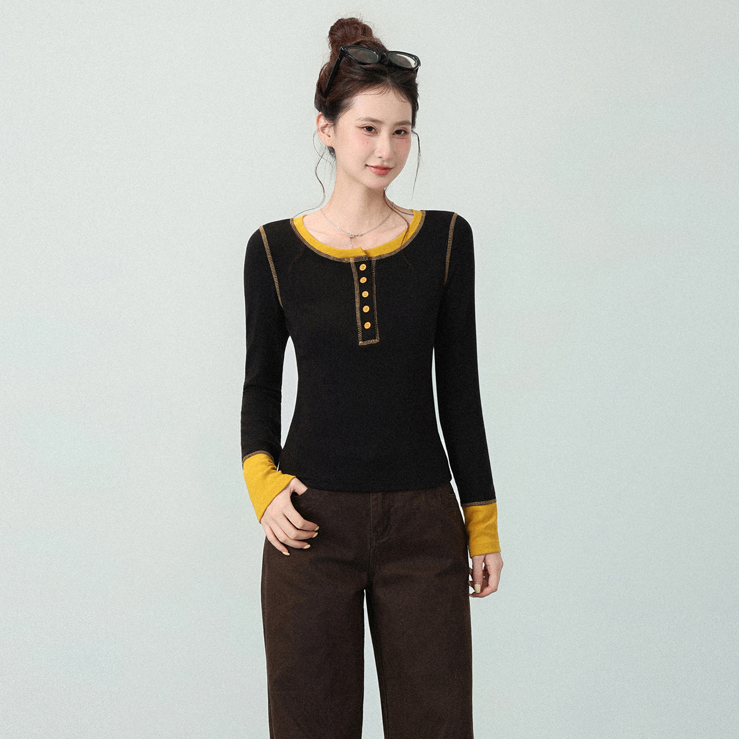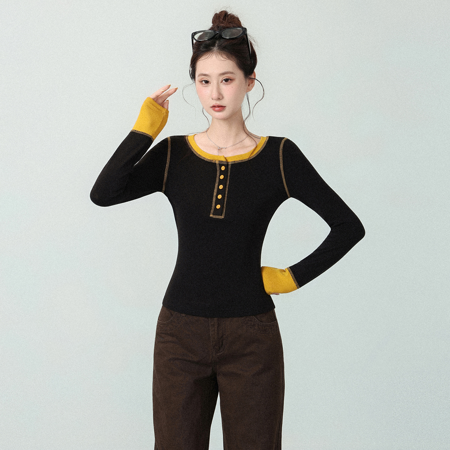 FA46427# 设计感黑色圆领拼接长袖T恤女秋季高级收腰修身上衣 服裝批發女裝批發服飾貨源