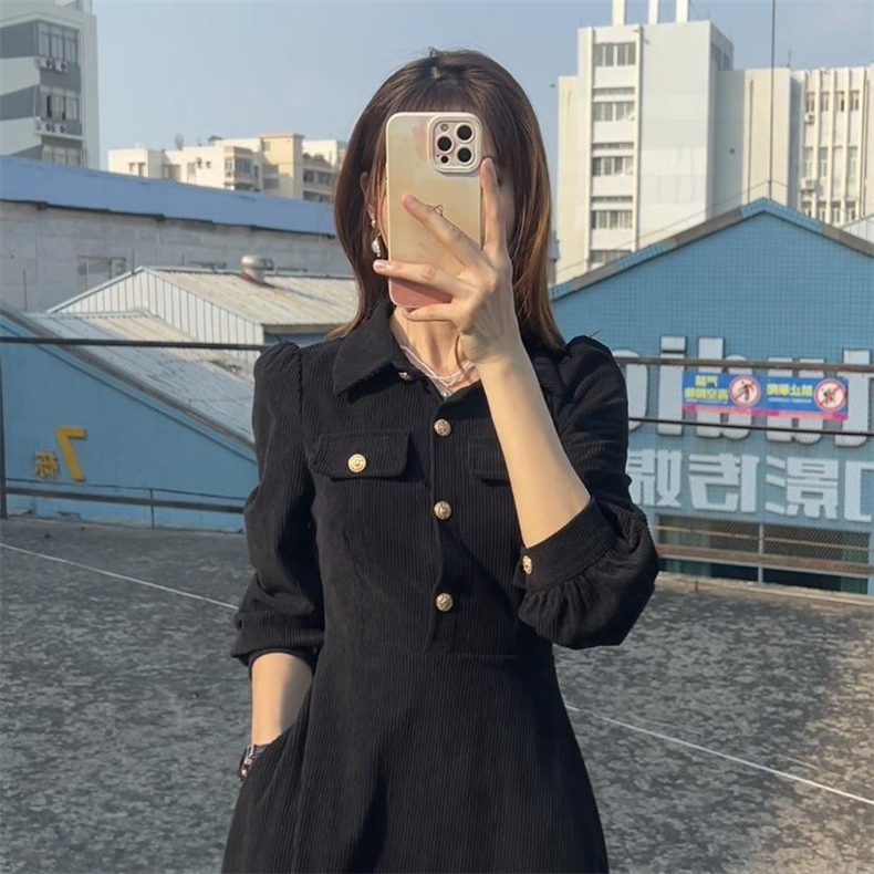 FA46438# 大码赫本风茶歇法式灯芯绒长袖连衣裙 服裝批發女裝批發服飾貨源