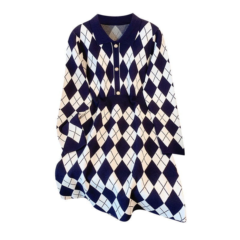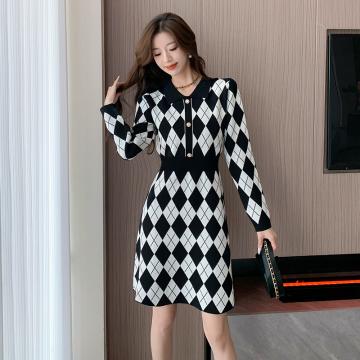 FA46479# 秋冬新款小香风POLO领格子针织连衣裙女气质名媛通勤毛衣裙