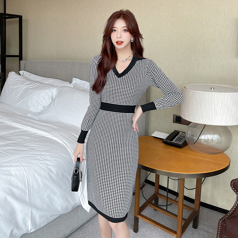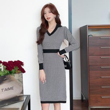 FA46482# 格子针织连衣裙女秋冬修身收腰V领内搭中长款过膝毛衣裙