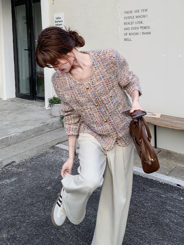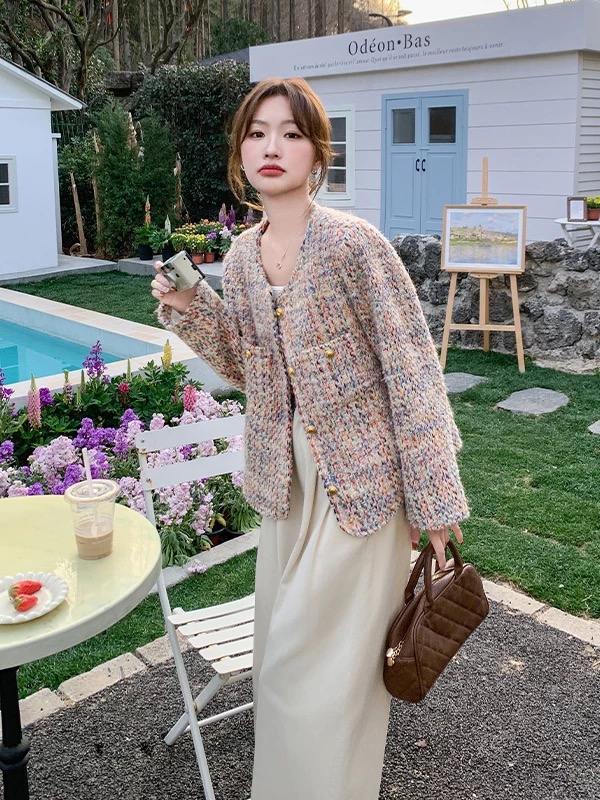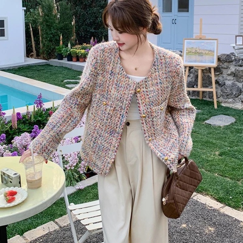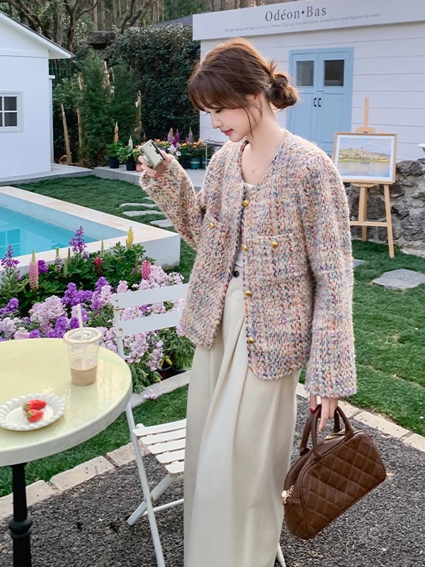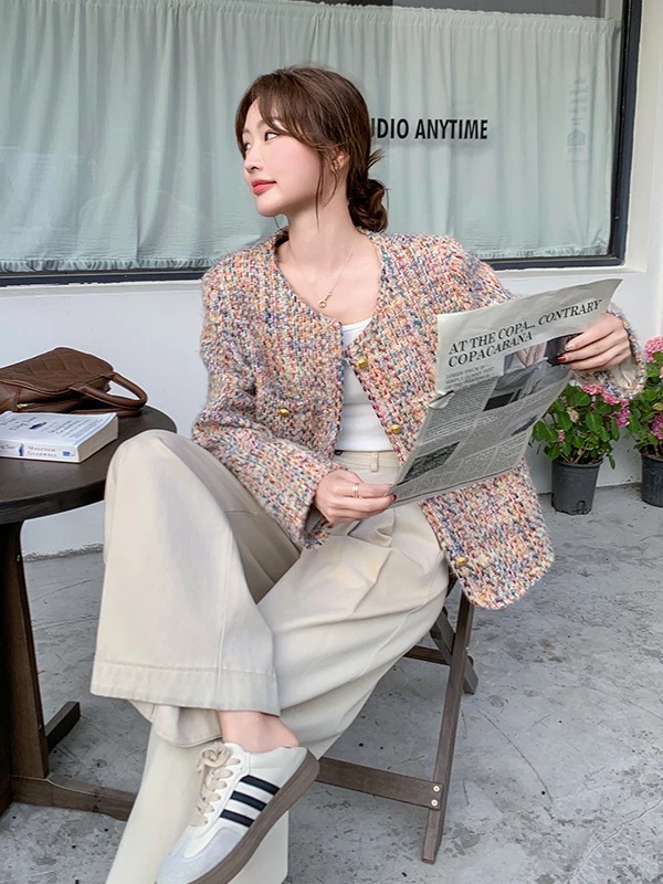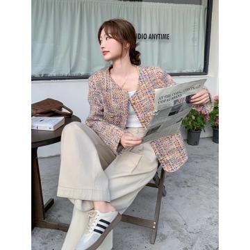 FA46511# 彩色粗花呢女春秋冬上衣新款法式气质休闲百搭加厚短款外套
