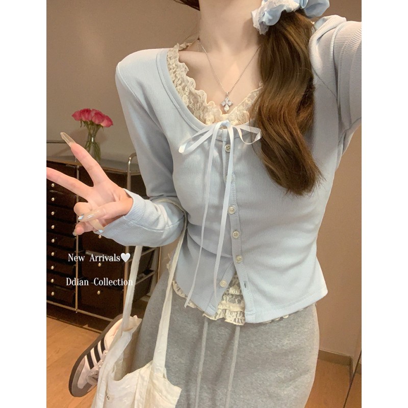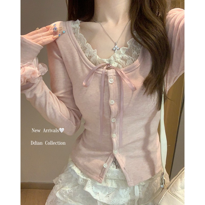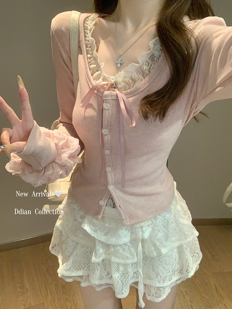 FA46575# 假两件粉色蕾丝拼接长袖T恤女内搭打底衫上衣