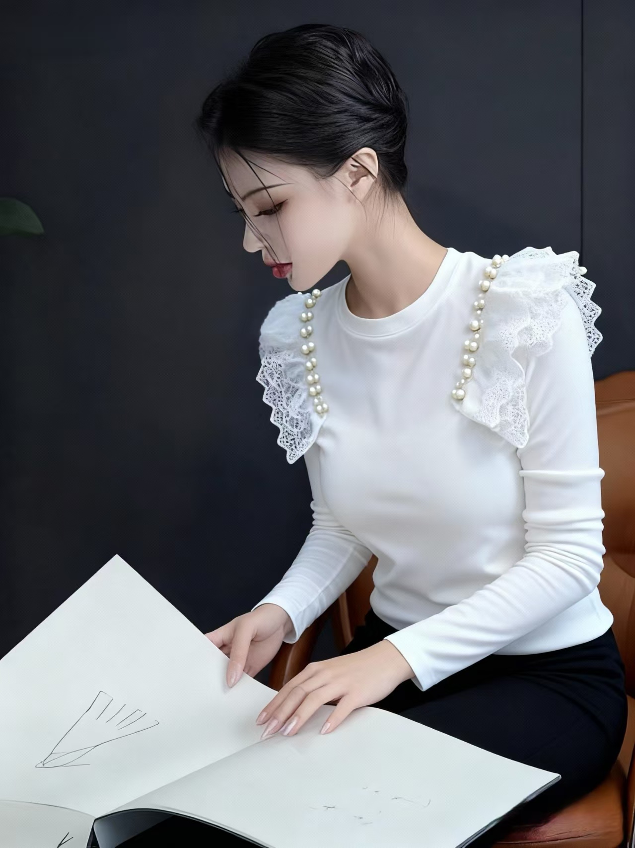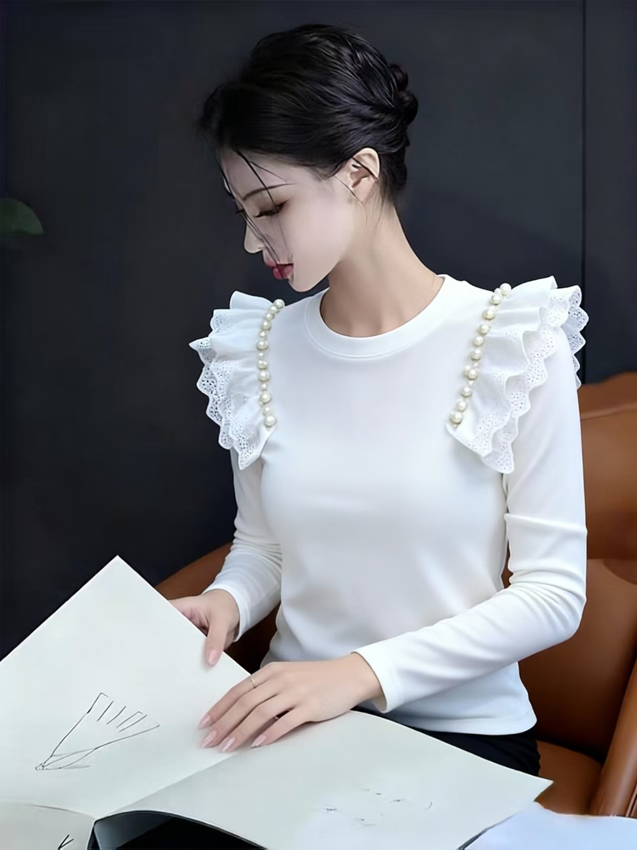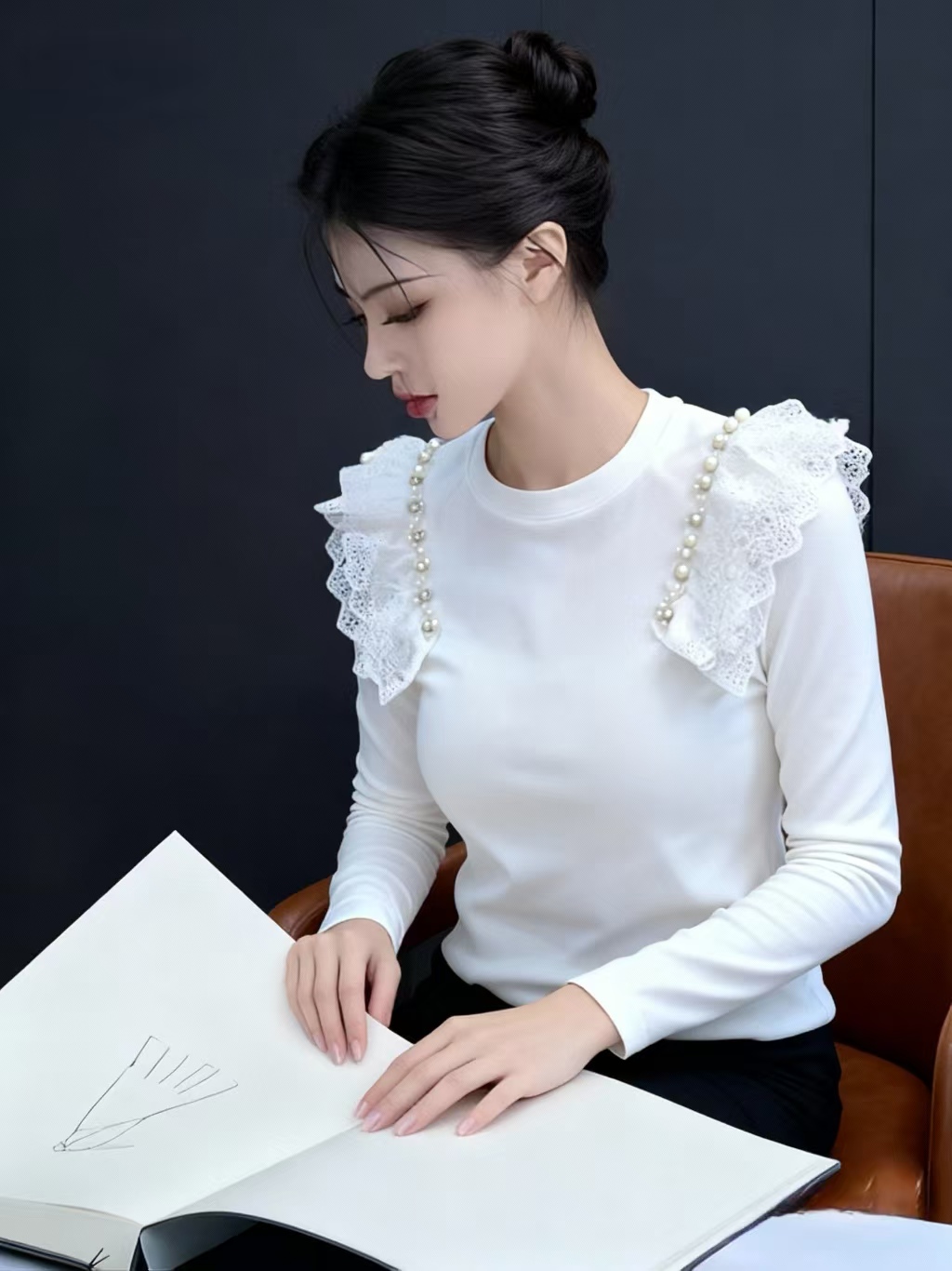 FA46602# 蕾丝拼接重工钉珠镶钻长袖T恤女秋装款打底显瘦百搭洋气上衣女