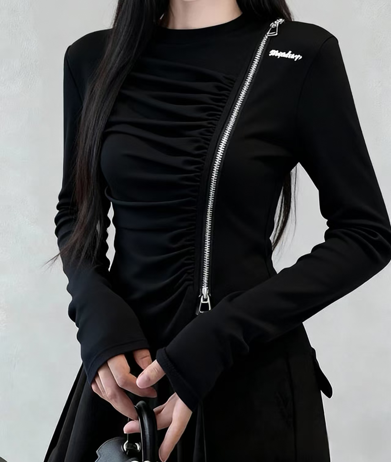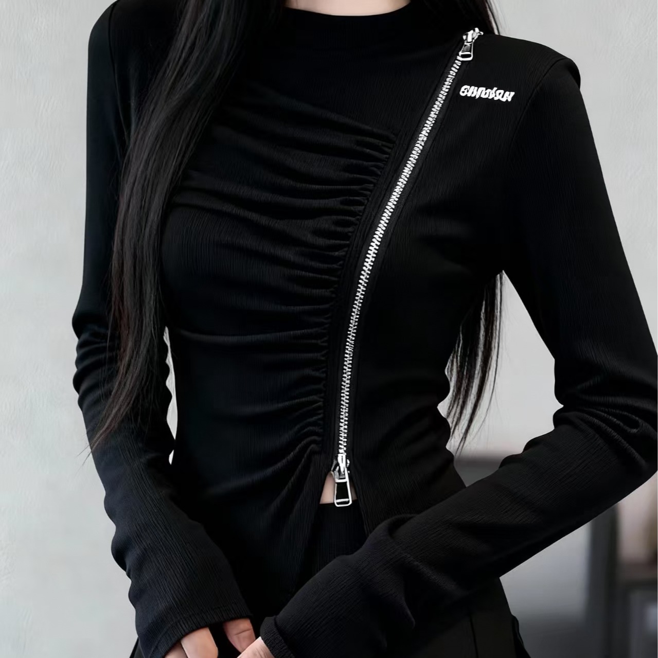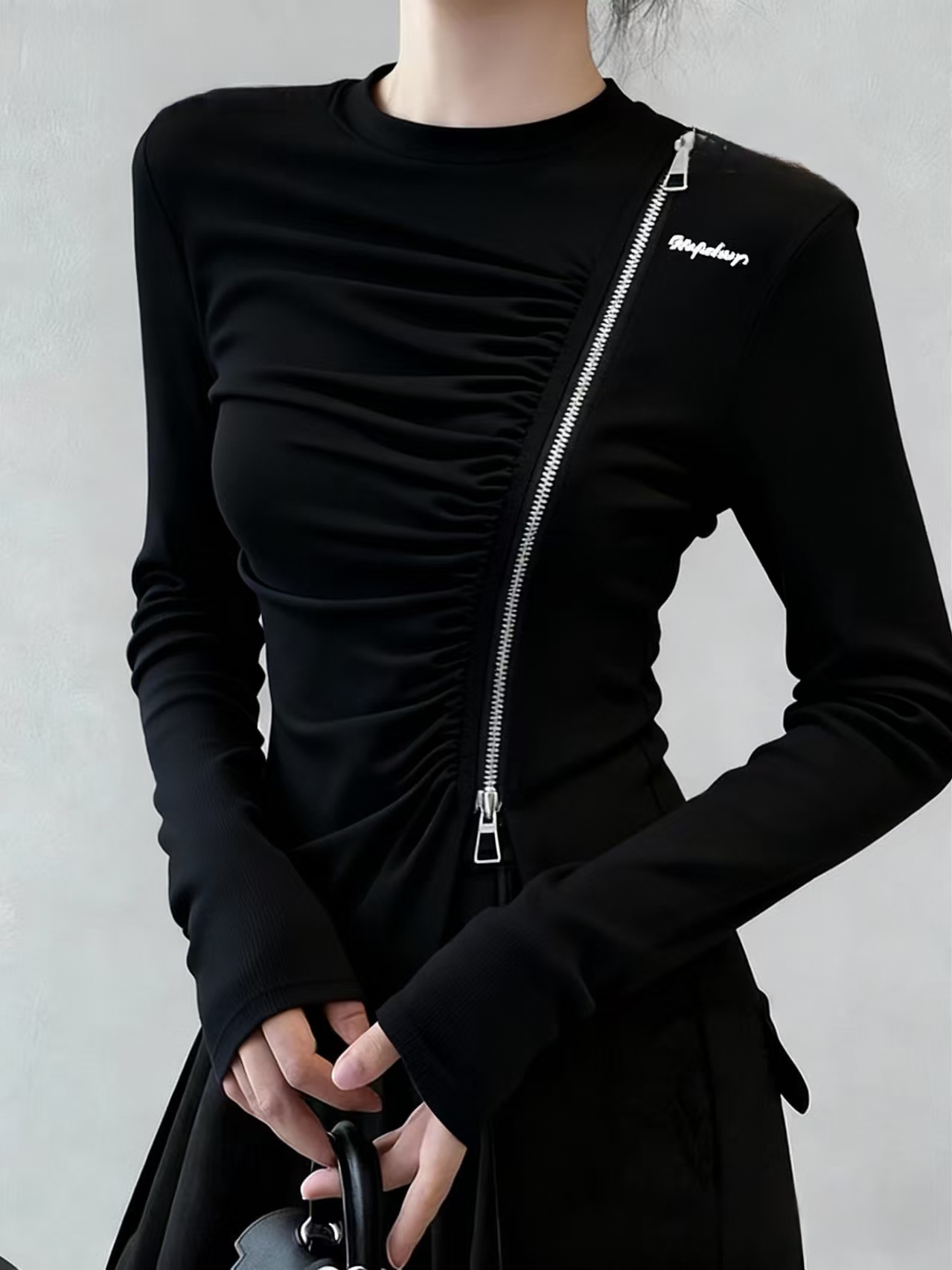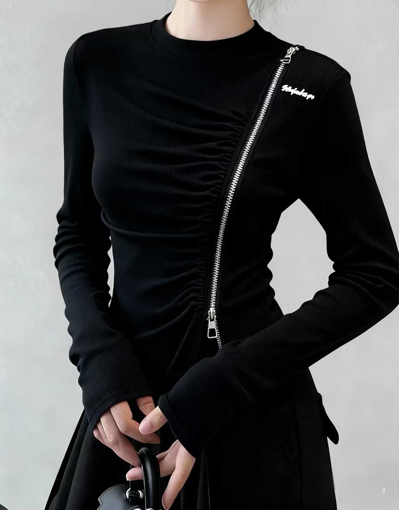 FA46603# 不规则开叉斜方双拉链长袖T恤秋冬新款正肩褶皱收腰显瘦上衣